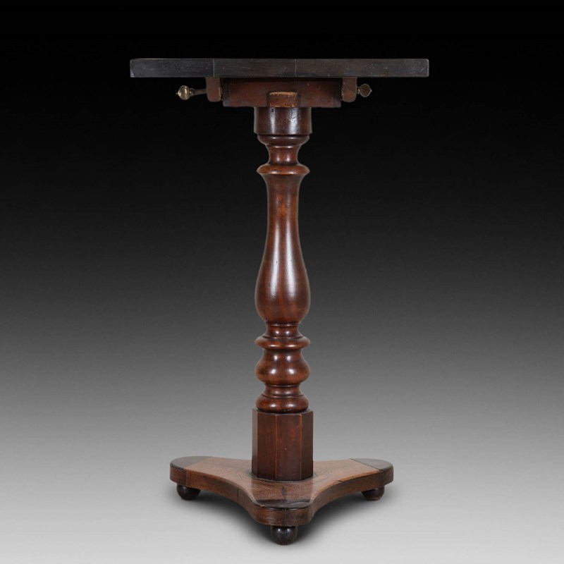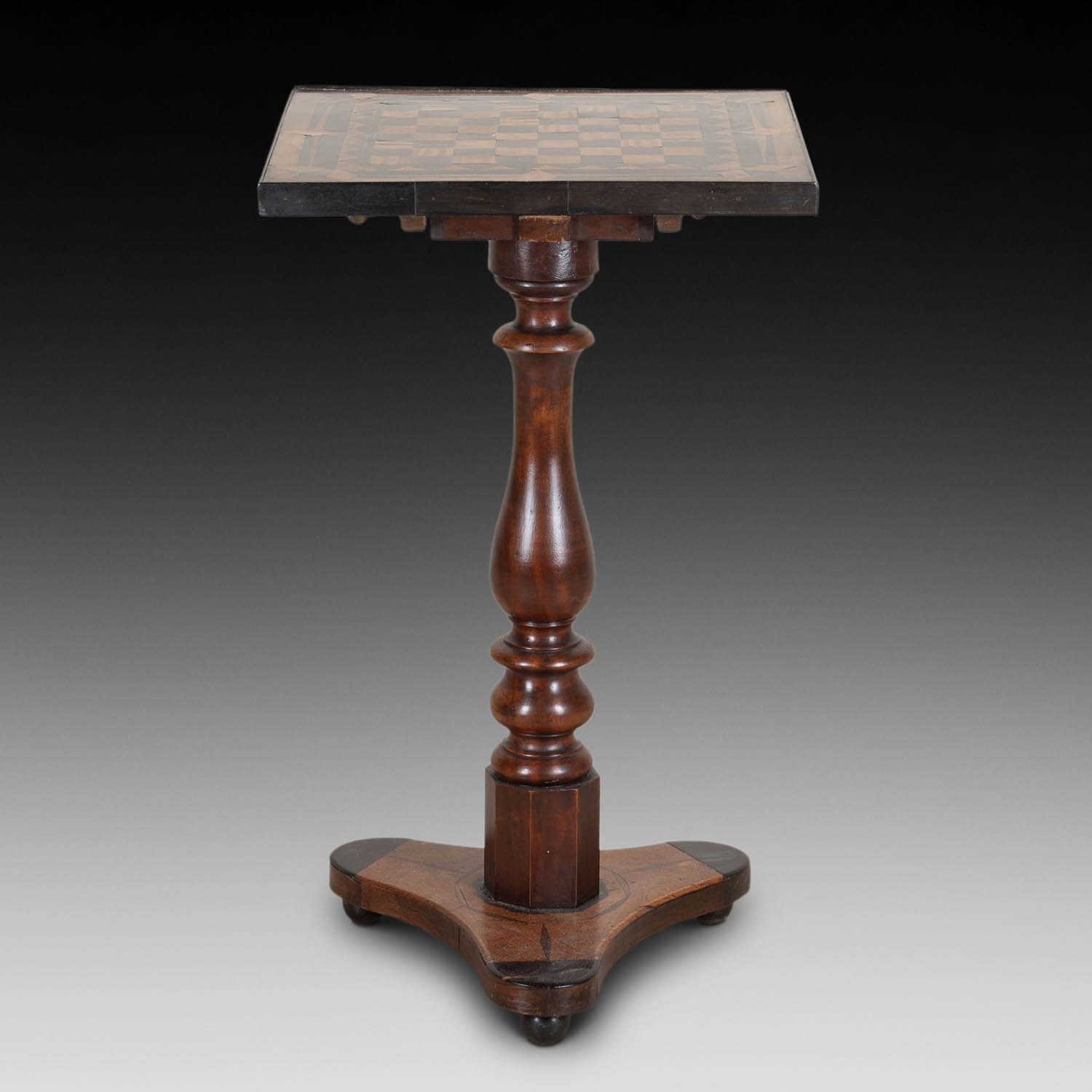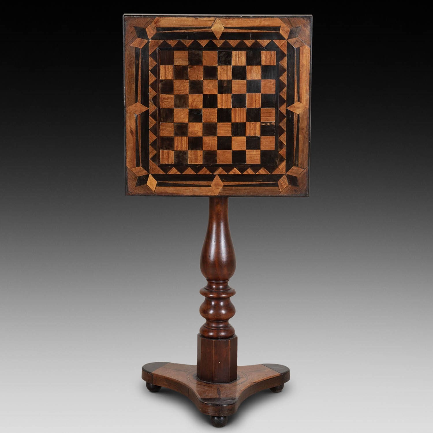 Standing on an elegant turned pillar with an inlaid base, the games top has a variety of woods and inlays making up the game’s board and the surrounding boarder. All resulting in a lovely late Georgian games or side table.