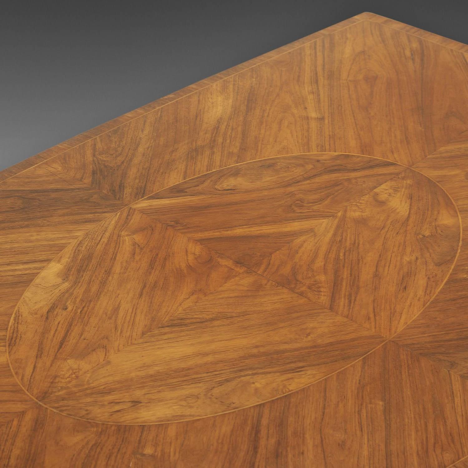 This beautiful piece has quality veneers on an oval inlay decoration to its shaped top. With four long working drawers that provide ample storage and are decorated with their original brass ring handles. The piece stands well on its original swept feet. All resulting in a beautiful yet practical piece.