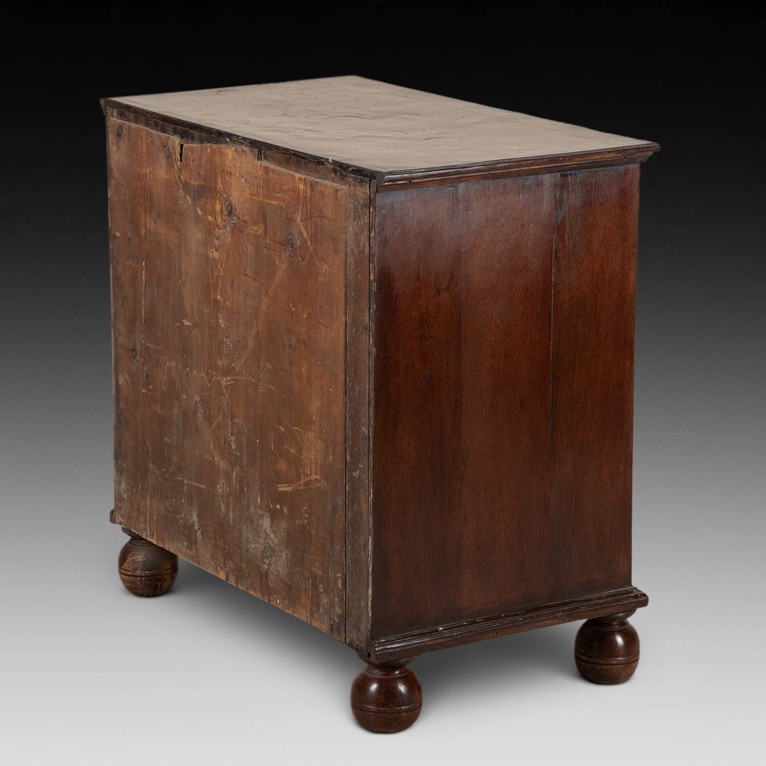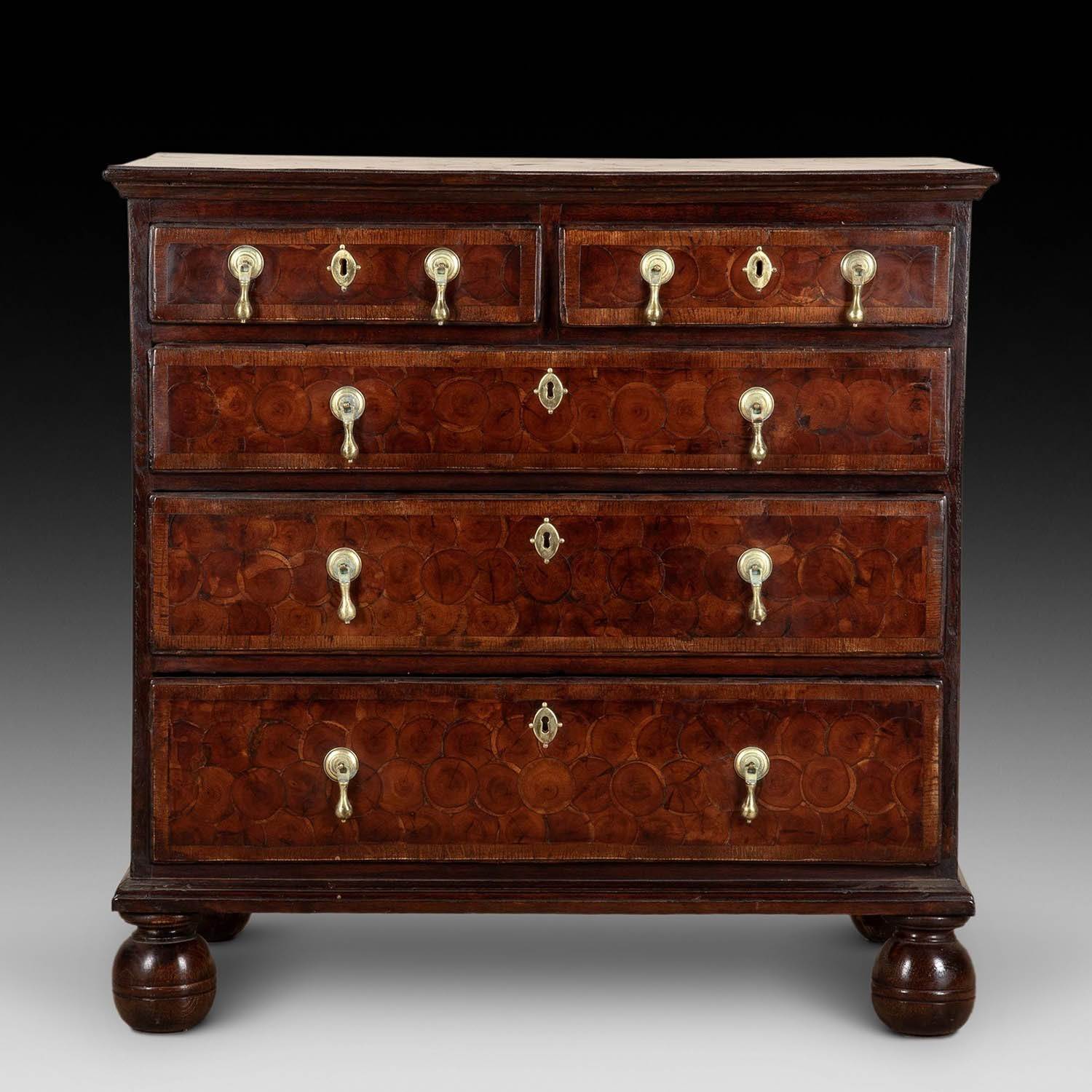 A beautiful late 18th Century English yew wood oyster chest of drawers of small proportions.