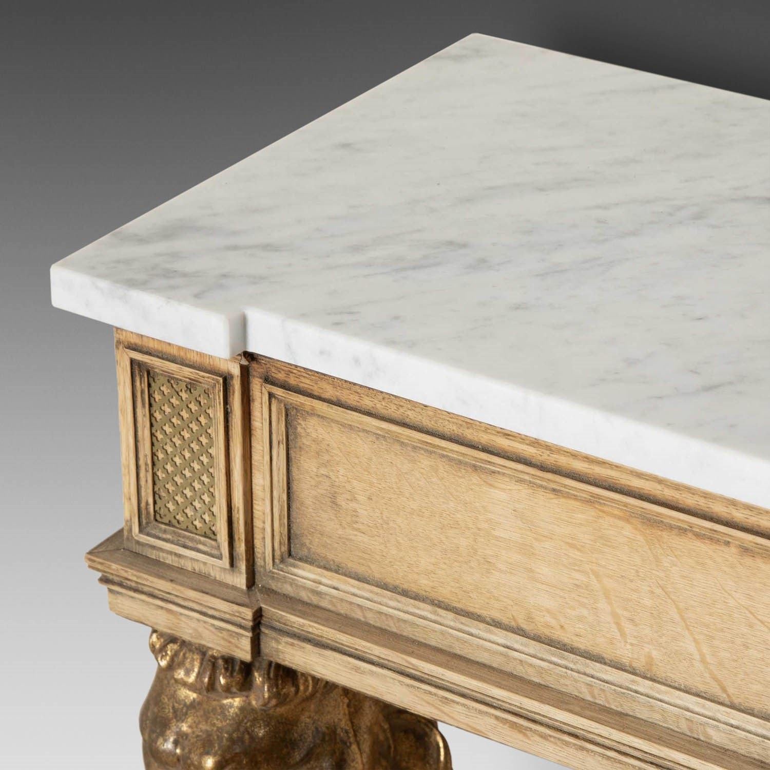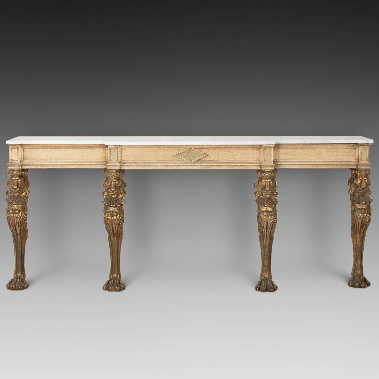 This stunning table has a very slim depth, making it ideal for a hallway, landing or anywhere where you require a piece that’s of these dimensions! Standing on four gilt lion cabriole legs that lead down to a claw foot. The bleach oak frieze has decorative moulded panels inset fine brass grilles to add to the look of this decorative piece. The stepped top is finished in a later but quality Carrera marble.