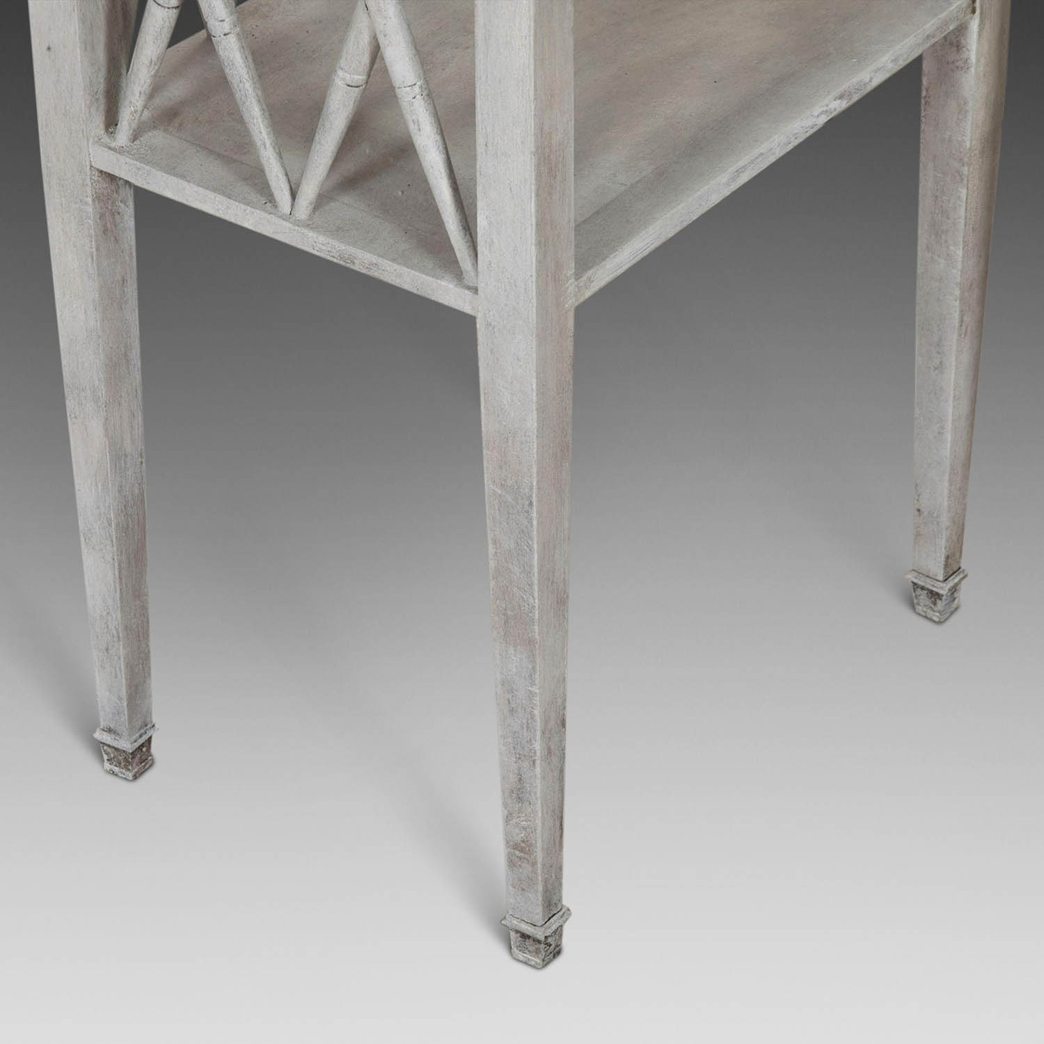 Standing on fine tapering legs, these tables are decorated with faux bamboo rail to their sides and back. Very practical with a single shelf and drawer.