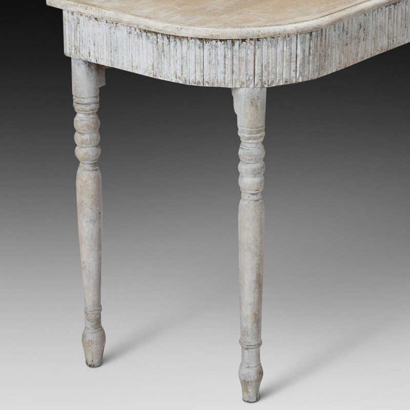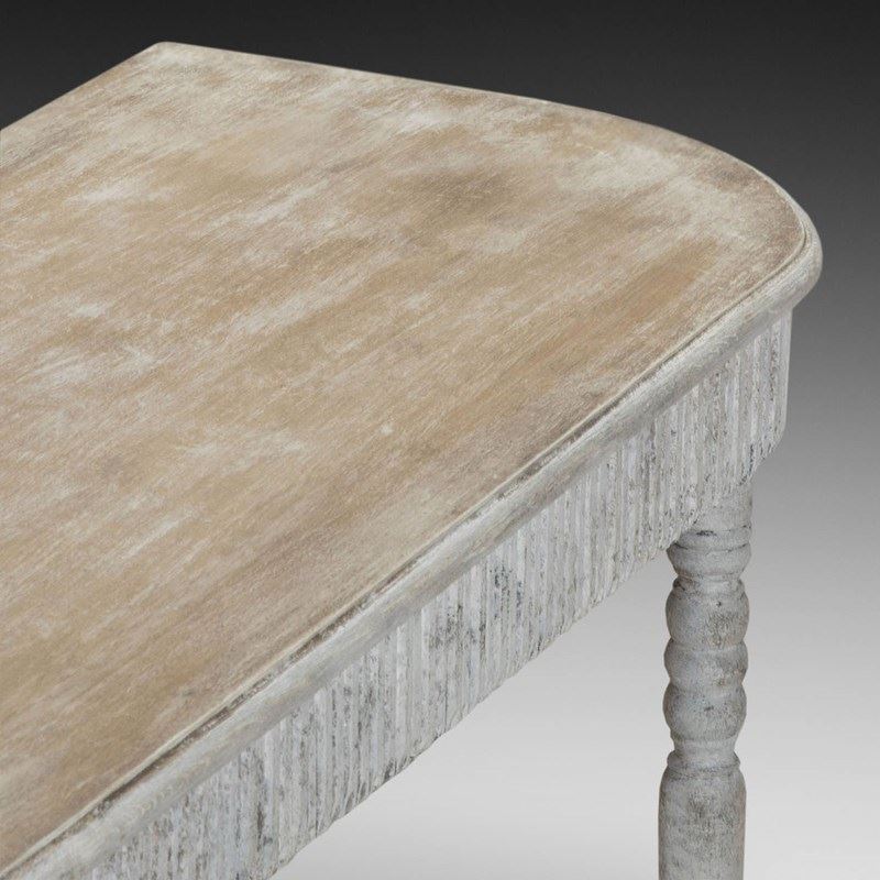 These elegant tables stand well on their fine turned legs. Leading up to a faux driftwood frieze and finished off with a distressed and washed oak board top. All resulting in a great decorative look that would enhance any interior.