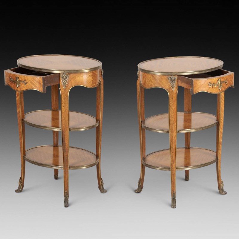 The tables stand well on their fine inlaid cabriole legs, offering storage on the two shelves and with additional hidden drawer. The tables are decorated with their original good quality brass mounts. A great find!