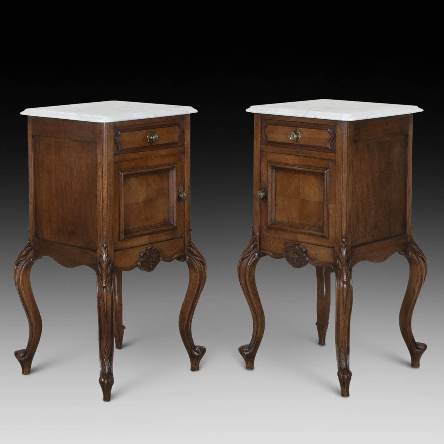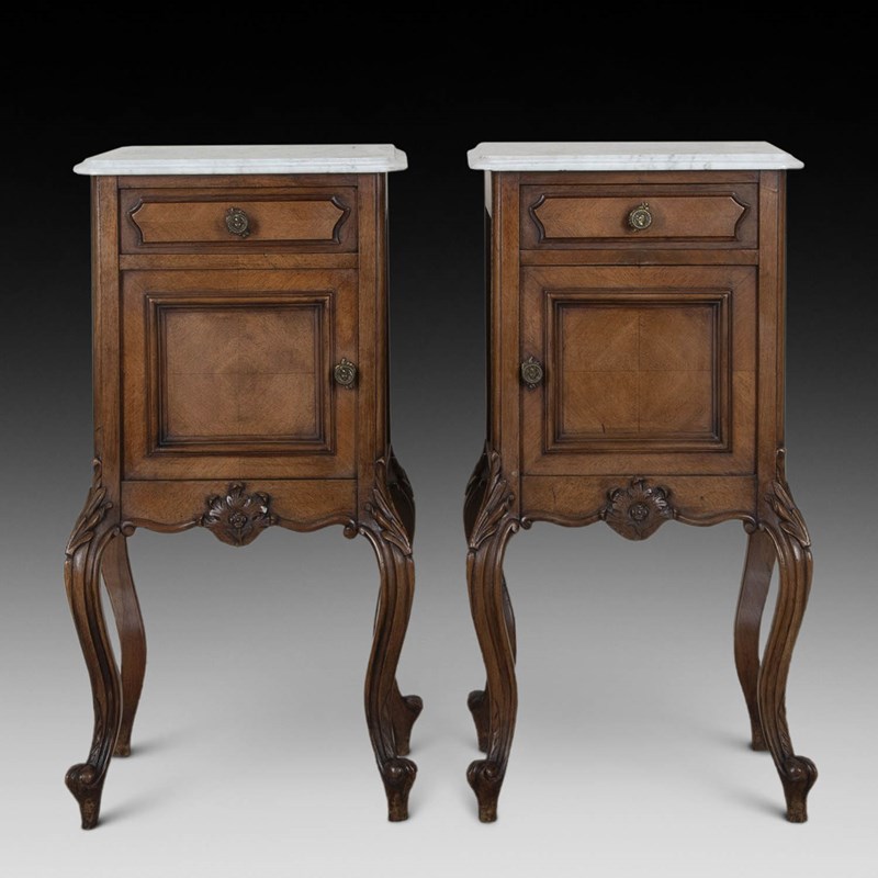 Standing on strong yet elegant cabriole legs with carved decoration. These lovely cabinets have useful storage with a single drawer and a cupboard section below, all finished off with their original white marble tops.