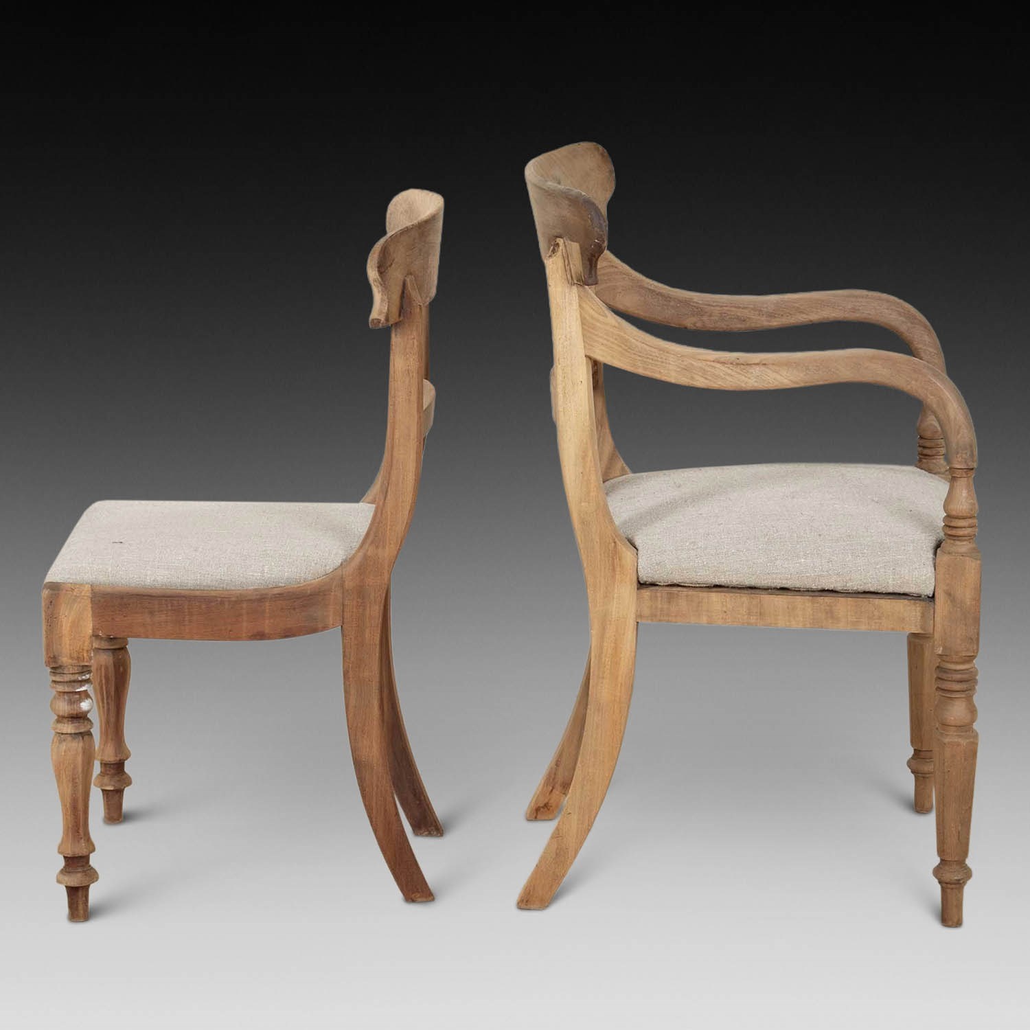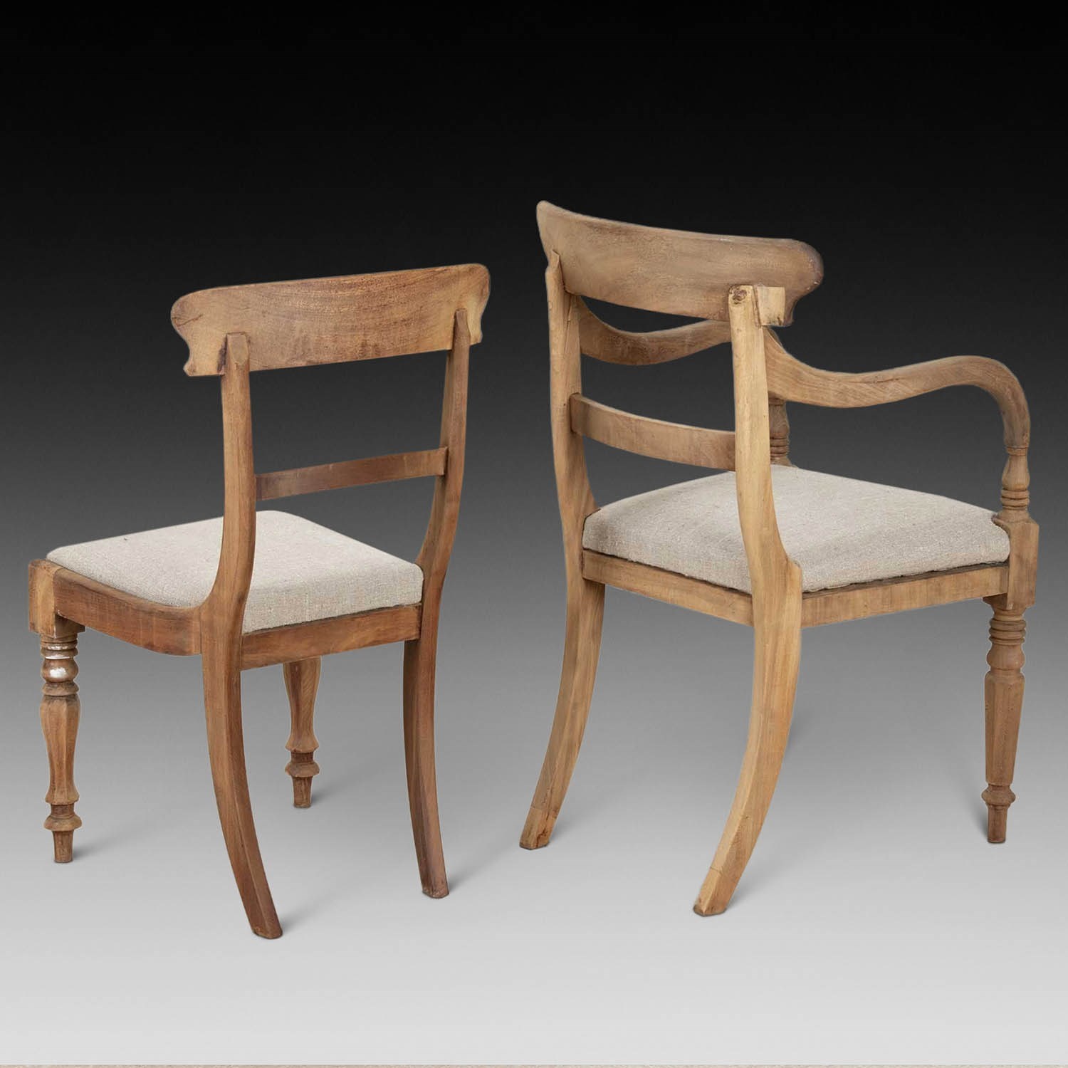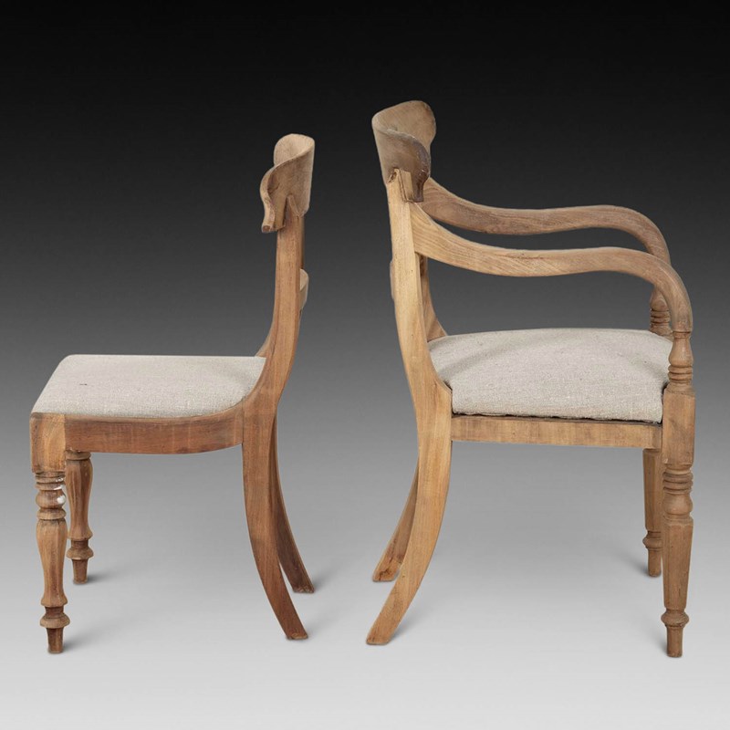 This beautiful set of chairs have been hand stripped, lightly bleached and hand sanded to give a very natural look to suit today’s taste. Very versatile for formal or more informal dining. The drop in seats are covered in a natural hessian to complement the look.