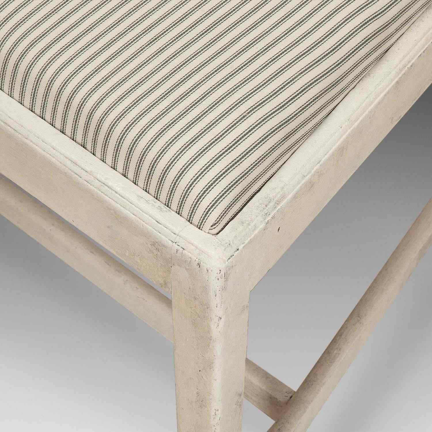 Painted in old white the drop in seats are upholstered in a stripped ticking to complement the decorative look of the chairs.