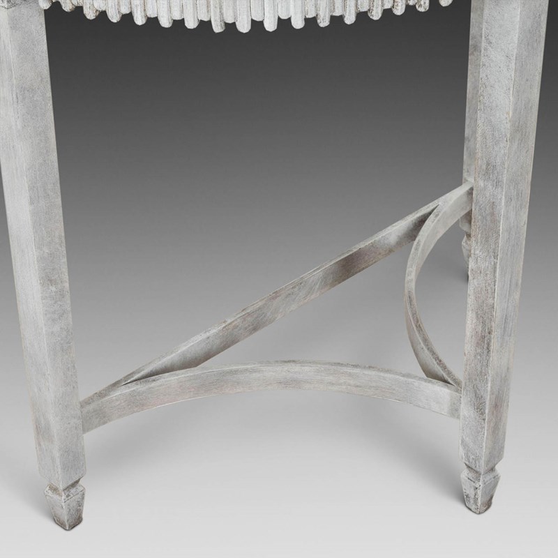 Standing on tapering legs with a shaped stretcher at the base. The table has an attractive later applied driftwood style apron and a painted top. These elegant tables have an all over later paint finish in aged white resulting in a lovely decorative look.