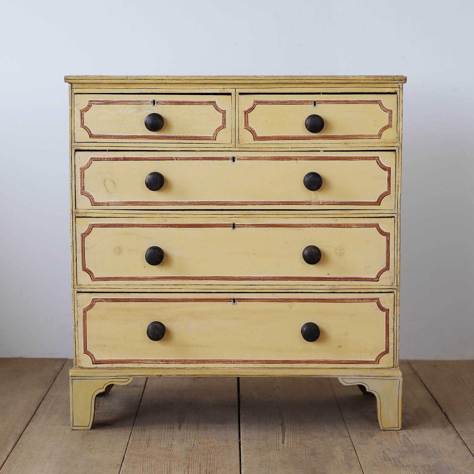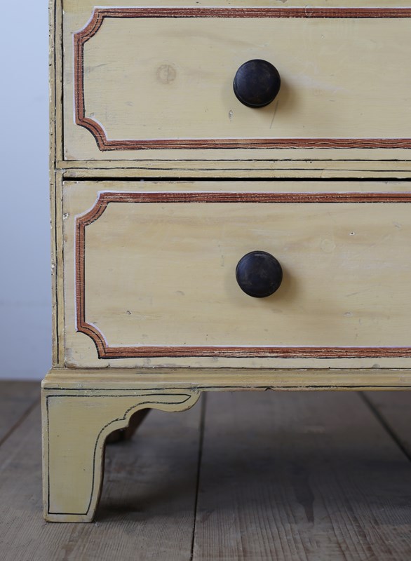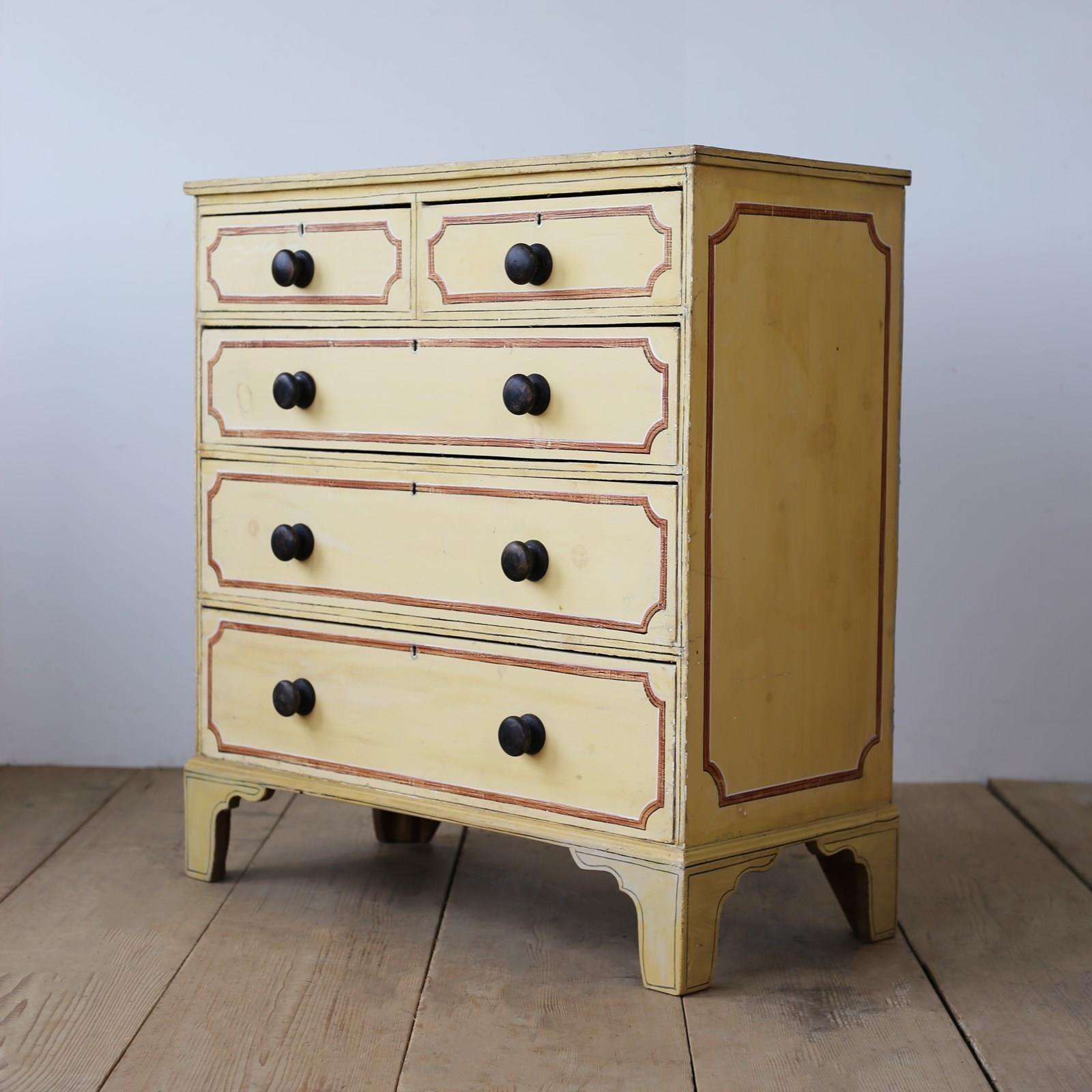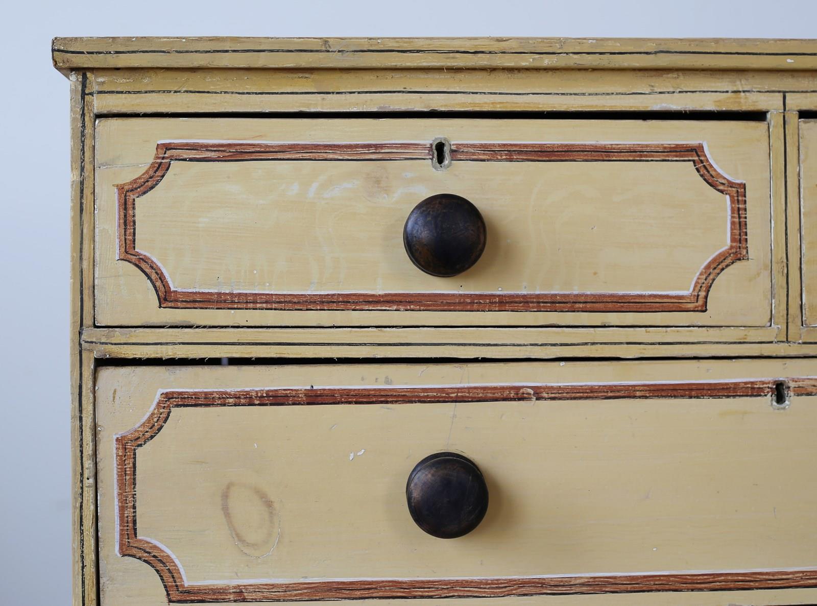 19th century painted pine chest of drawers with later decoration.