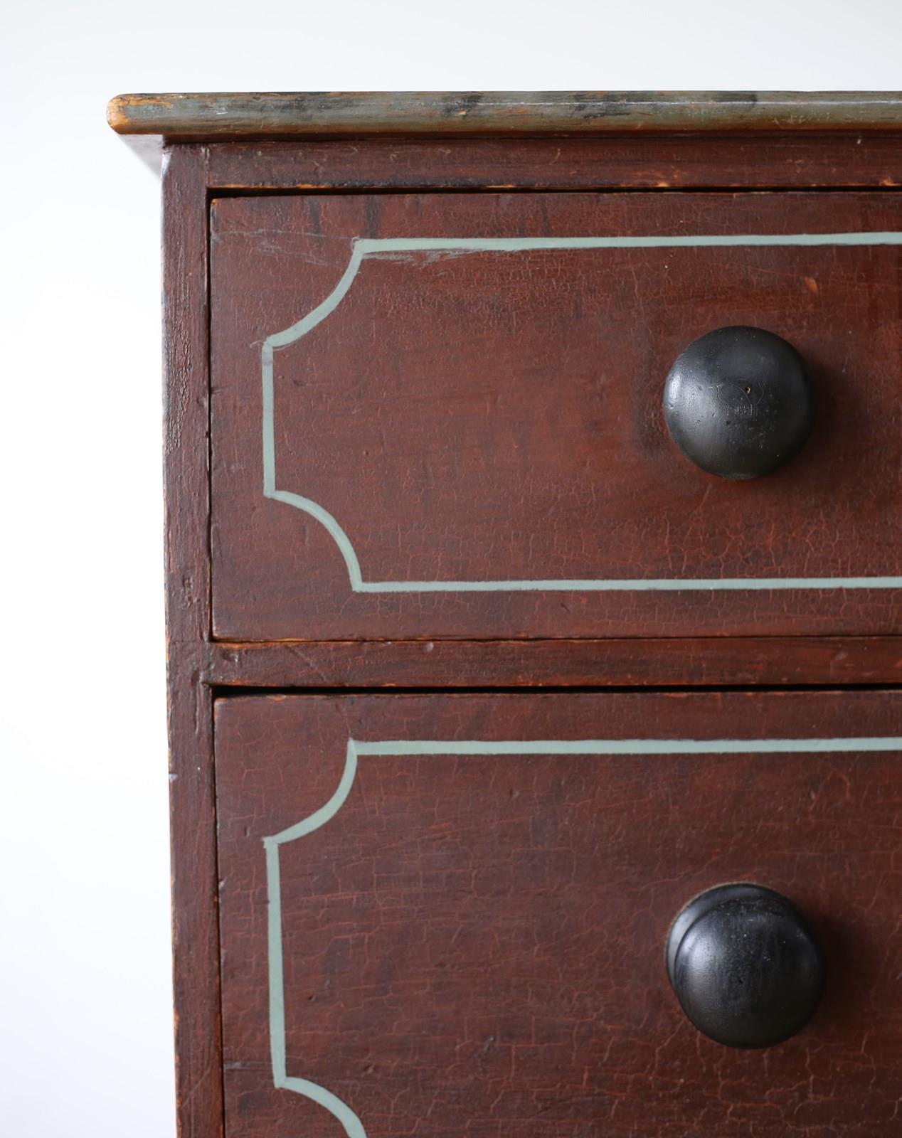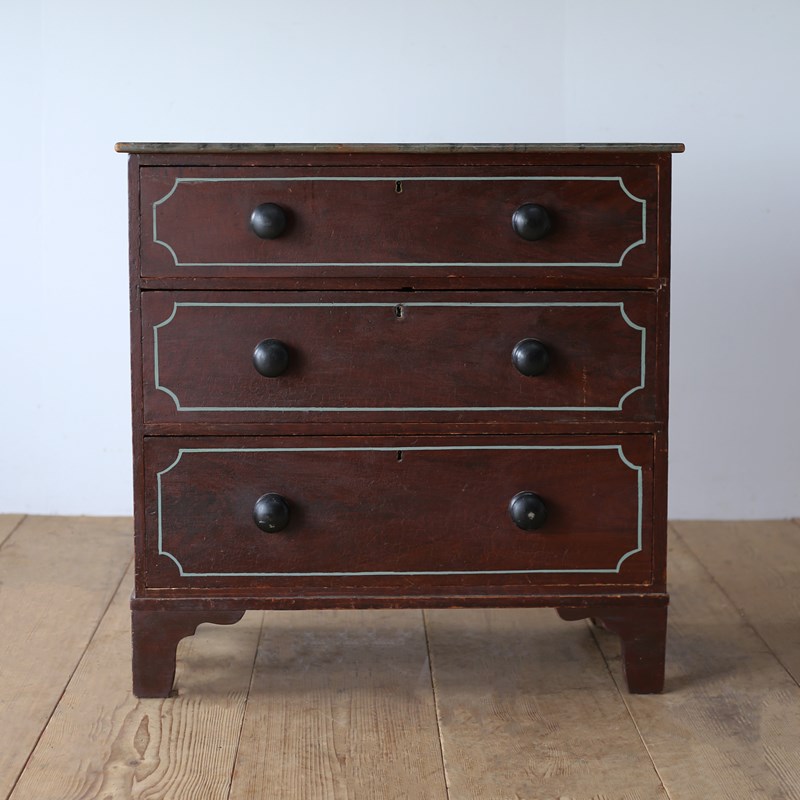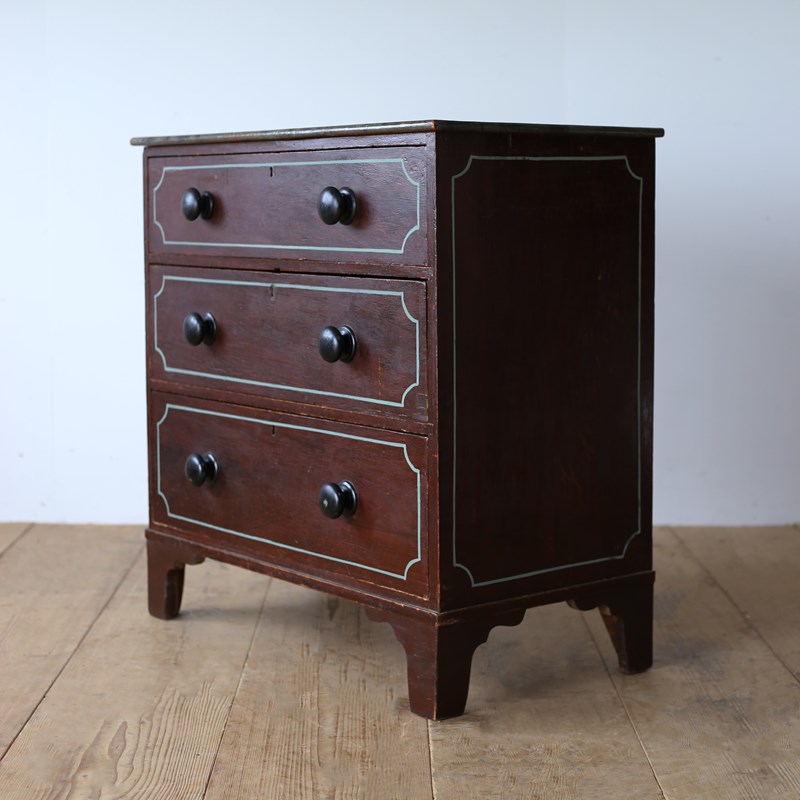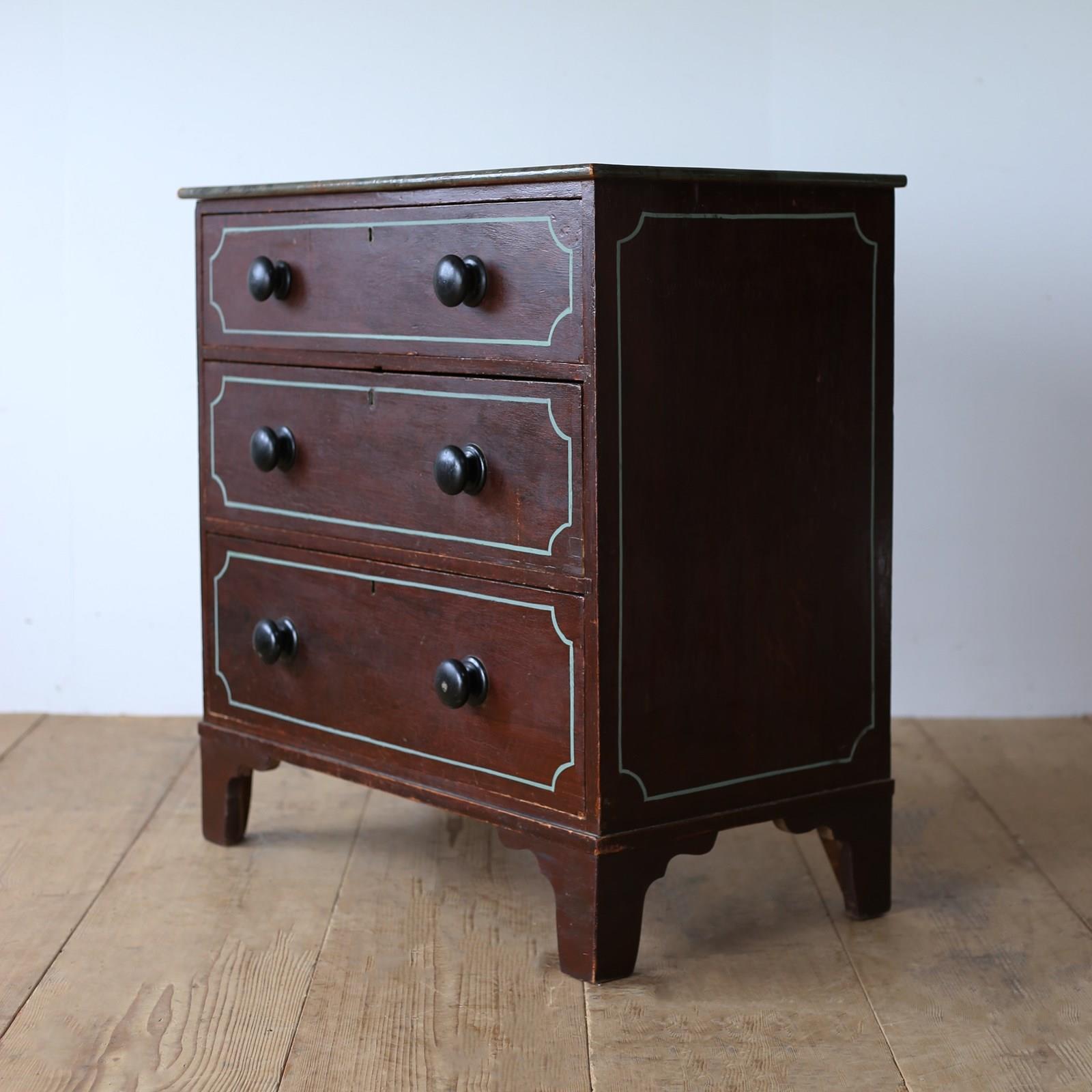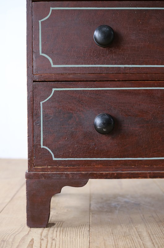 19th century chest of drawers on bracket feet in original paint with later lined decoration.