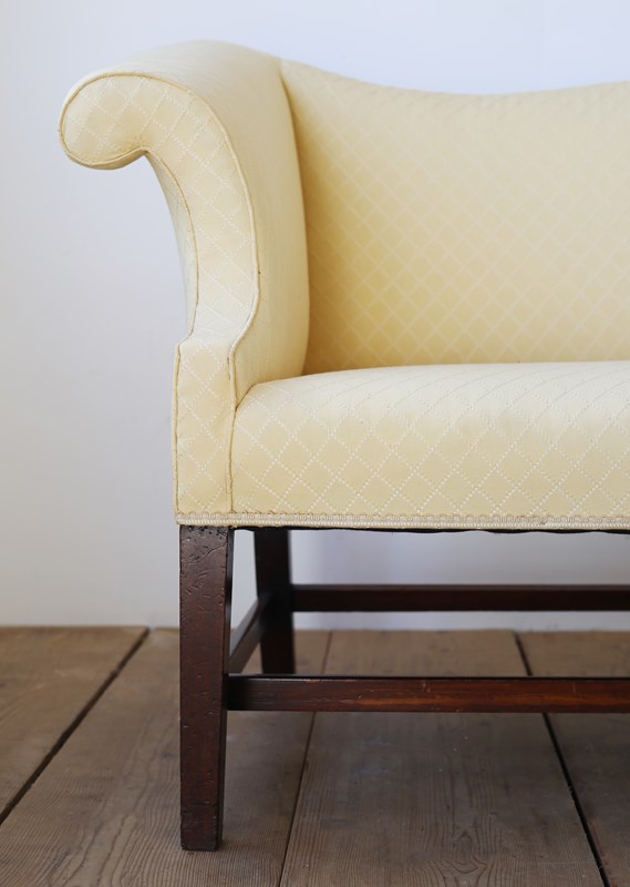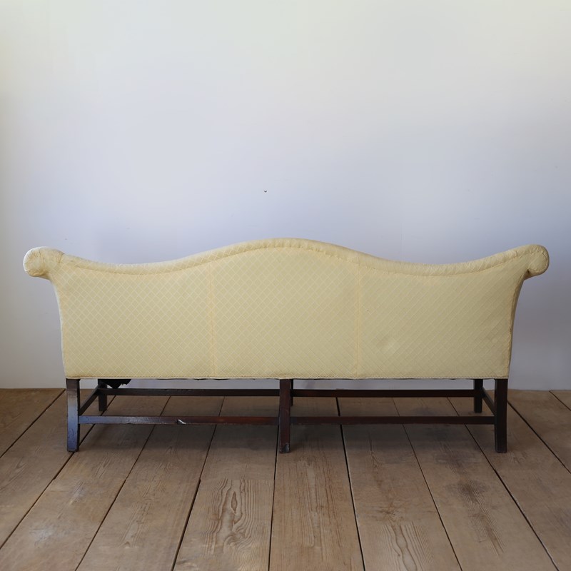 19th century Georgian camel back sofa on mahogany supports and x frame stretchers.
