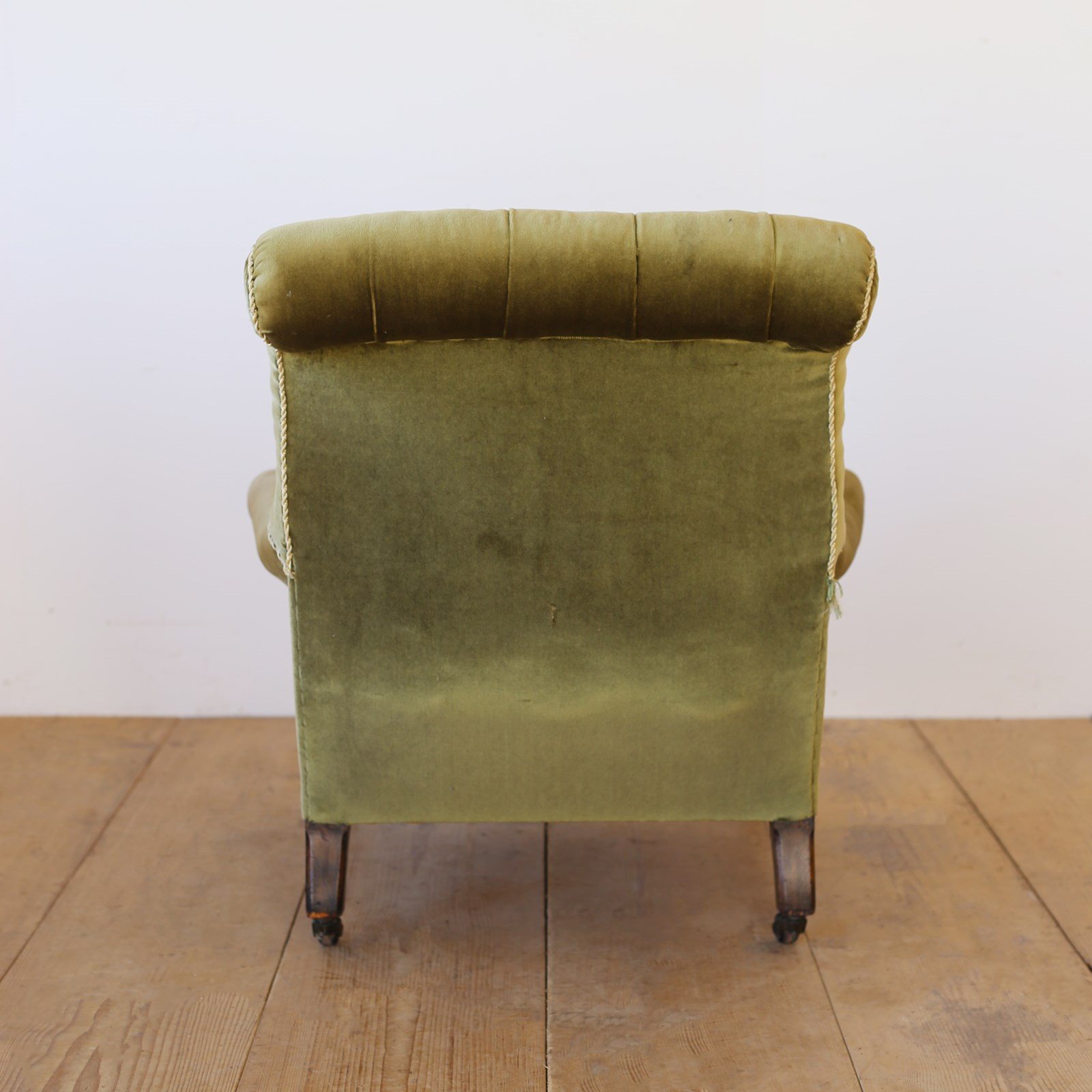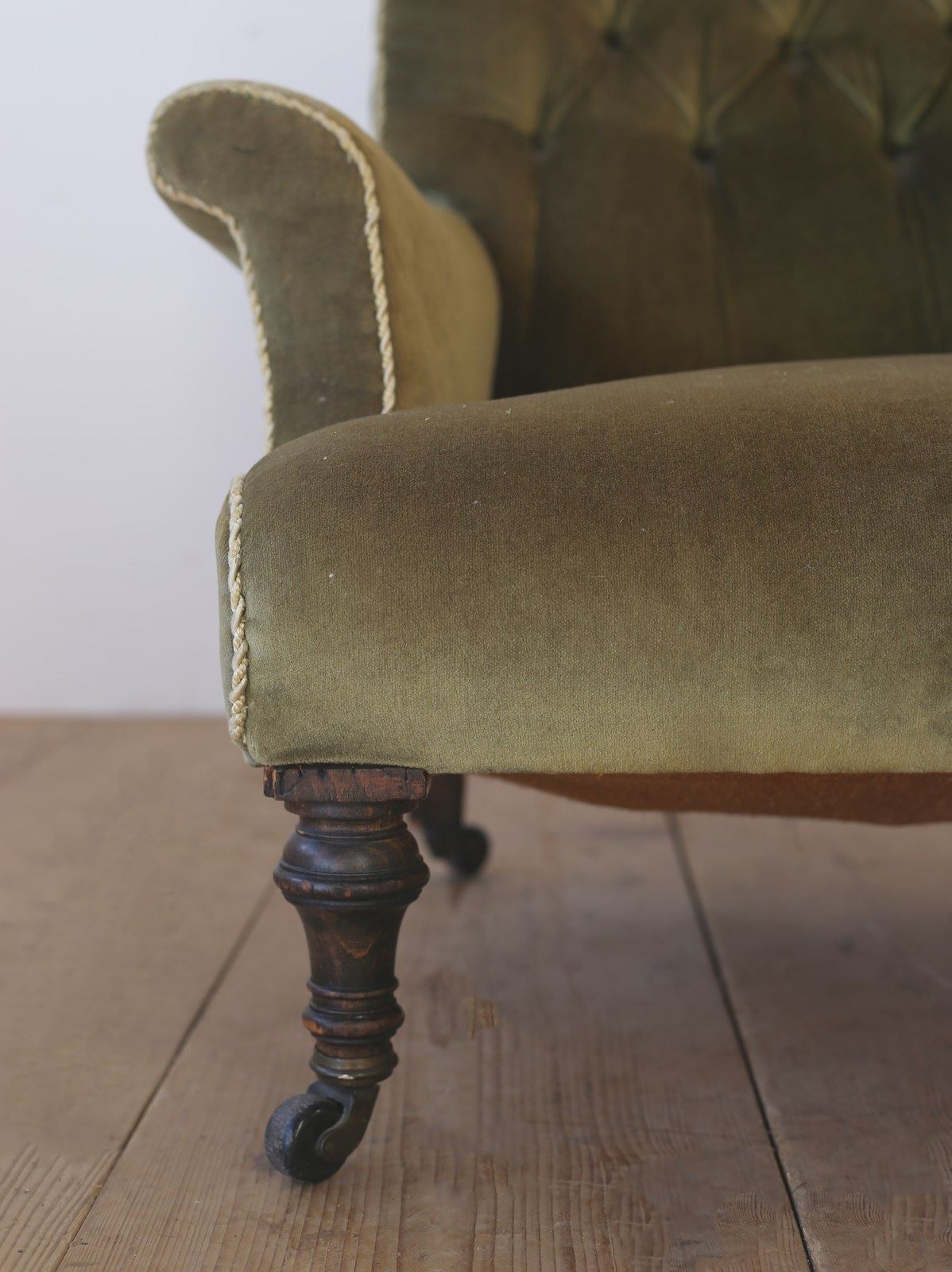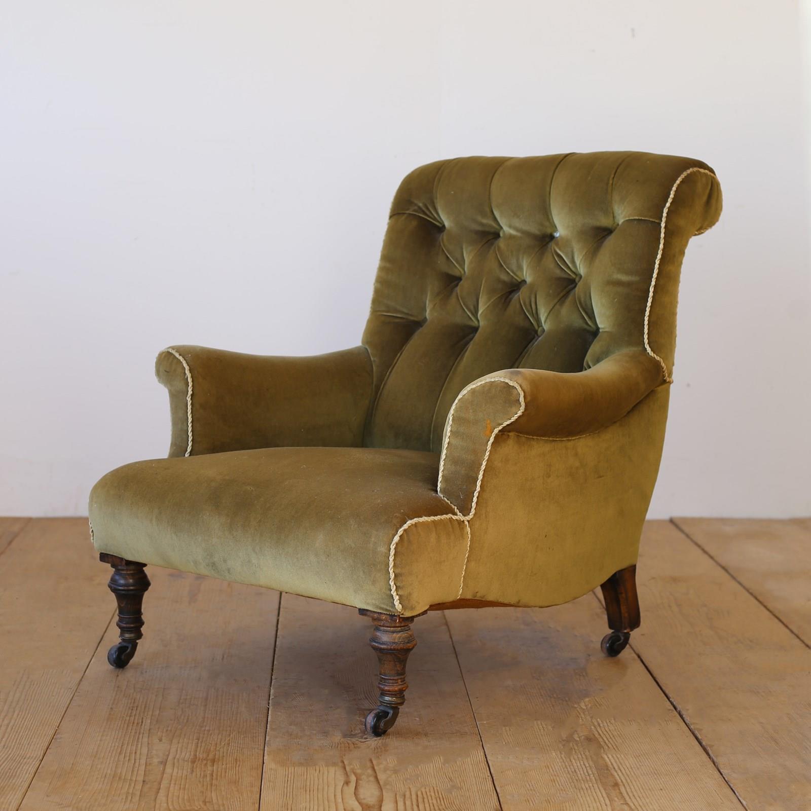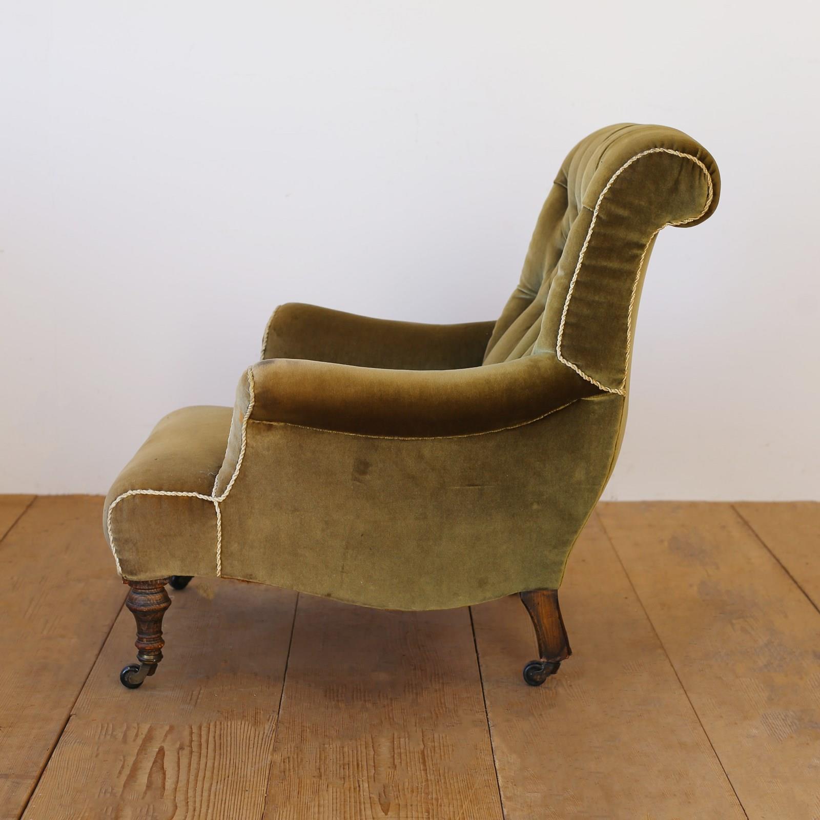 19th century button back Howard style chair on turned front legs and original castors.