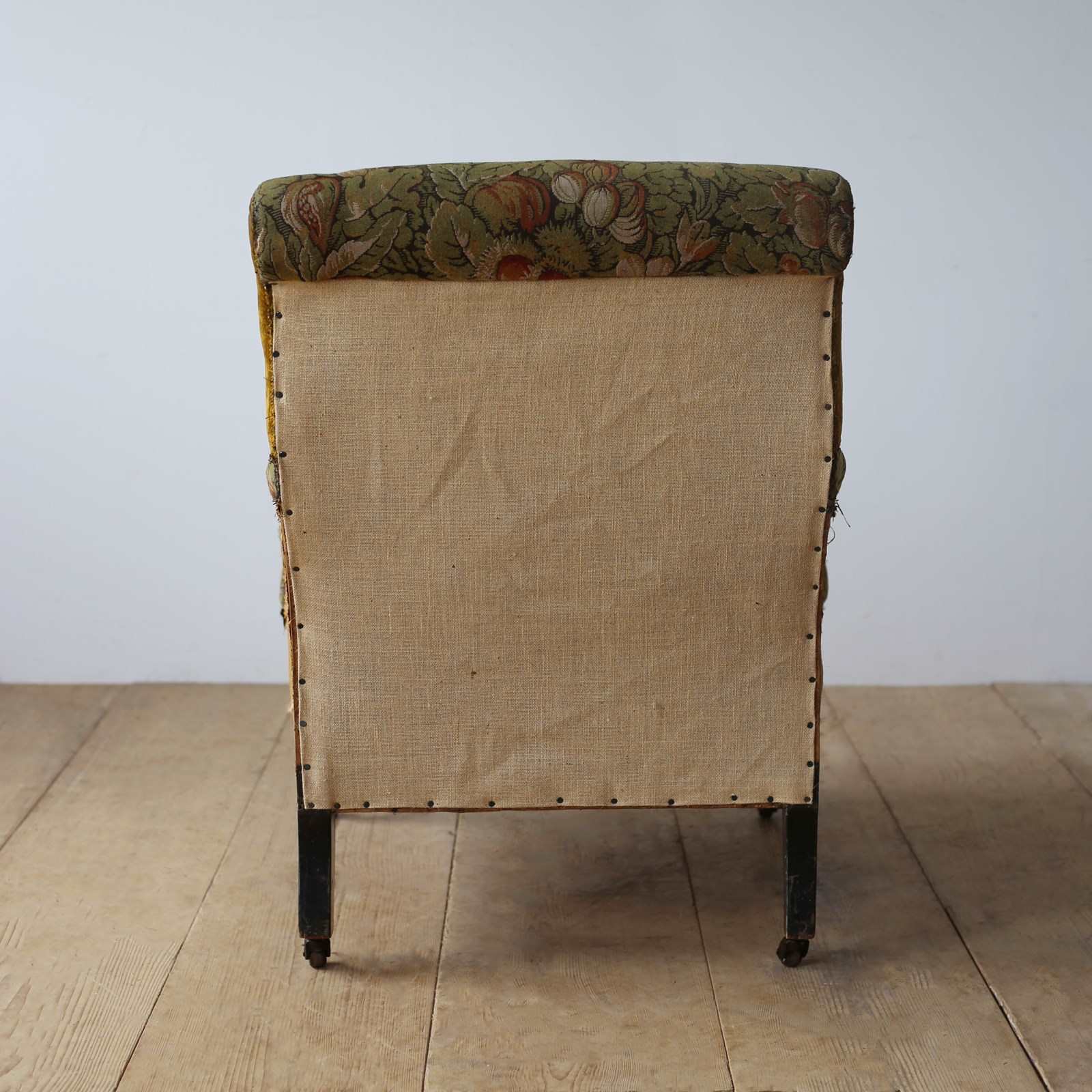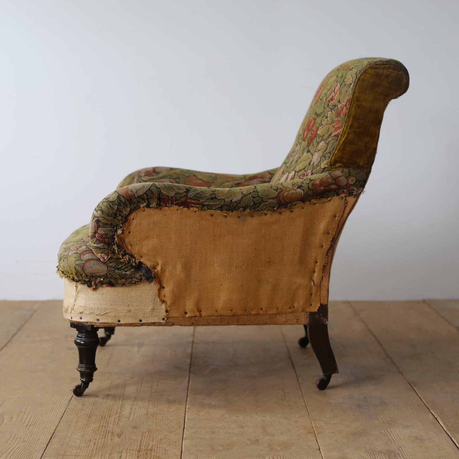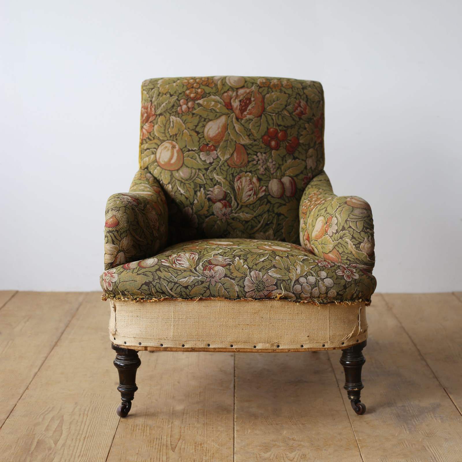 Howard style armchair on ebonised legs and original castors for upholstery.