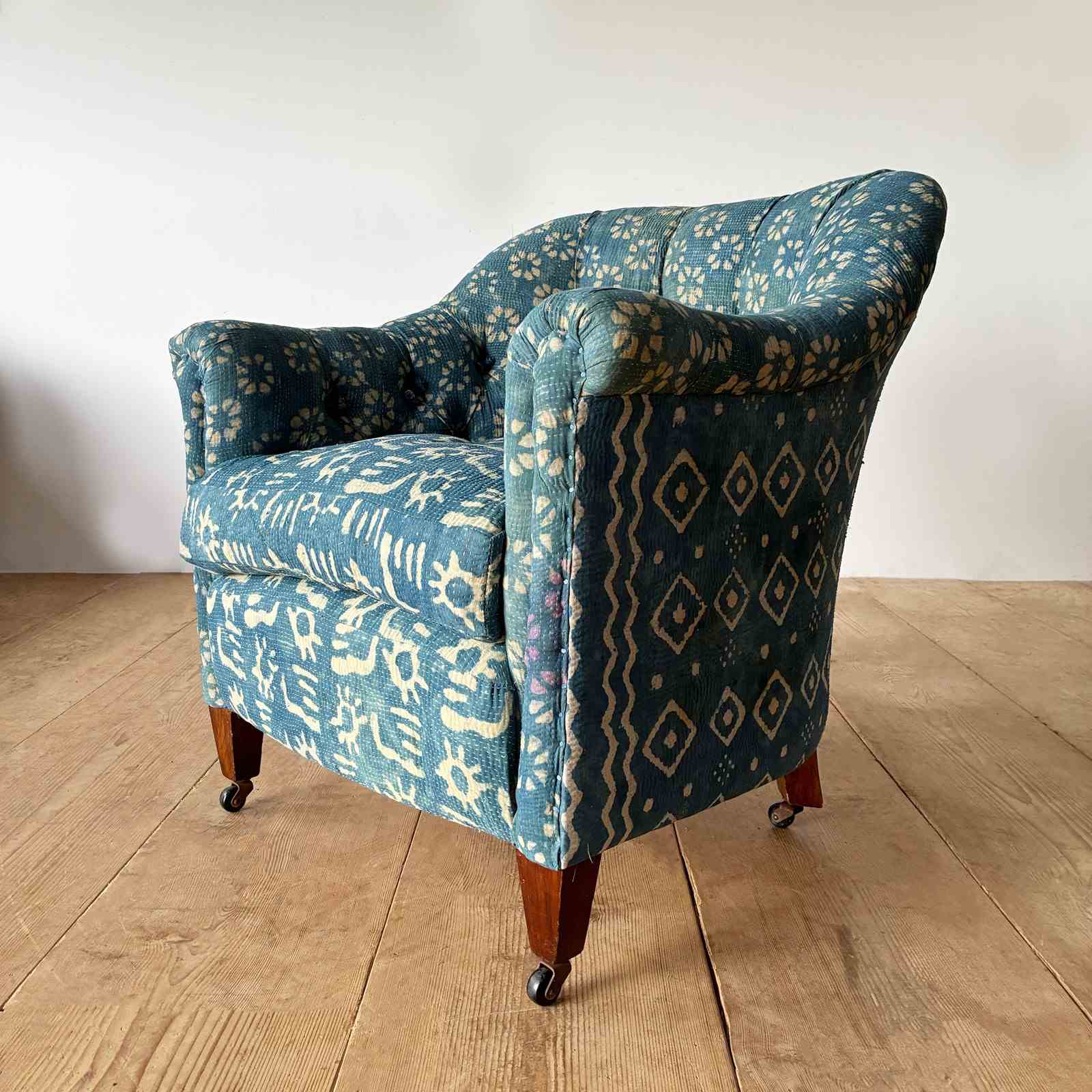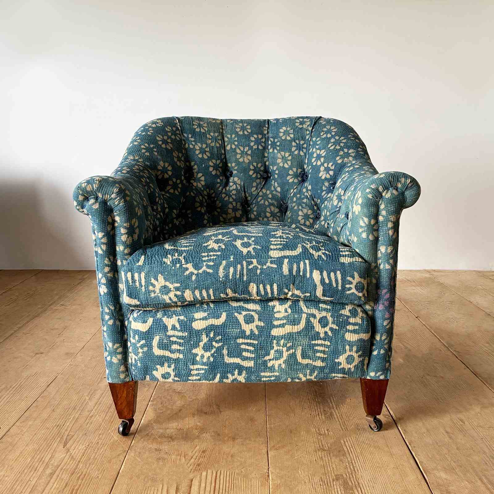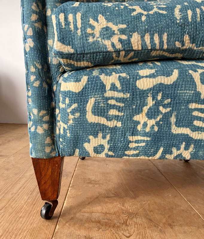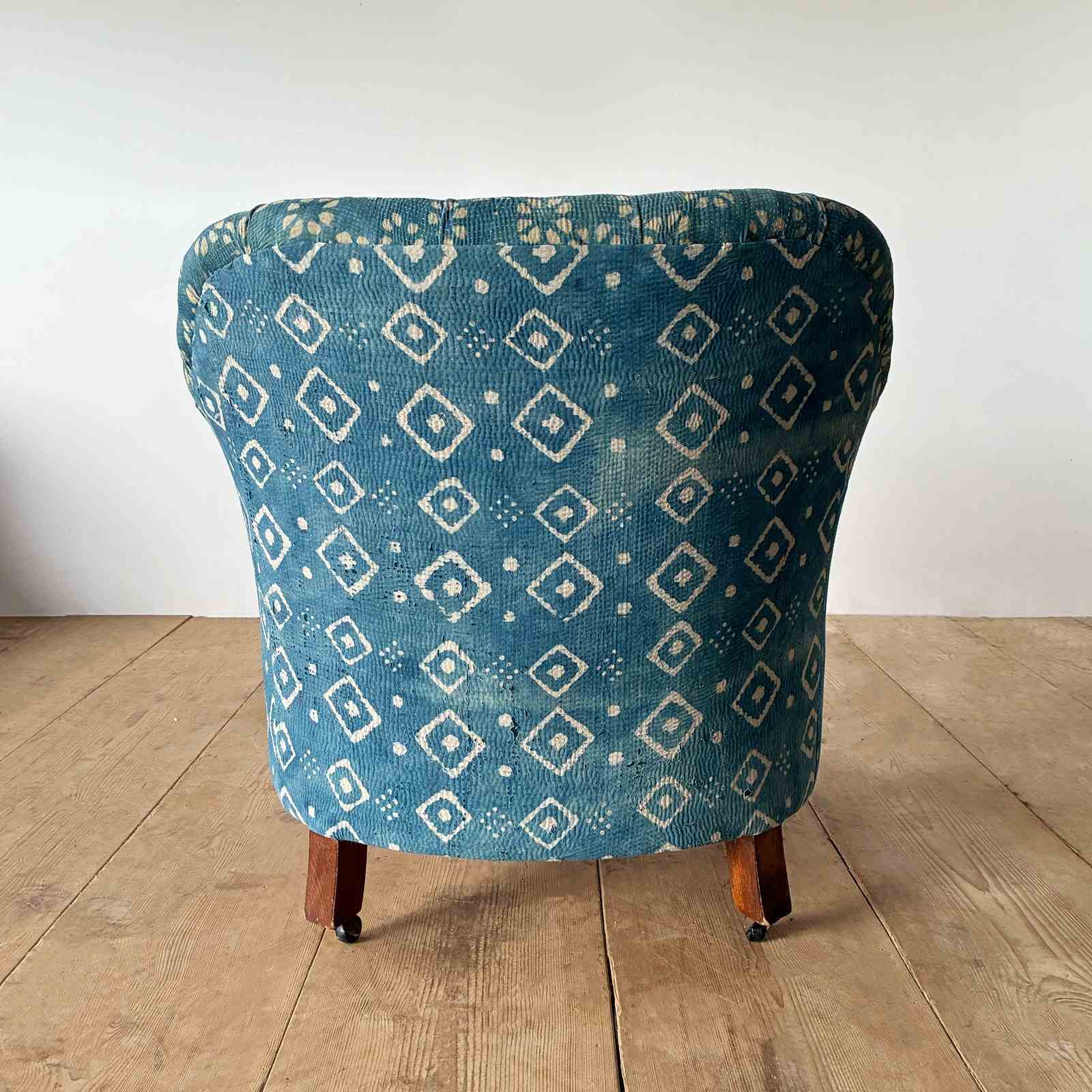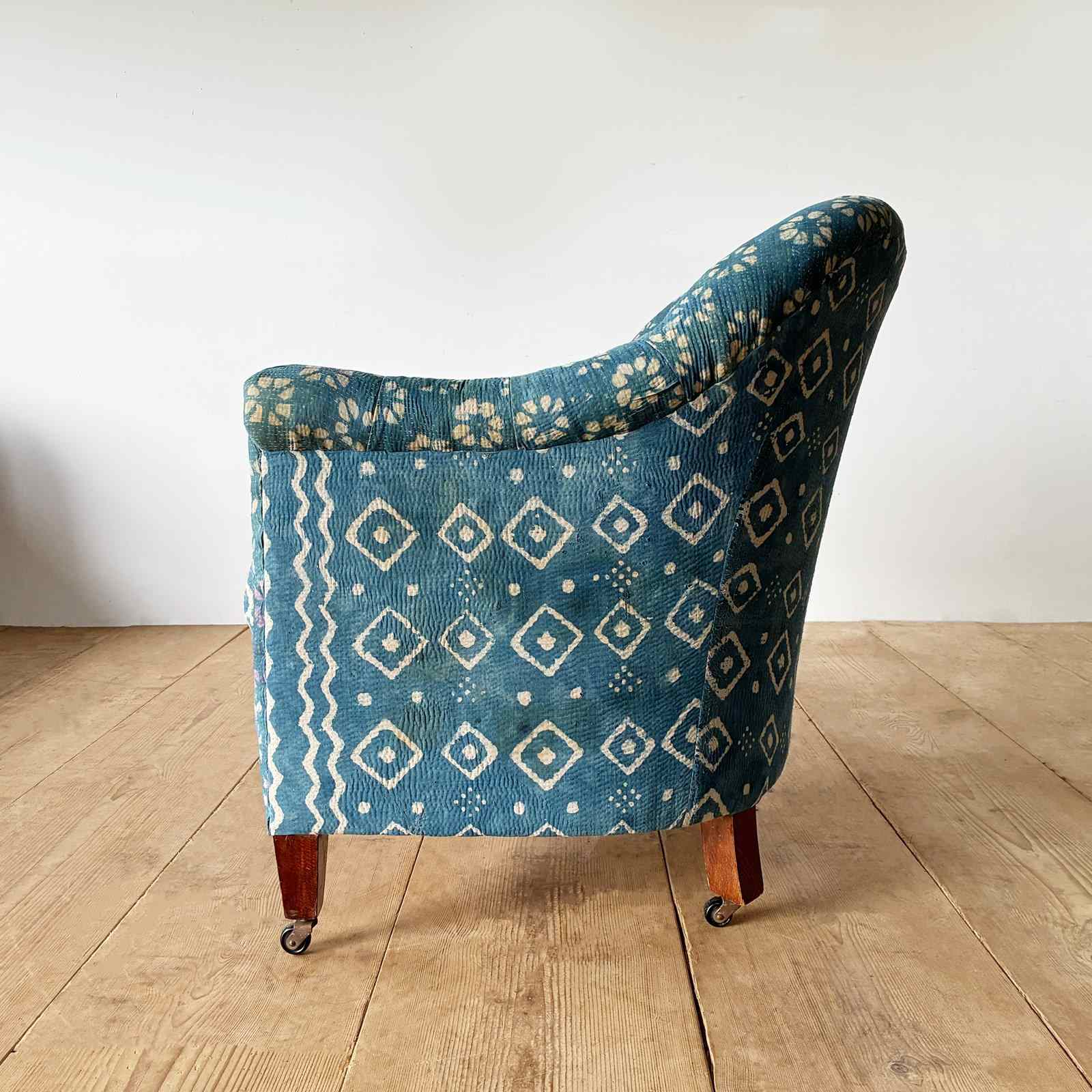19th century tub chair recovered in vintage Indian fabric.