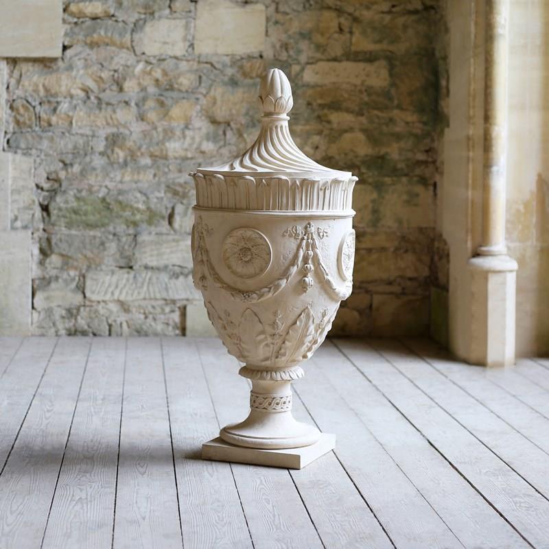 Bespoke Coade stone urns, moulded from a Coade original. First developed in the 18th Century by Eleanor Coade, her work can be found in all parts of the British Isles and has been exported around the world. Coade stone makes it possible to produce sculpture with the finest detail that is also incredibly durable and has the appearance of stone. Available in plaster also. Priced individually, plus VAT.