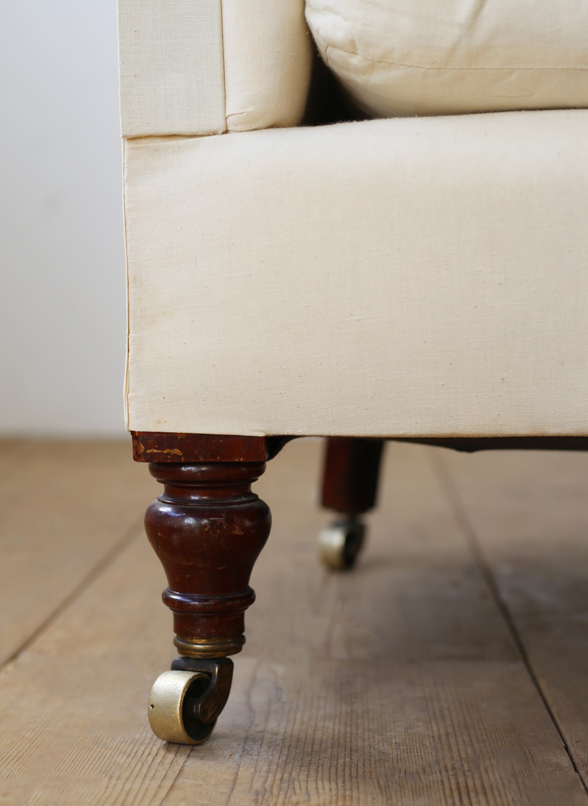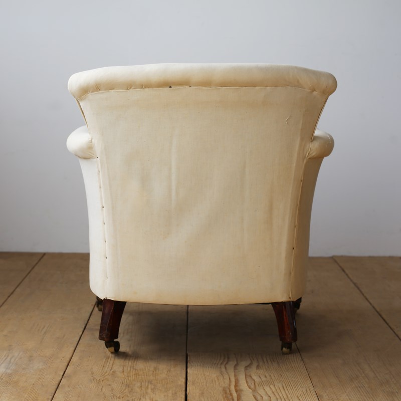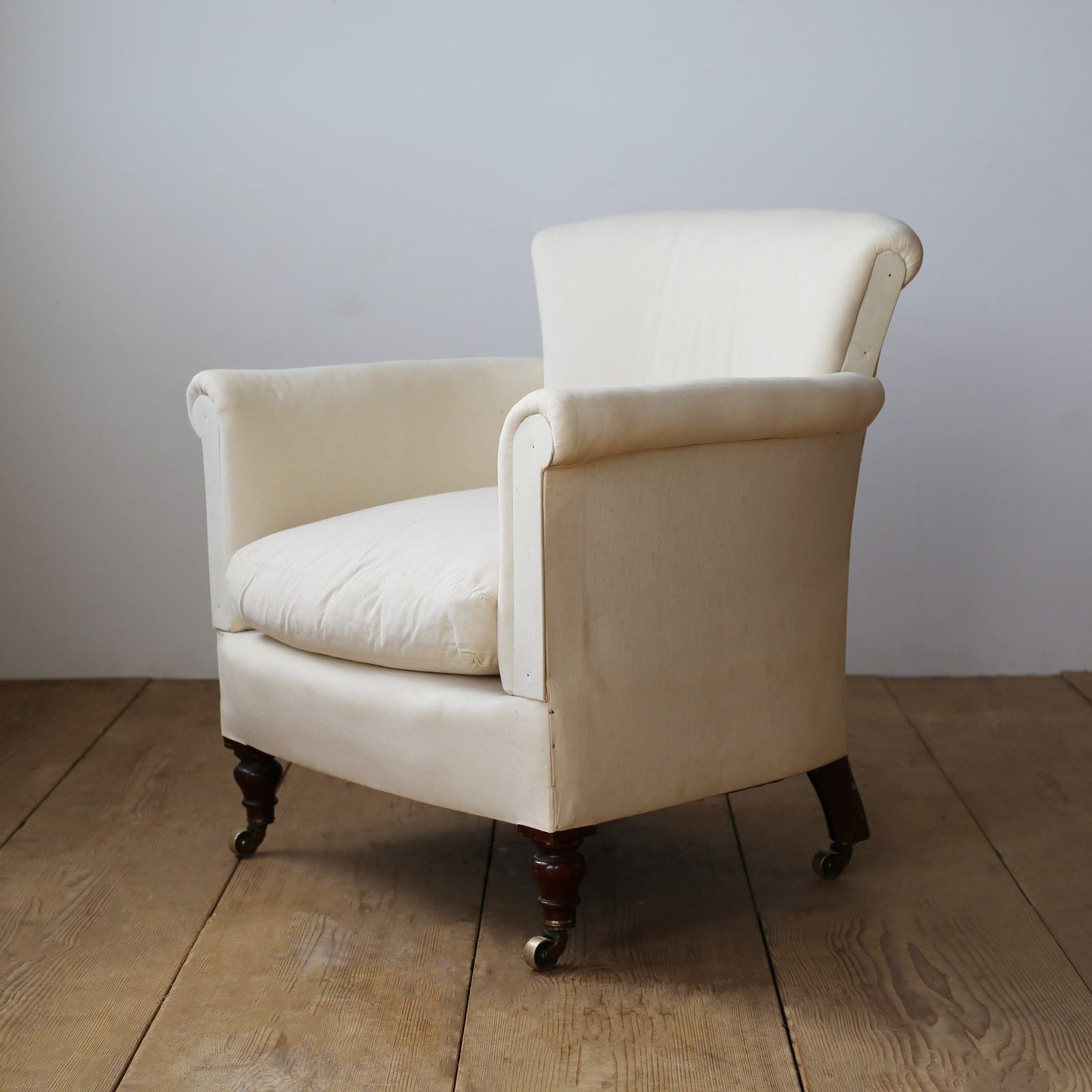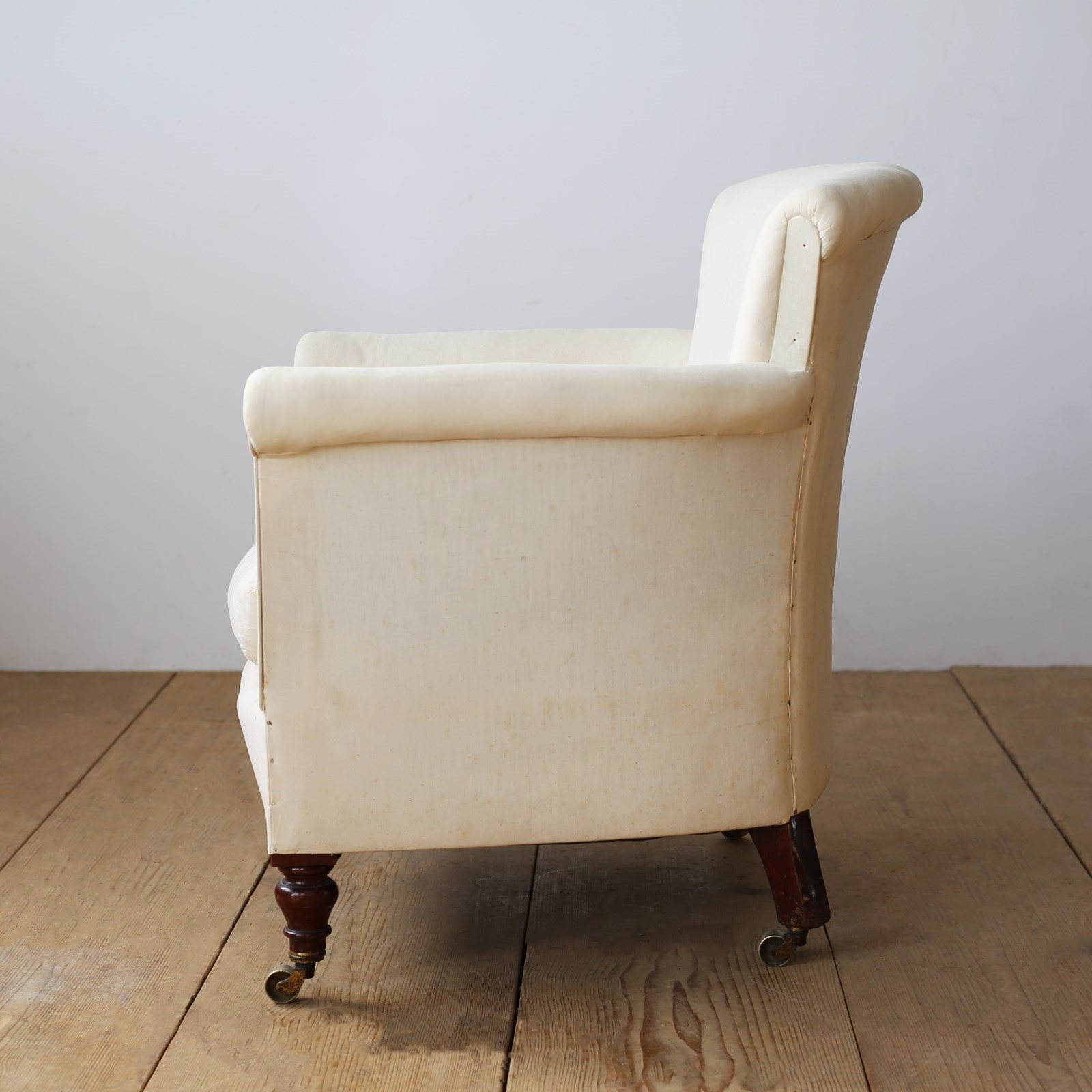 Howard style Woodstock armchair on original walnut legs and brass castors. Ready for top cover.