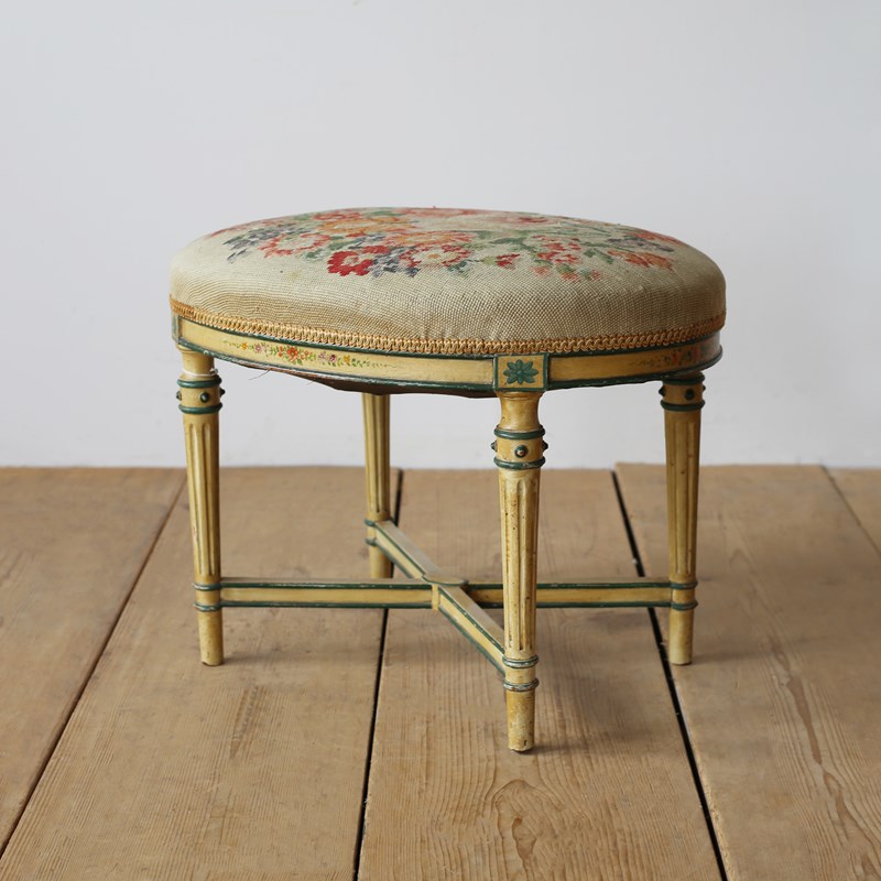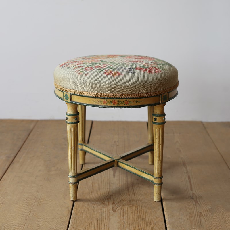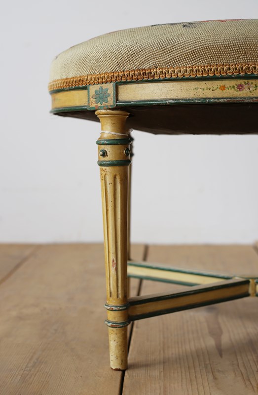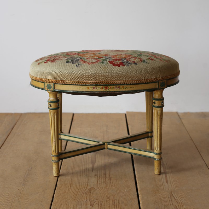 Early 20th century Louis XVI style stool. Original paint and needlepoint.