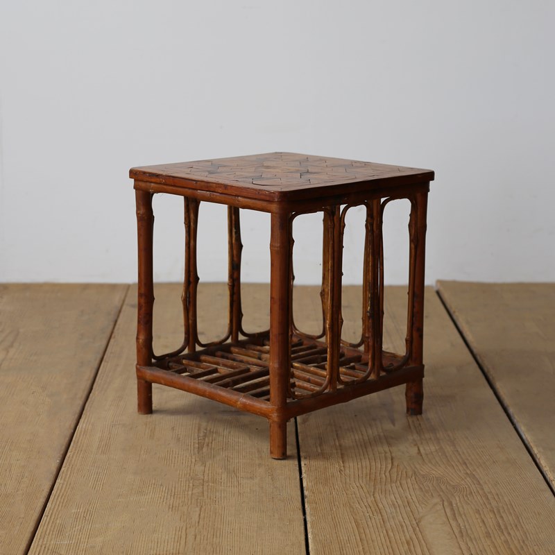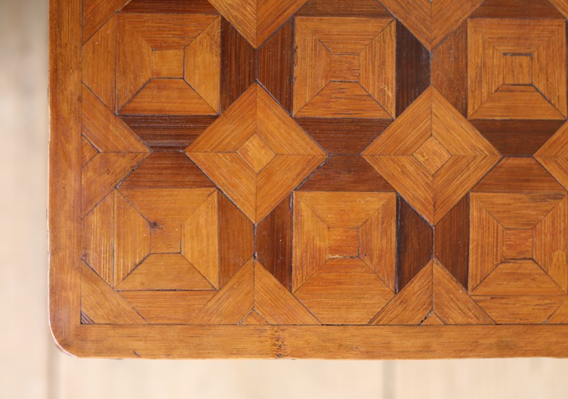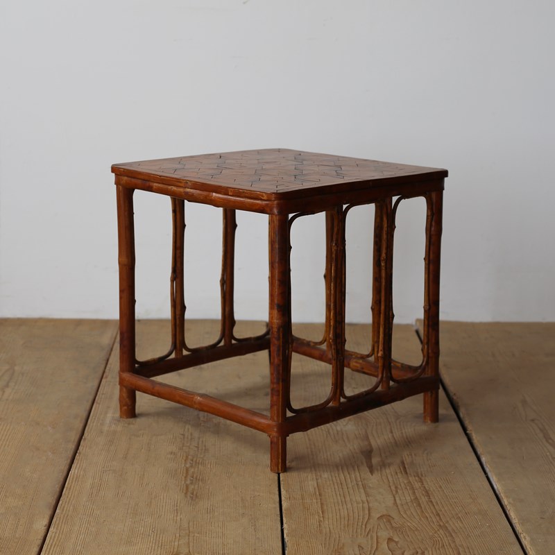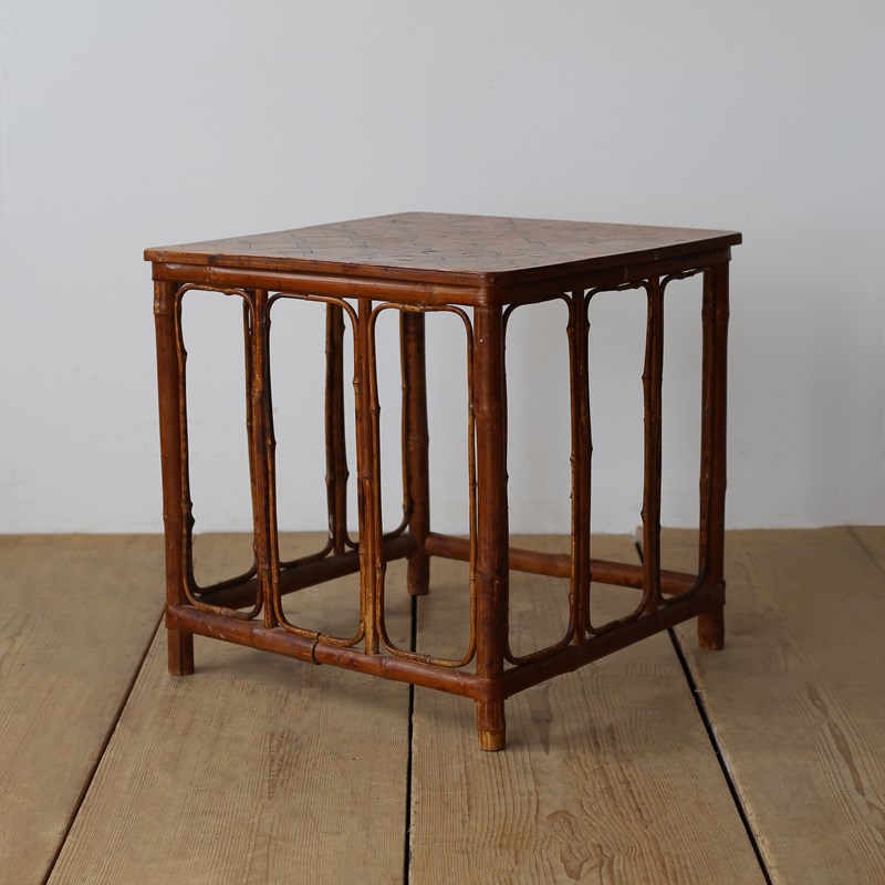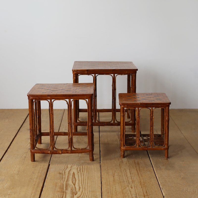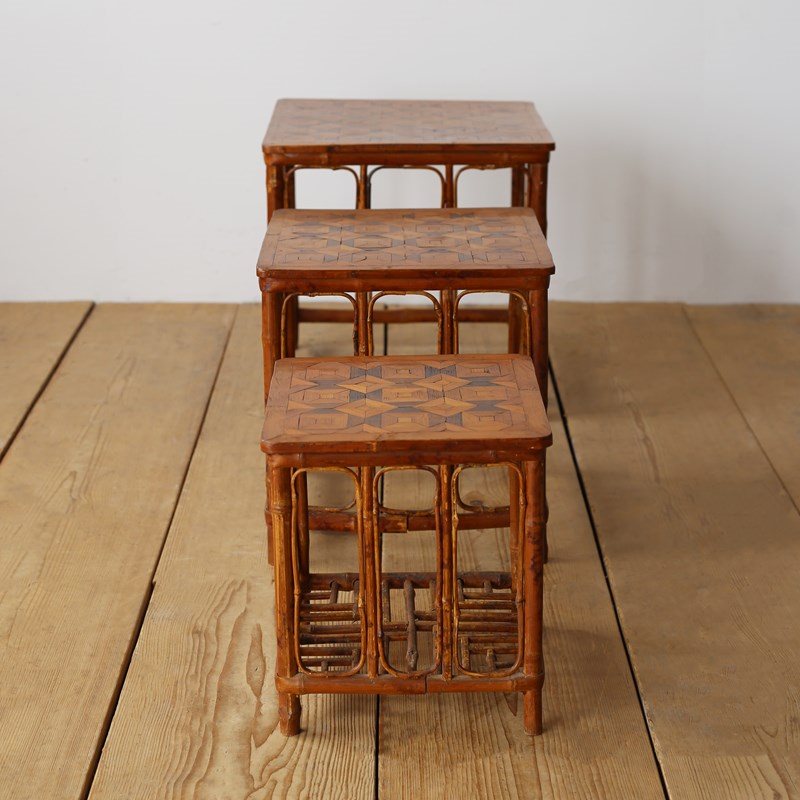 Nest of 1960s bamboo with parquet tops. Dimensions given are for largest table.