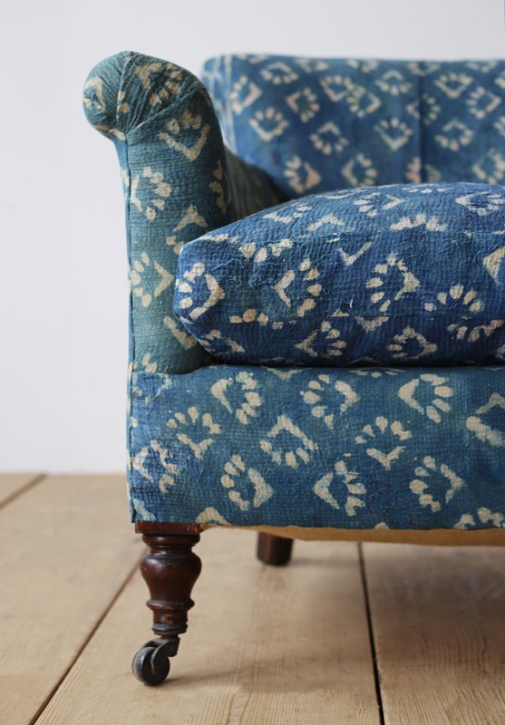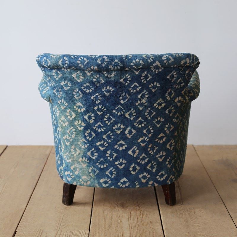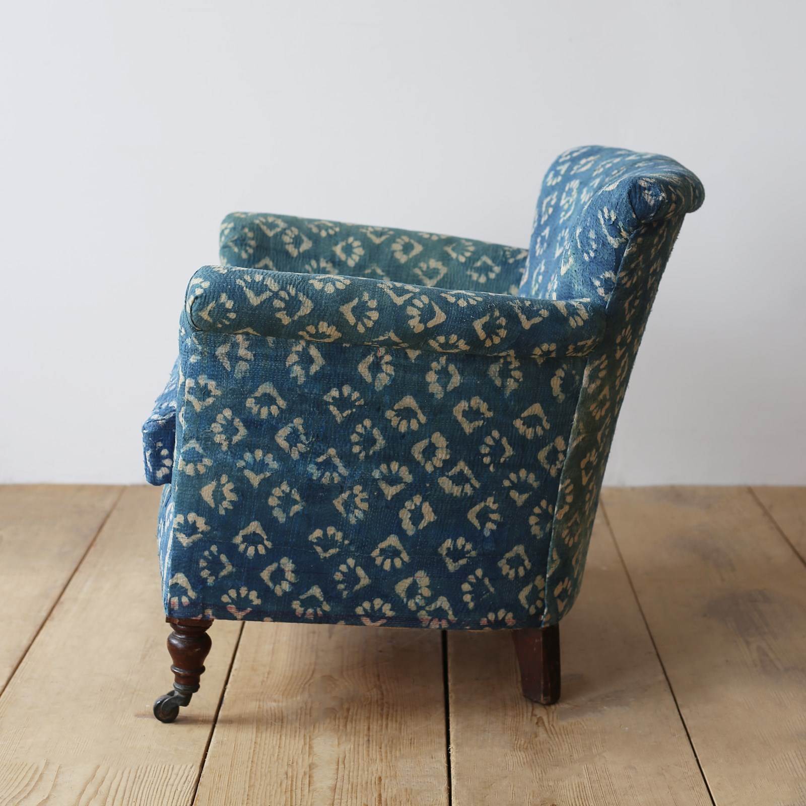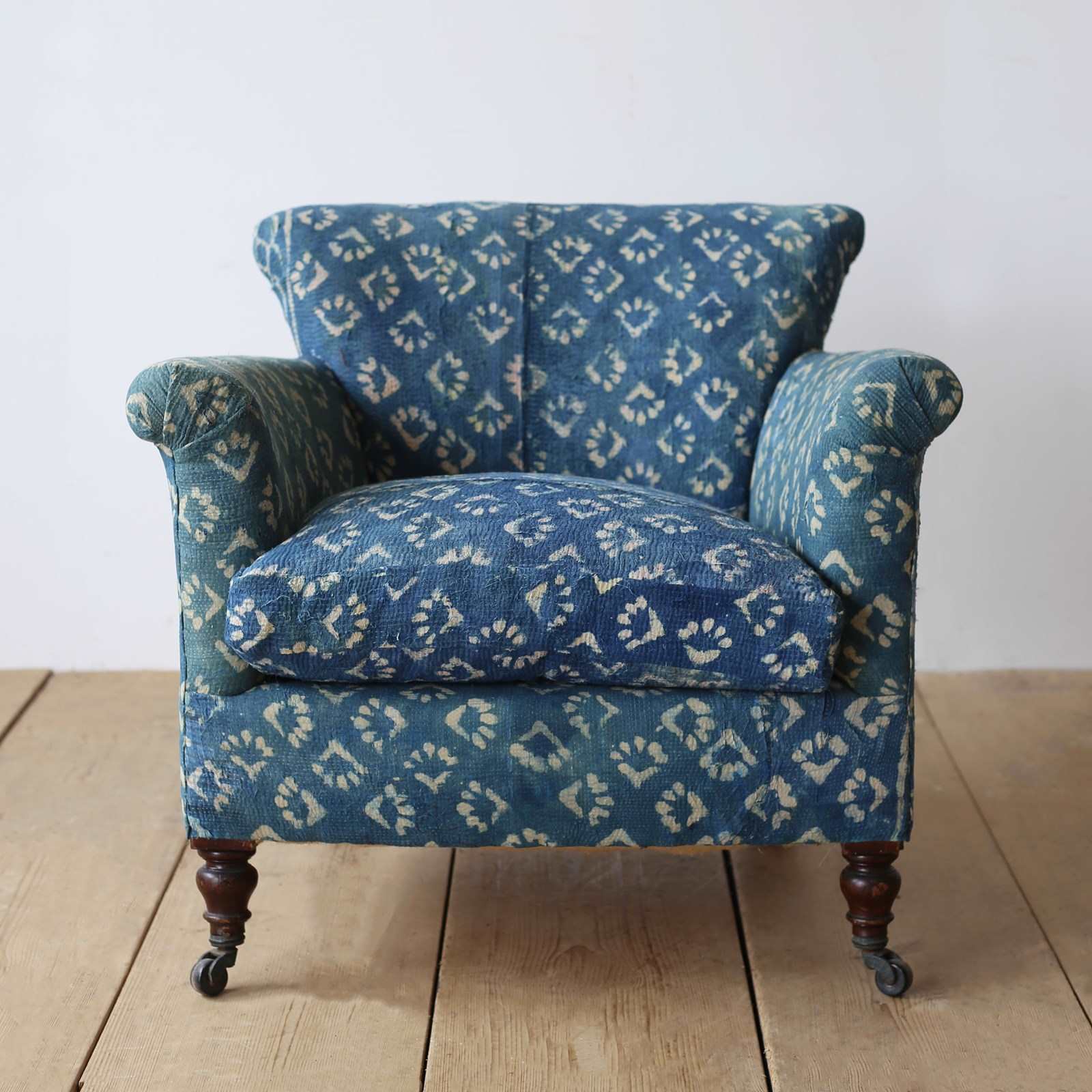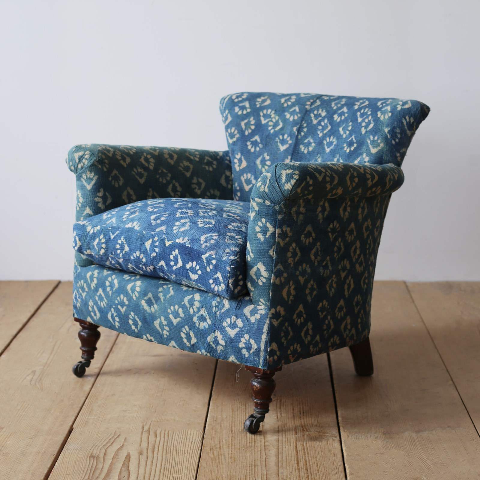 Woodstock style armchair re upholstered in indigo linen, on walnut legs and original castors.