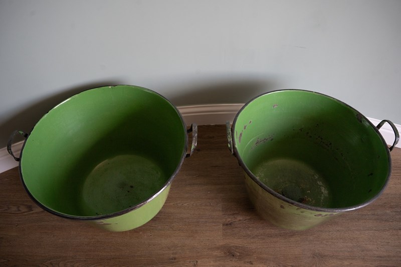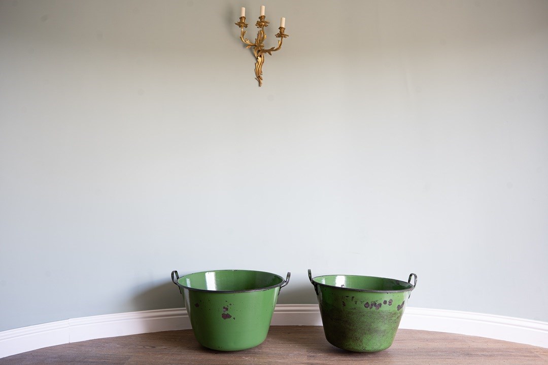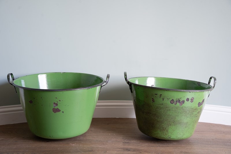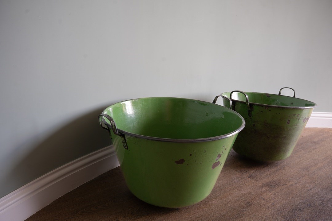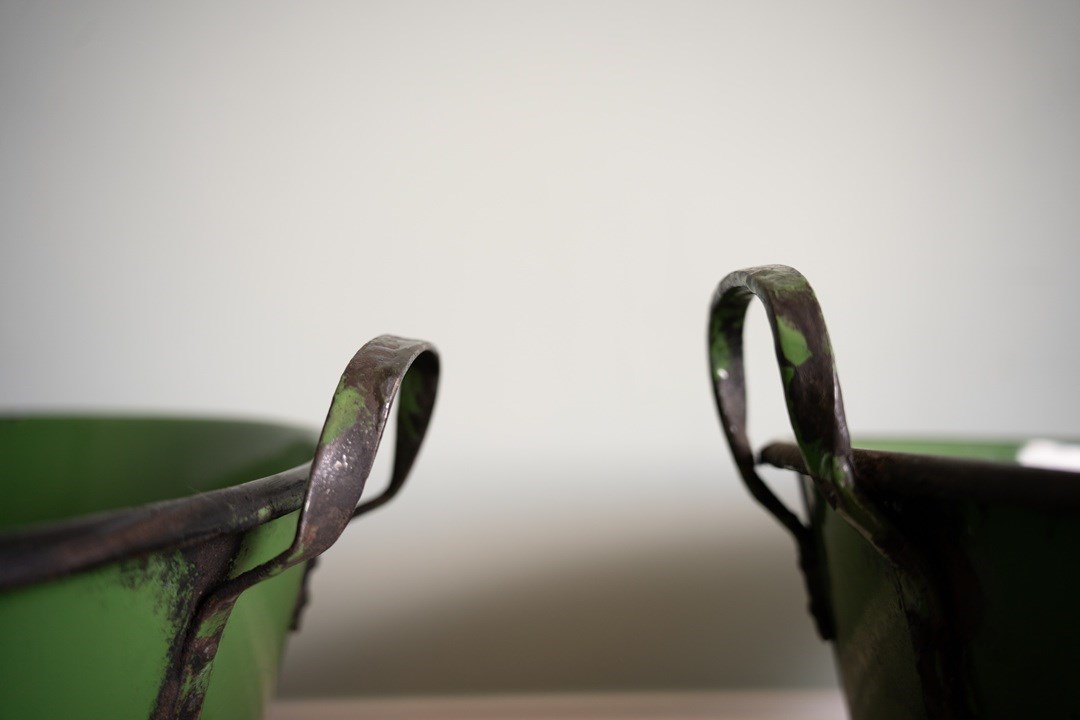 A vibrant green pair of large garden planters with excellent depth and width, ideal for planting lots of flowers or deep-rooted plants. These have been sourced from Hungary and were originally used for cooking food. They have been cleaned and now repurposed. Each large twin handled planters are, when empty, easy to manoeuvre. Currently no drainage holes.