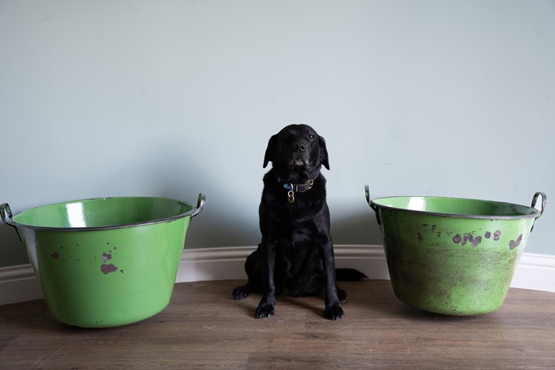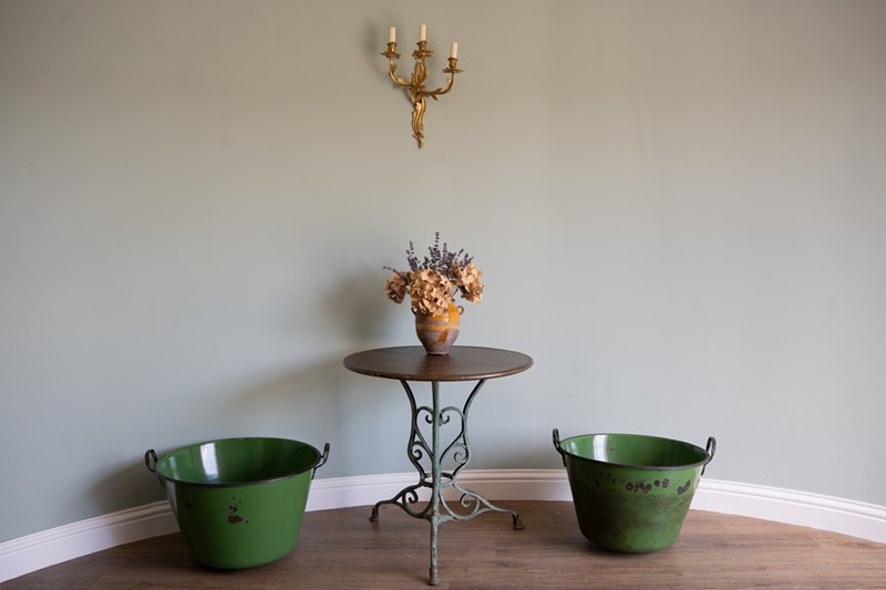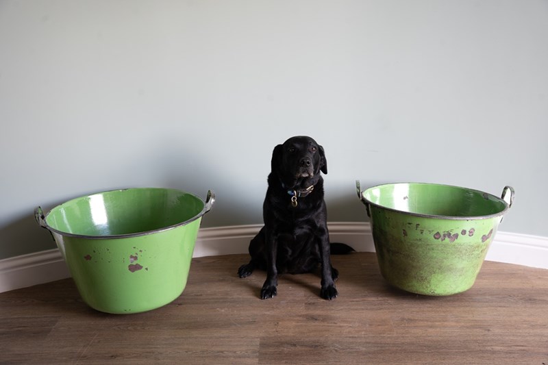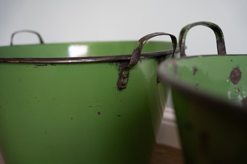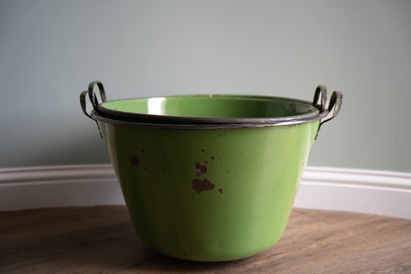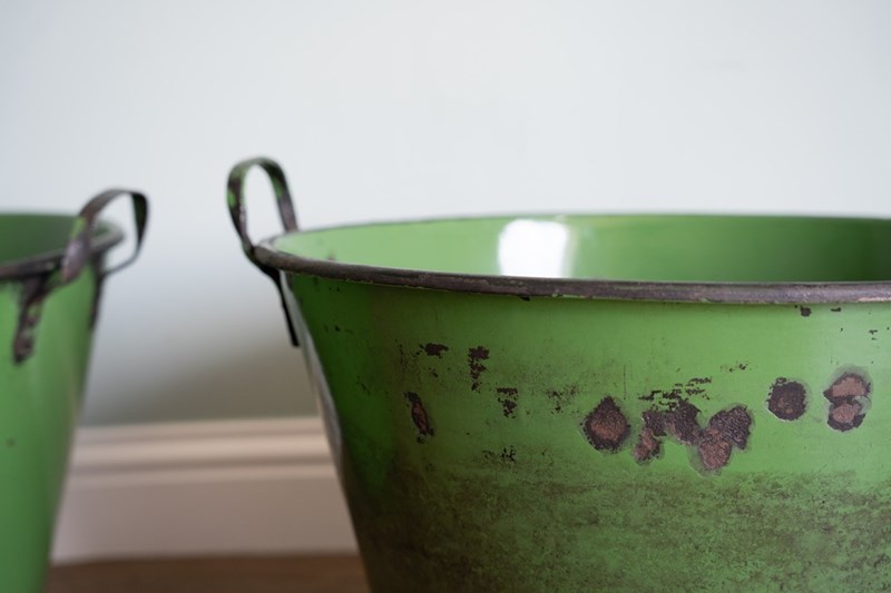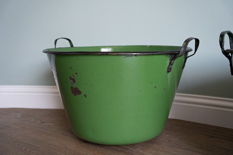 A vibrant green pair of large garden planters with excellent depth and width, ideal for planting lots of flowers or deep-rooted plants. These have been sourced from Hungary and were originally used for cooking food. They have been cleaned and now repurposed. Each large twin handled planters are, when empty, easy to manoeuvre. Currently no drainage holes.