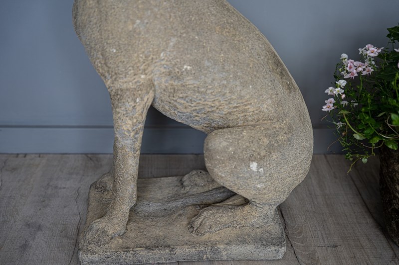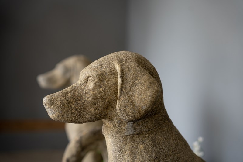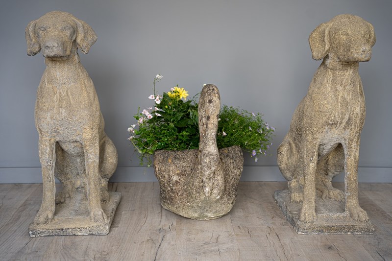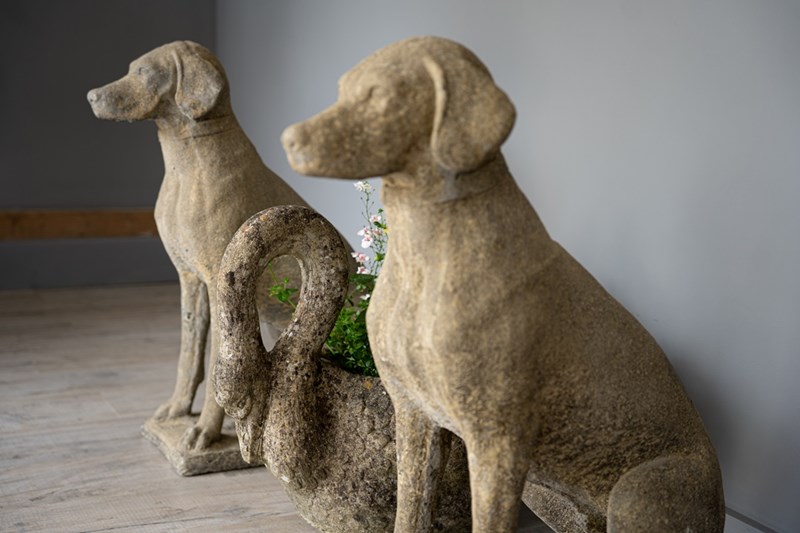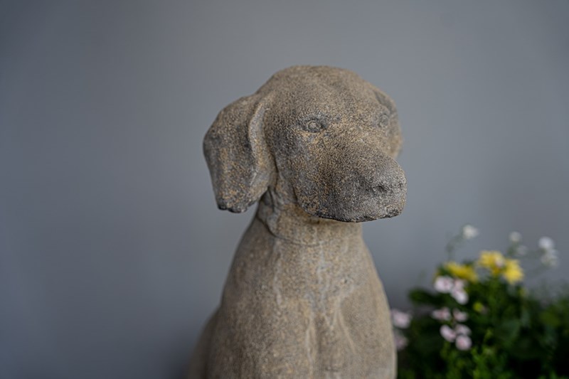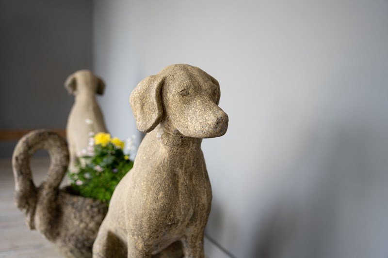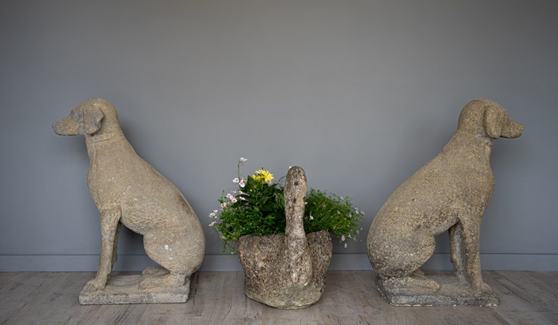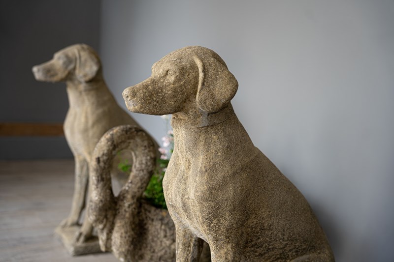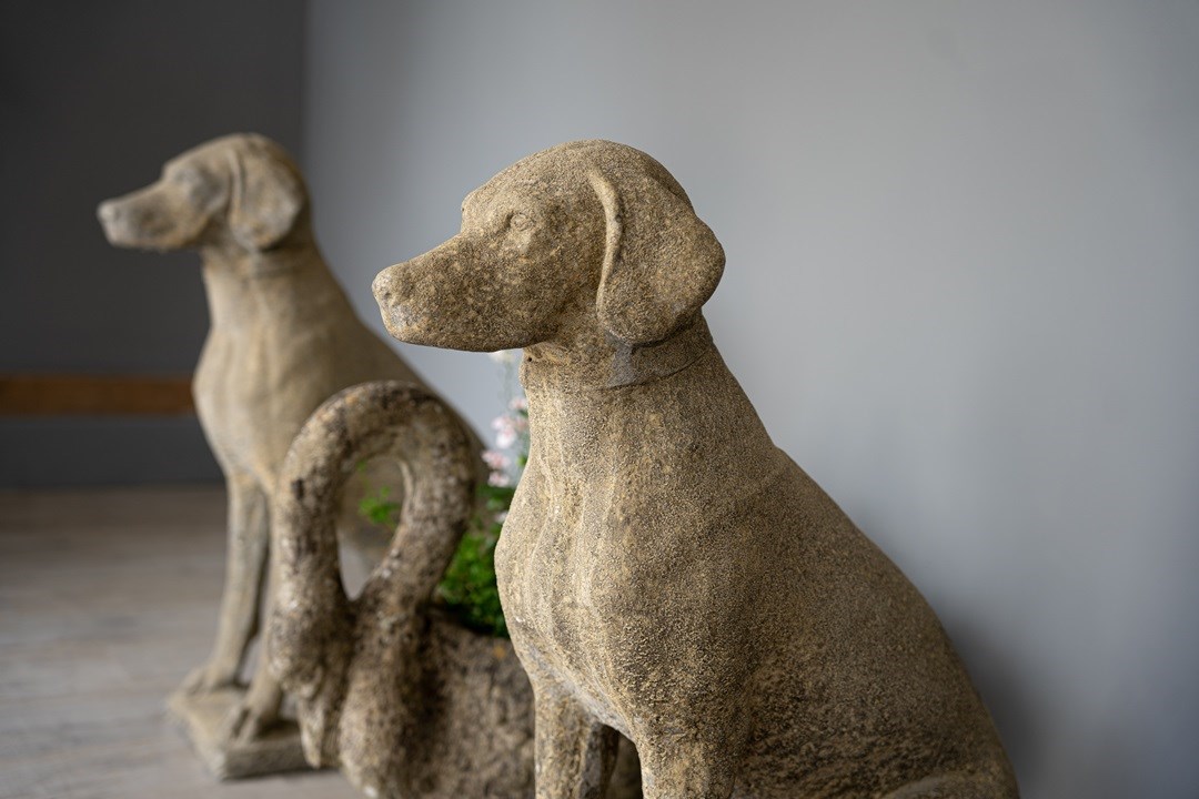 A charming pair of cast stone seated hounds in excellent condition and good quality detail. These dogs would make a perfect addition on either side of a door or as patio decor for any dog lover’s home.