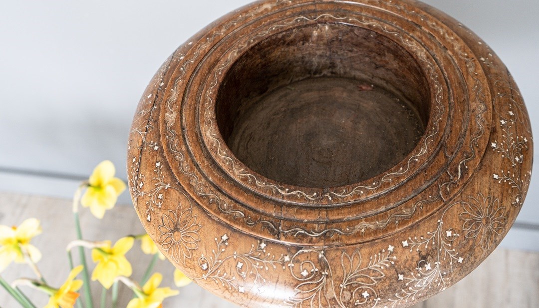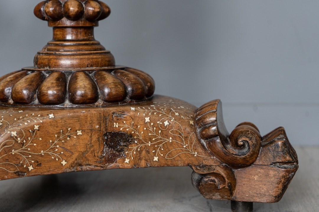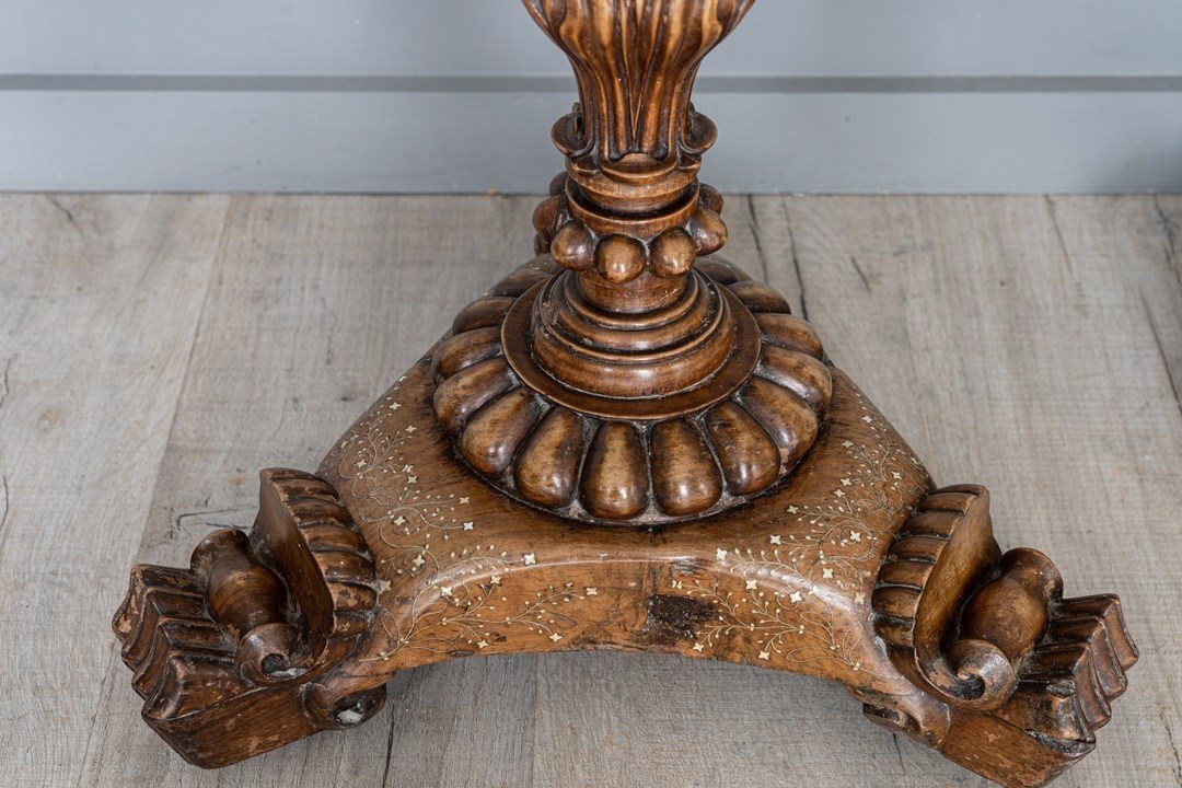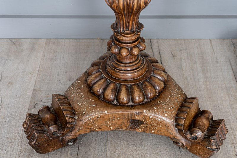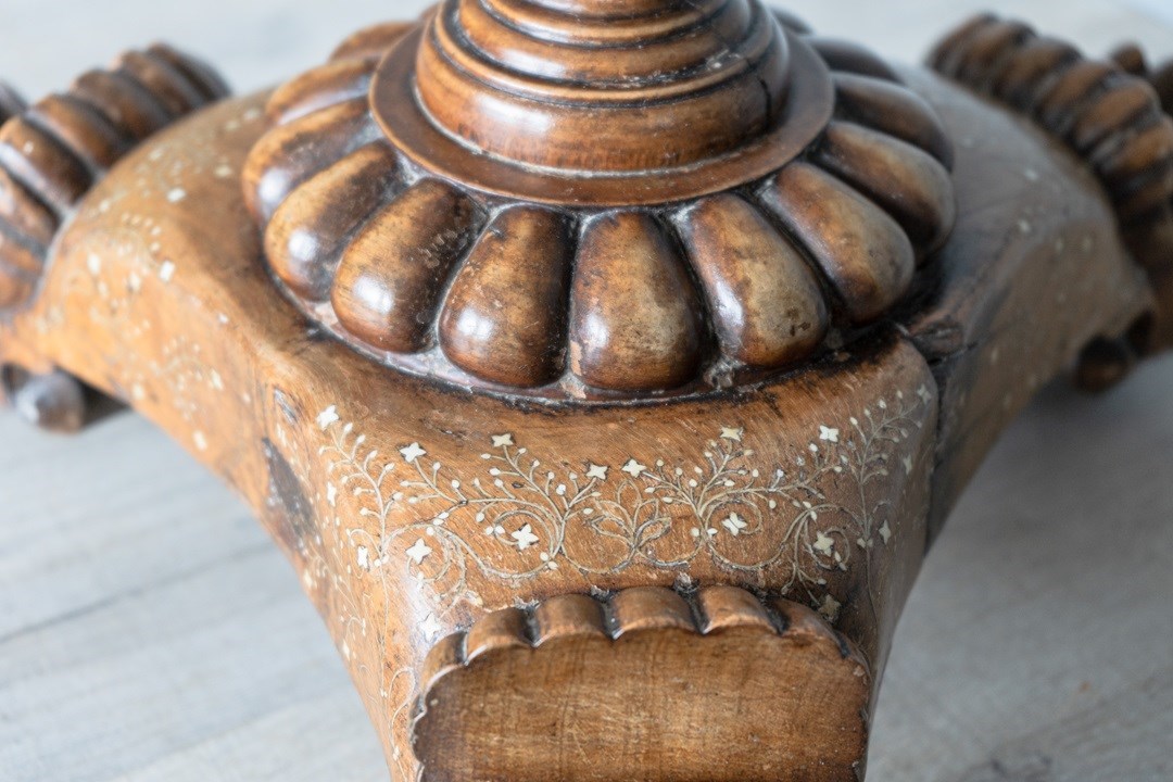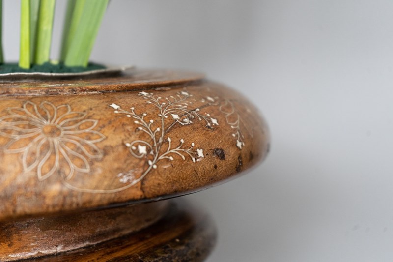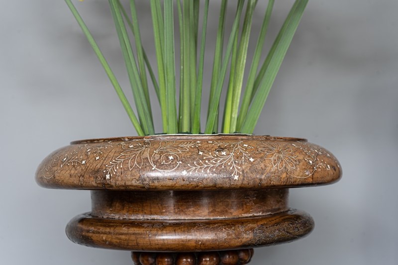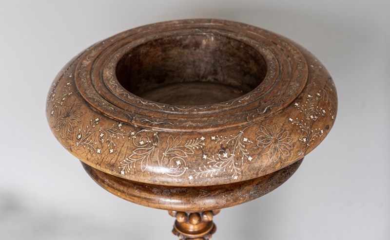A fine Anglo Indian Hoshiarpur inlayed plant stand or jardiniere. The traditional craftsmanship of the Indian process of inlay is a painstakingly intricate one, a technique of skill and patience. The method of engraving various small motifs came from Hoshiarpur, a city in Punjab. The wood is most probably rosewood.
