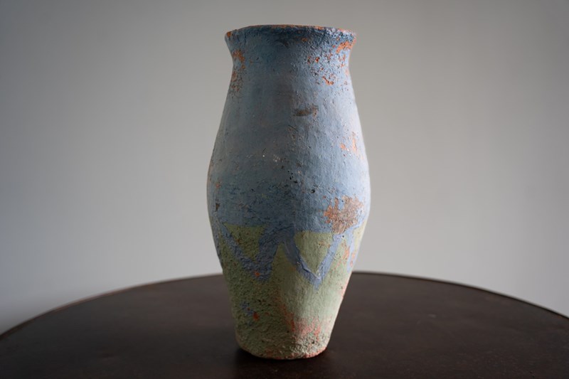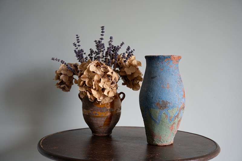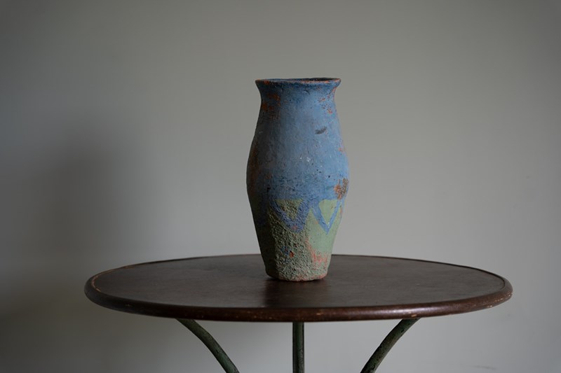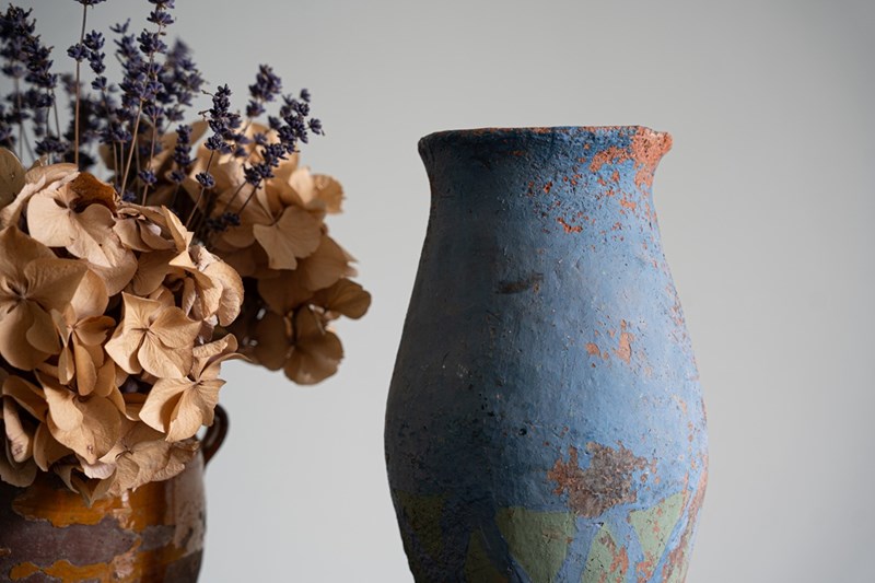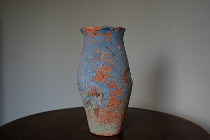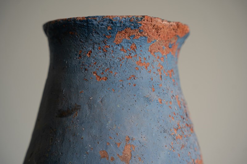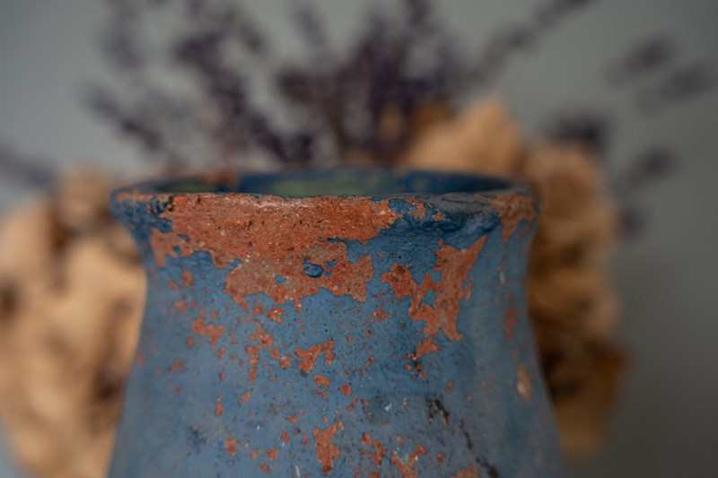A very rare, extremely old, antique Terracotta vase from Turkey. Handmade, this authentic, decorative piece still has substantial vibrant blue colours showing through. Very much a one-of-a-kind antique vase for the home.