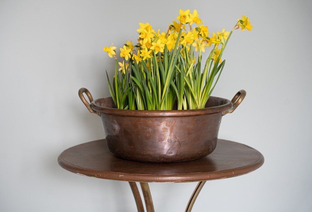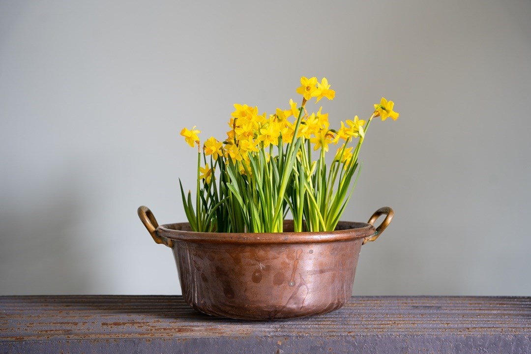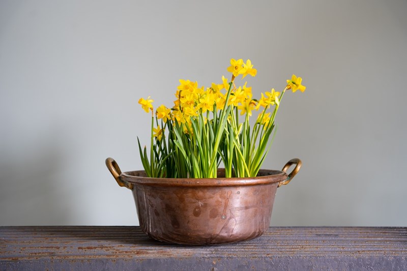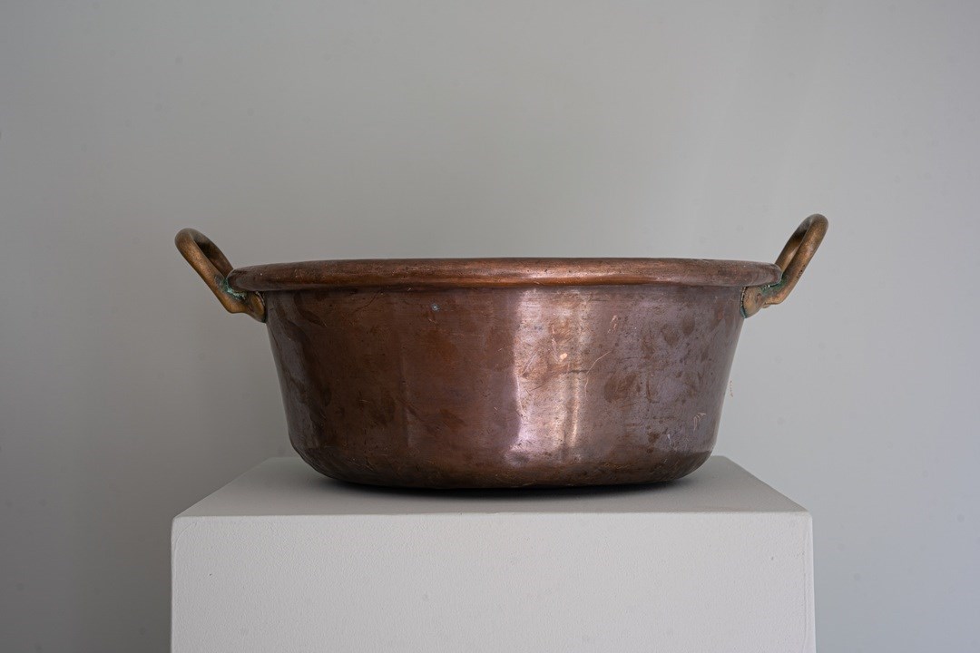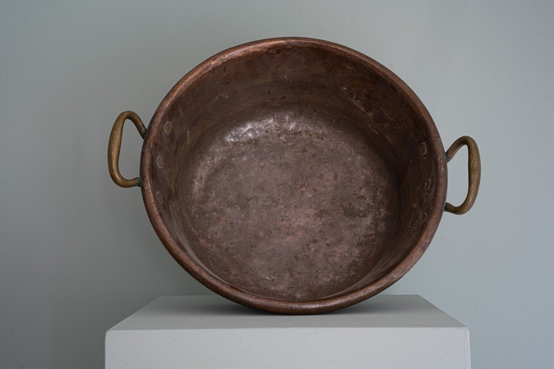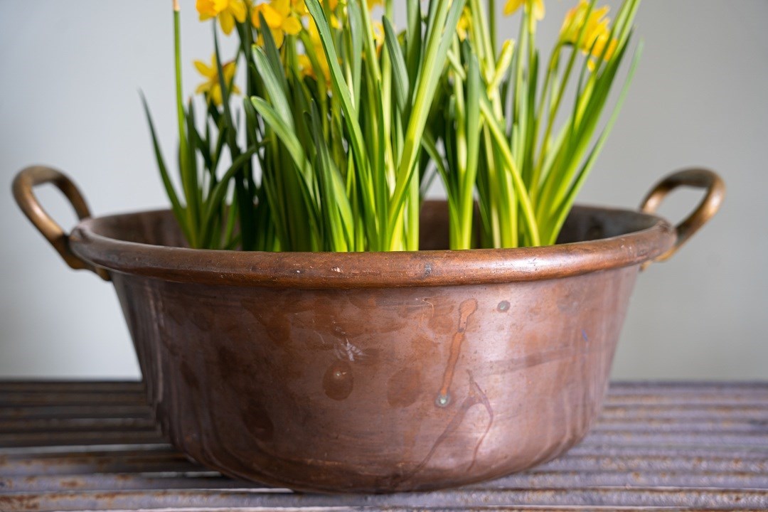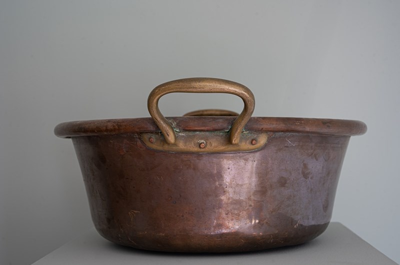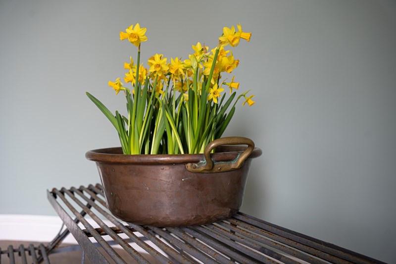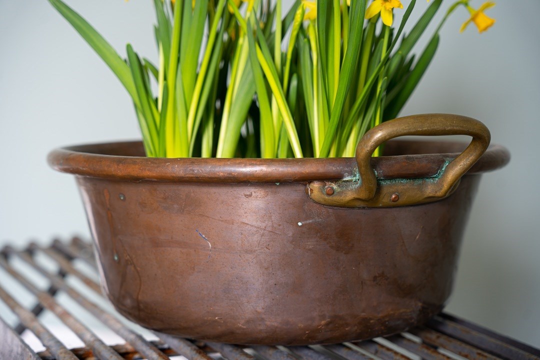 Very attractive antique copper pot planter, ideal for use as a decorative piece in your home. This simple yet elegant antique riveted pot features a cast iron handle either side. Its riveted construction is well-preserved, free from the usual dents or damage expected with age. There are no holes or later-added drainage points.