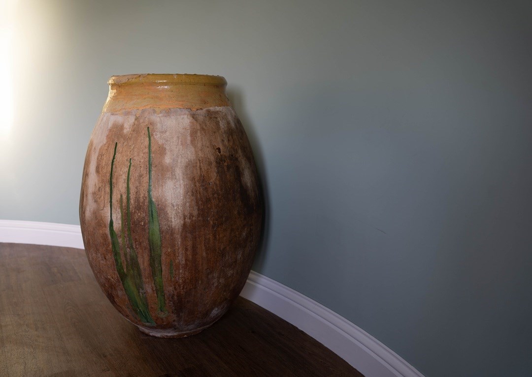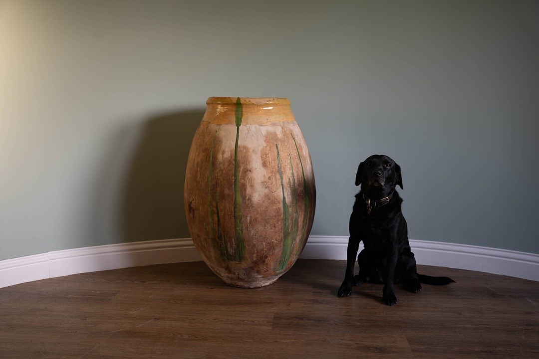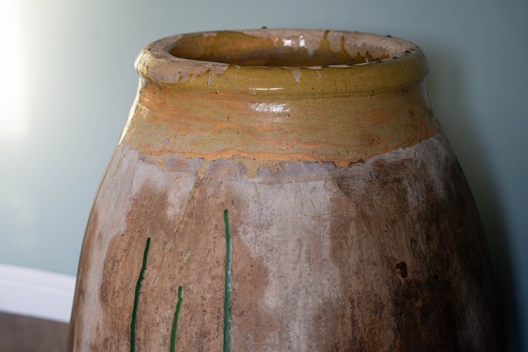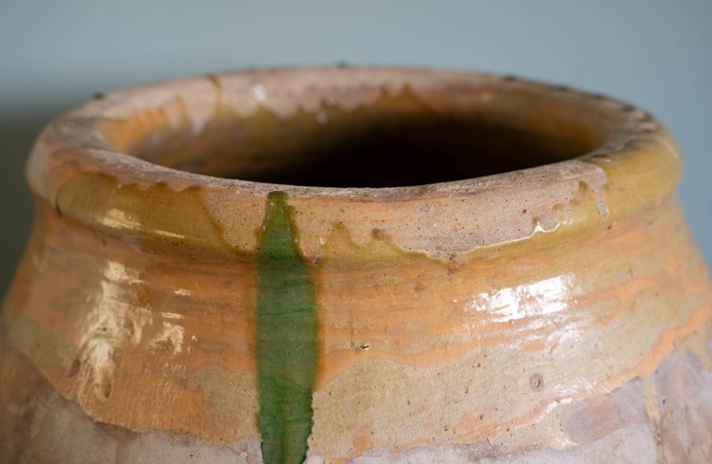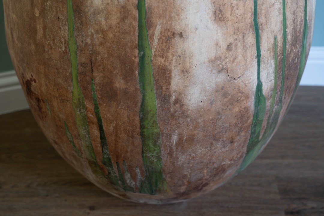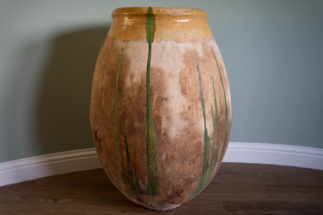 A truly special antique Biot from Southern France. This bulbous, floor-standing statement piece is equally at home indoors or outdoors. Thickly hand-crafted in the late 1800s to early 1900s, its robust construction allows it to withstand even a British winter when placed outside. With its green dribbles down the body and traditional yellow glaze around the neck, this solid jarre stands at nearly 3 feet high.