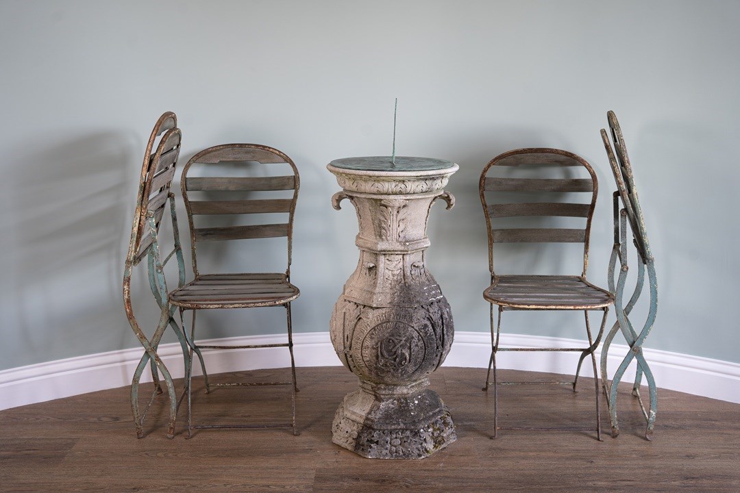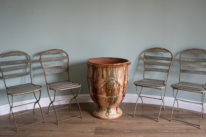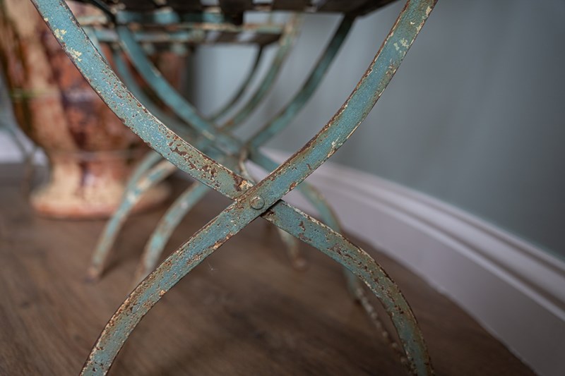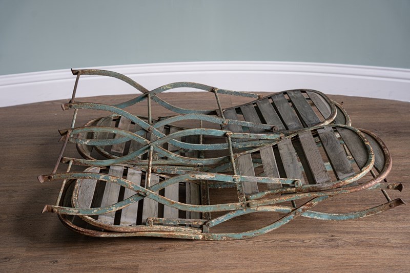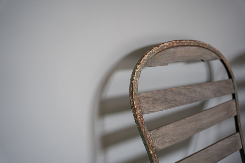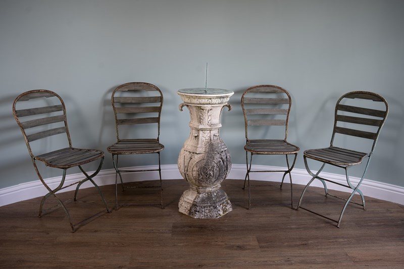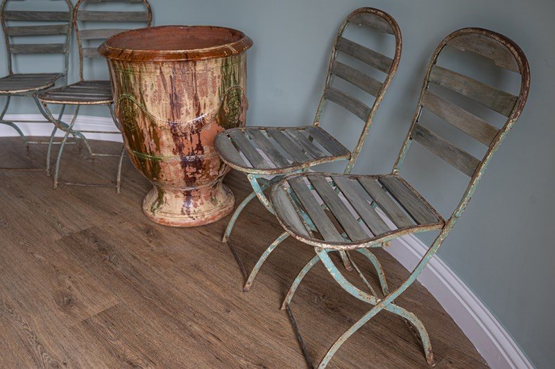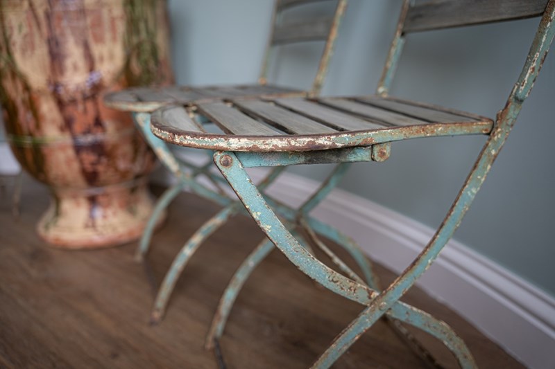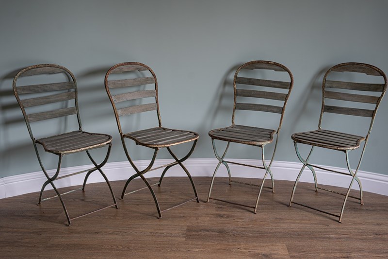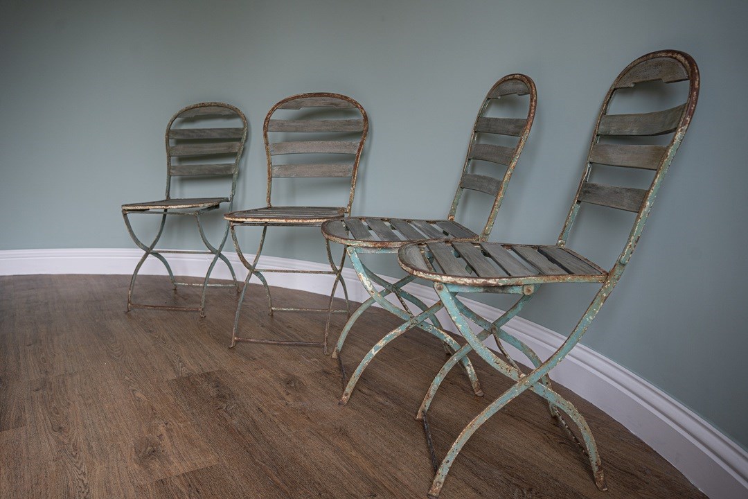 A set of four excellent vintage French folding chairs for the garden. All wood slats are in good condition and fold comfortably away after use. With its original colouring of a blue-green paint this set would make a lovely addition to any garden setting. Seat Height 45cms