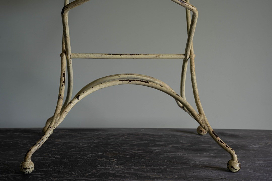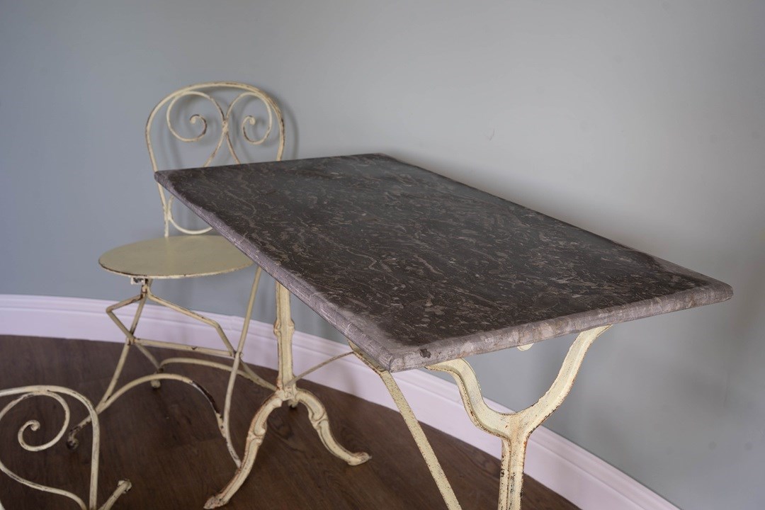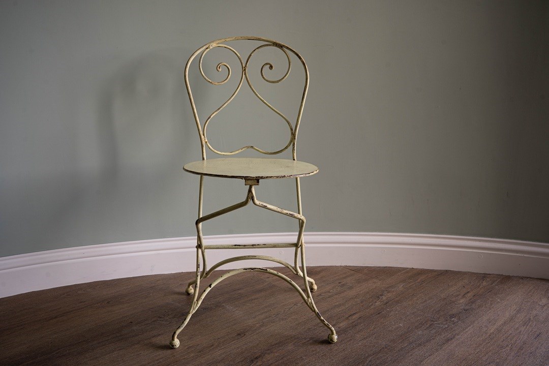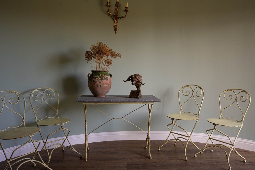 A delightful antique garden furniture set comprising four folding iron chairs and a dining table with a removable slate tabletop. Extremely sturdy and with some weight, this will be a perfect set to pack away during the winter months. Sourced from the South of France, the folding iron chairs and the table have a yellow lime patina. All in excellent condition. We particularly love the clever design of the chairs to fold, but quite an artform to remember each time!