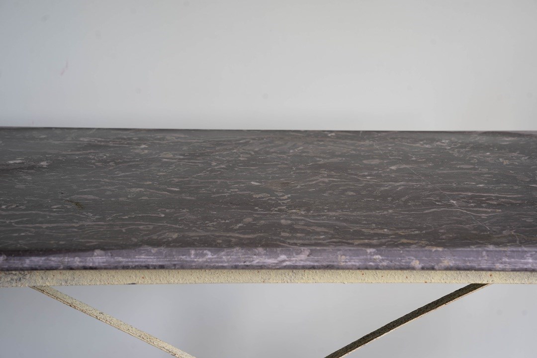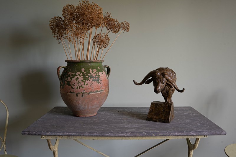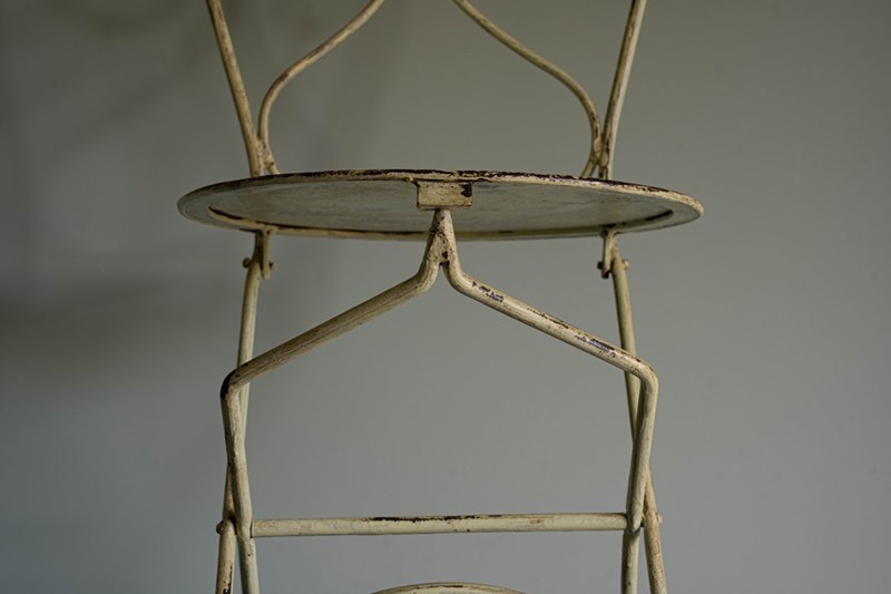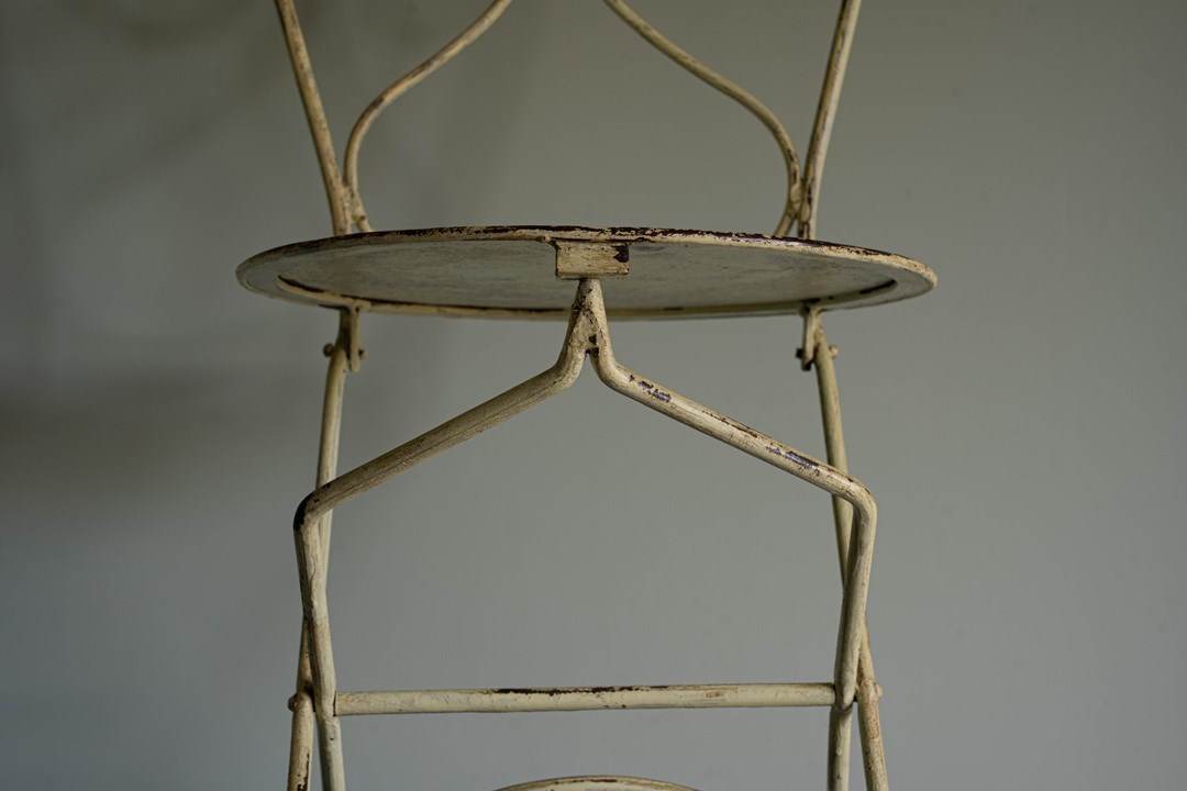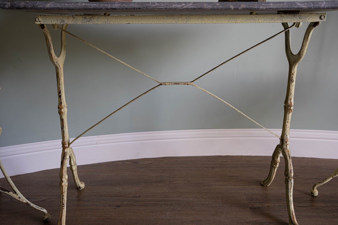 A delightful antique garden furniture set comprising four folding iron chairs and a dining table with a removable slate tabletop. Extremely sturdy and with some weight, this will be a perfect set to pack away during the winter months. Sourced from the South of France, the folding iron chairs and the table have a yellow lime patina. All in excellent condition. We particularly love the clever design of the chairs to fold, but quite an artform to remember each time!