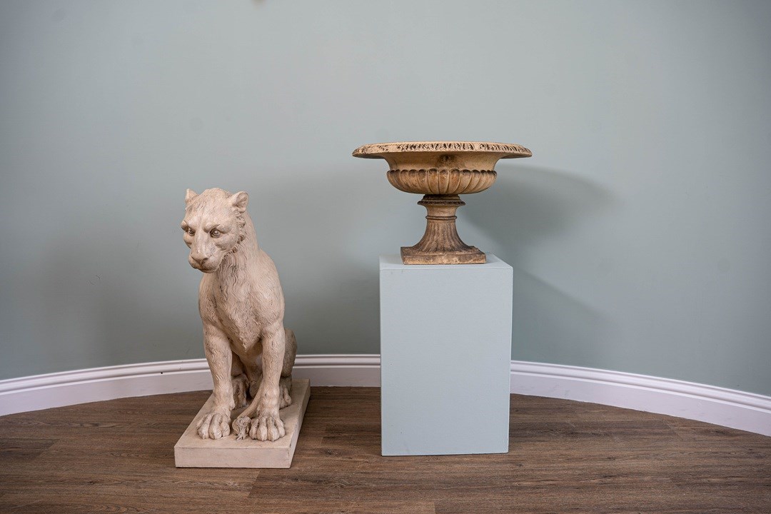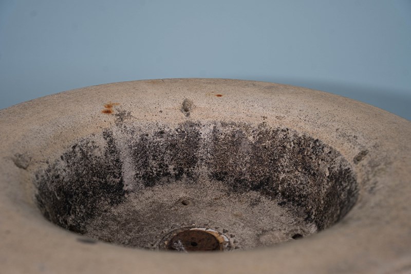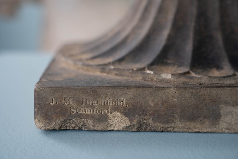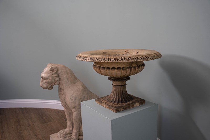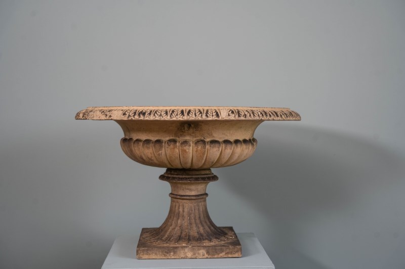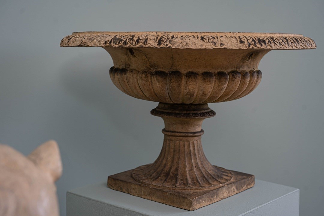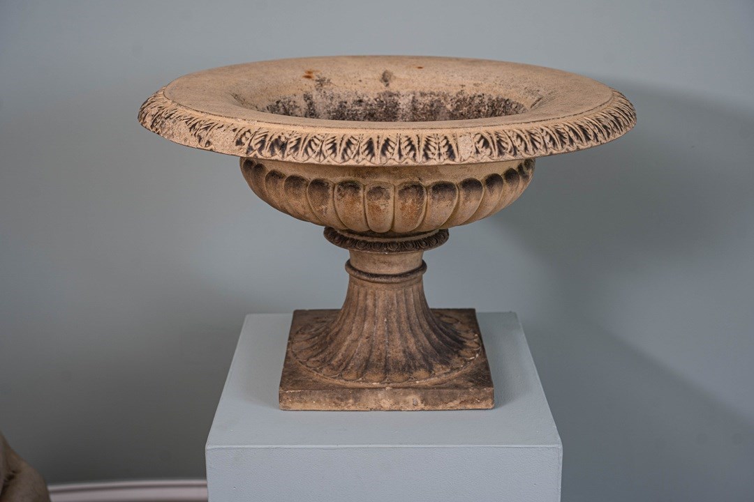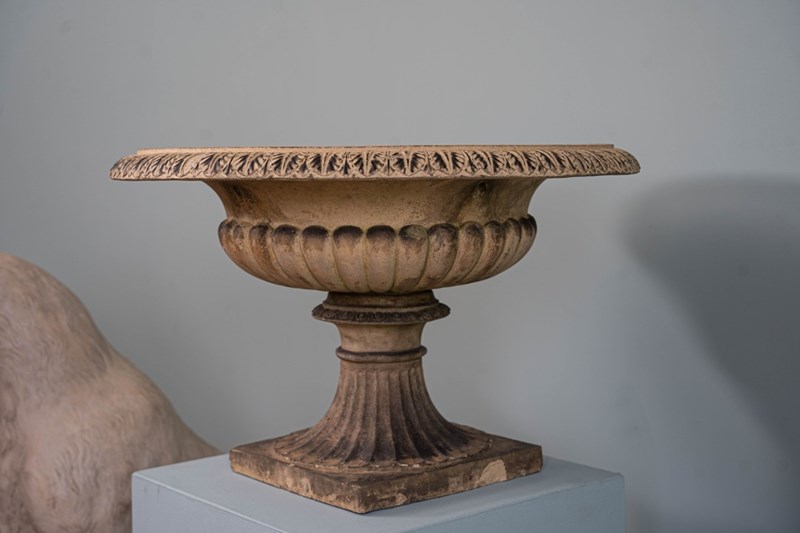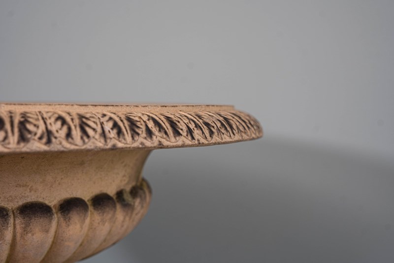 A charming, petite, late 1800’s buff terracotta garden urn by J M Blashfield. With acanthus moulded rim and a gadrooned body raised on a fluted column, this has the markers stamp to the square base. Although historically manufactured and a garden urn, because of its size, this would also be perfect for indoor decoration as well as the garden. Original drainage holes