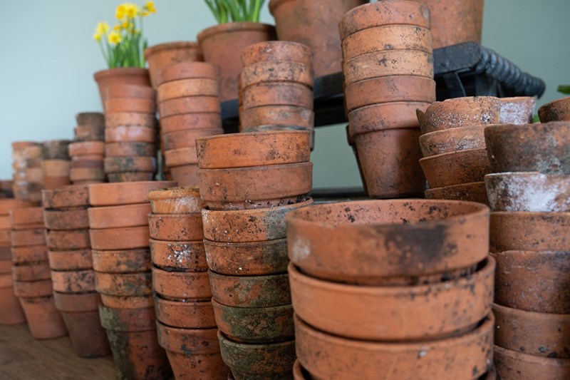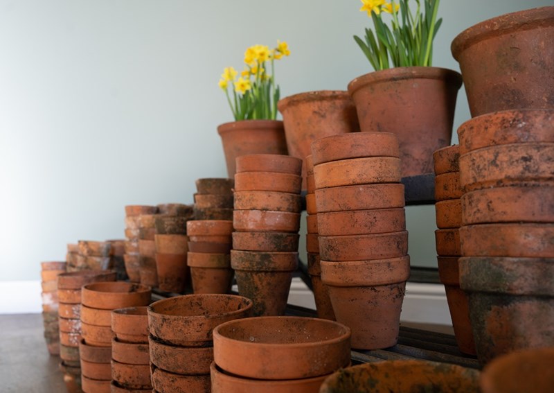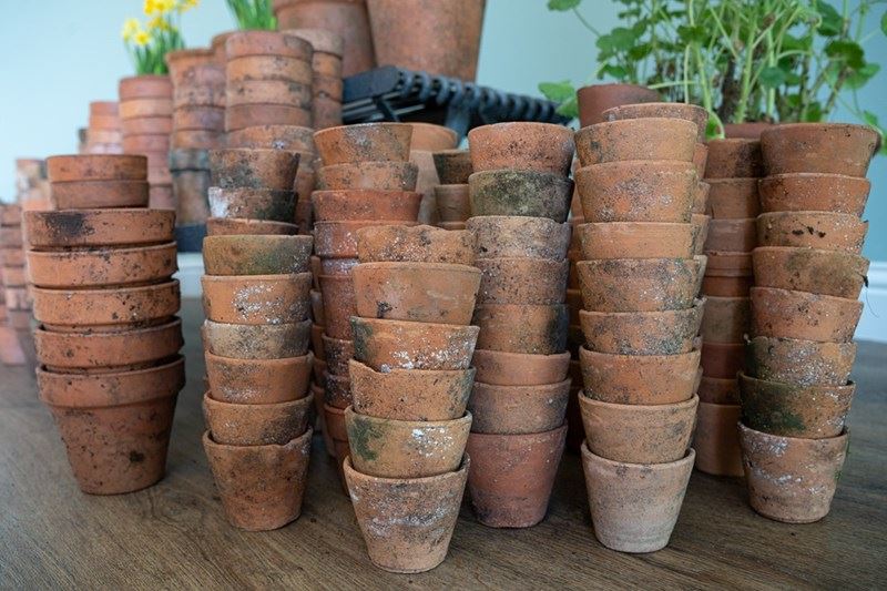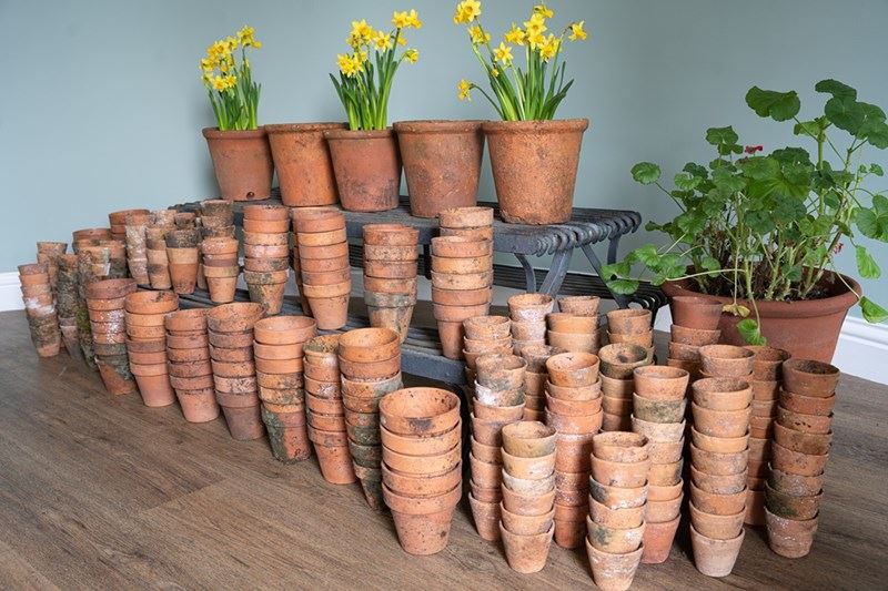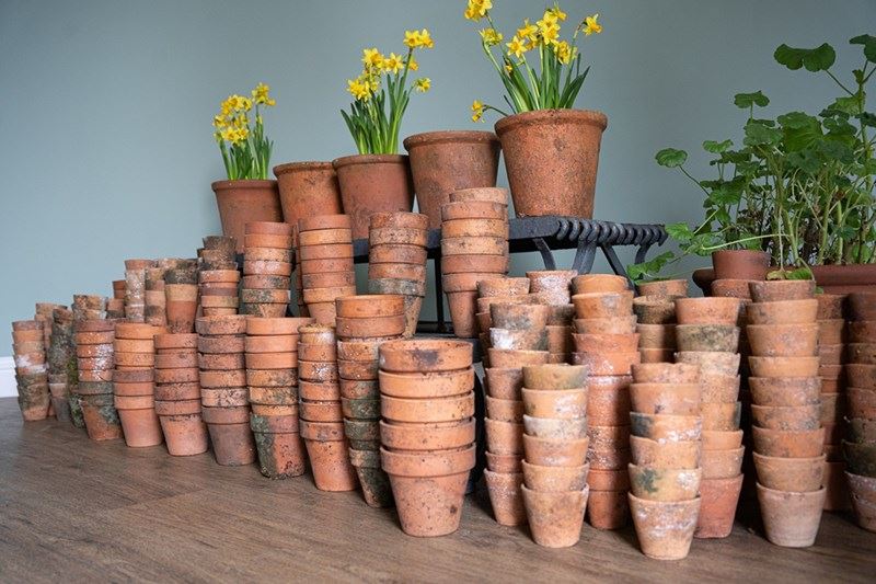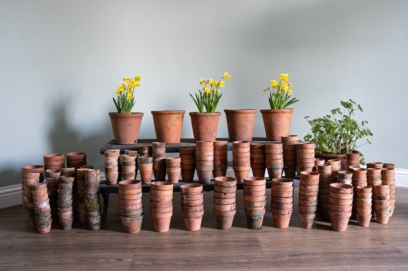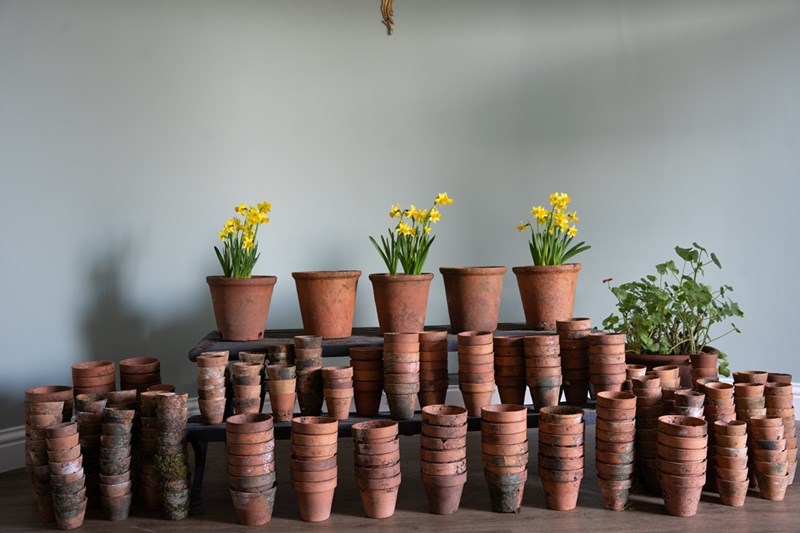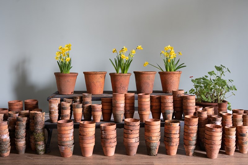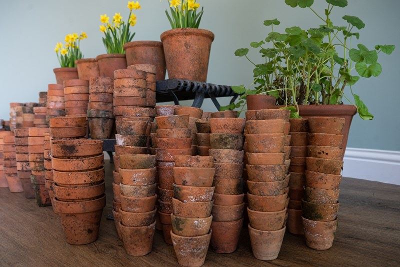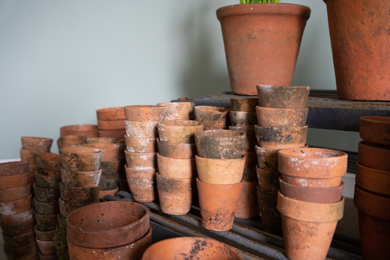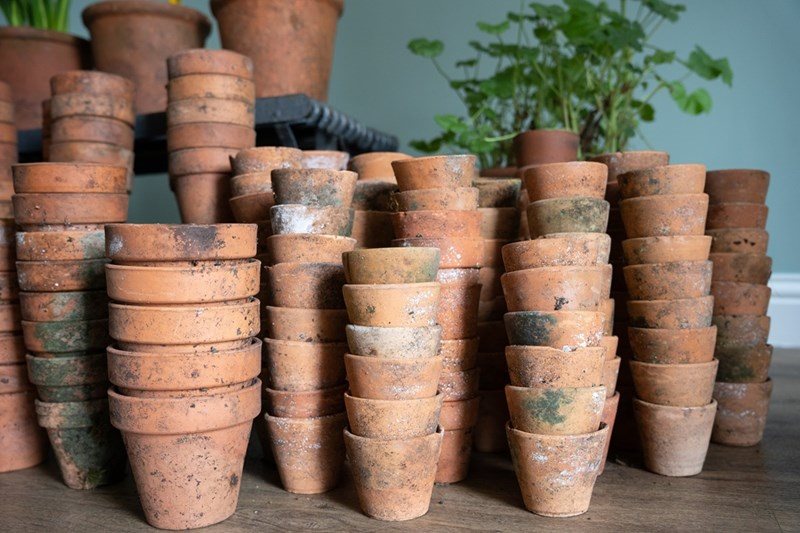 A large variety of small terracotta plant pots for garden lovers. We count just over 250 used small seedling planters. Ranging from 3’’, 4’’ and 4.5’’ high, these are perfect for planting seeds and small plants and herbs. Please note, the larger pots are for sale but on another page. All previously used, some with the most delightful patina, these outdoor pots are perfect for gardeners who don’t fancy the plastic alternatives.