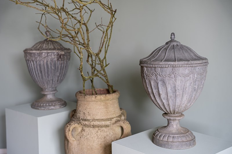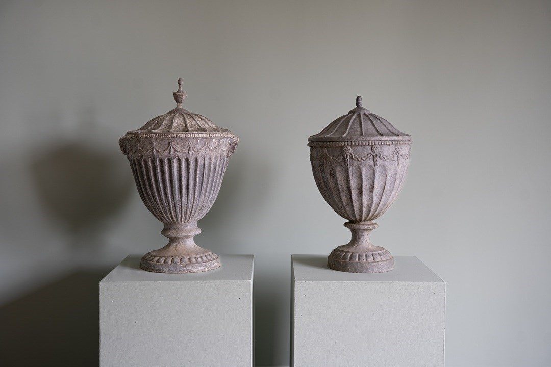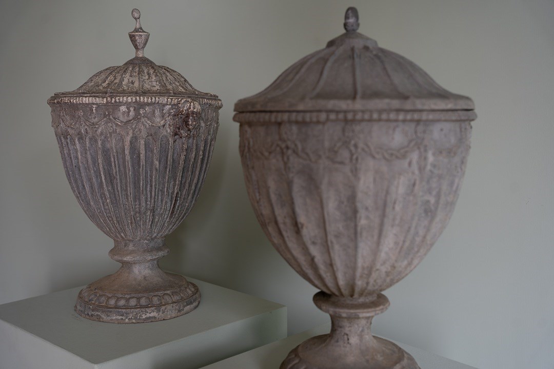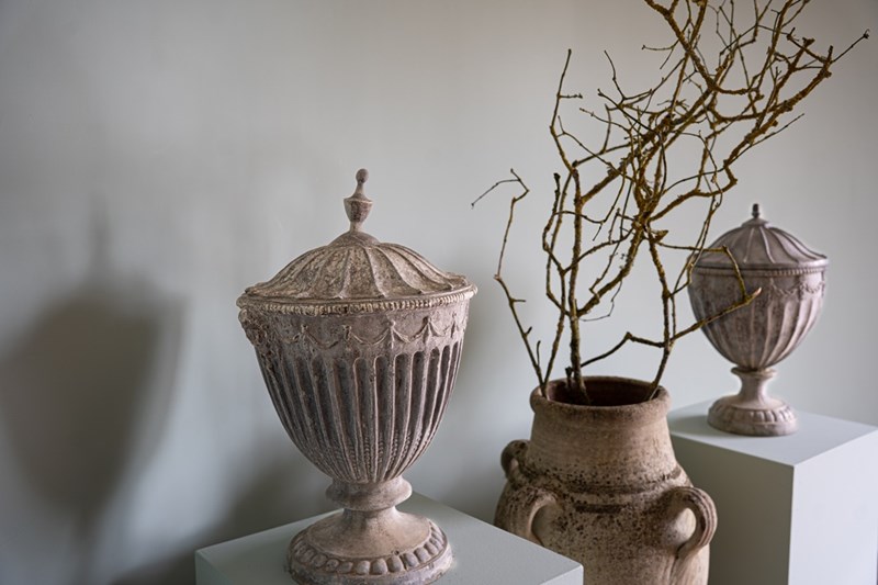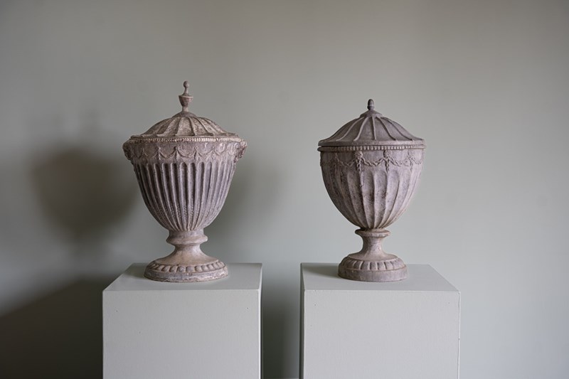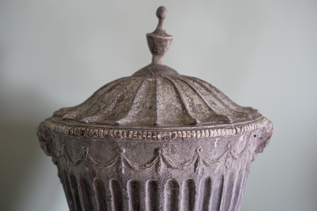 A near pair of antique, nicely weathered garden lead lidded urns. Each antique lead garden urn has their own decorative patterns and finials with maidens faces on opposing sides and scrolled top. Great age and patina to these decorative garden pieces. With some misshaping commensurate with age, one urn has a detachable lid whilst the other, the lid is secured and was not designed to be removed.