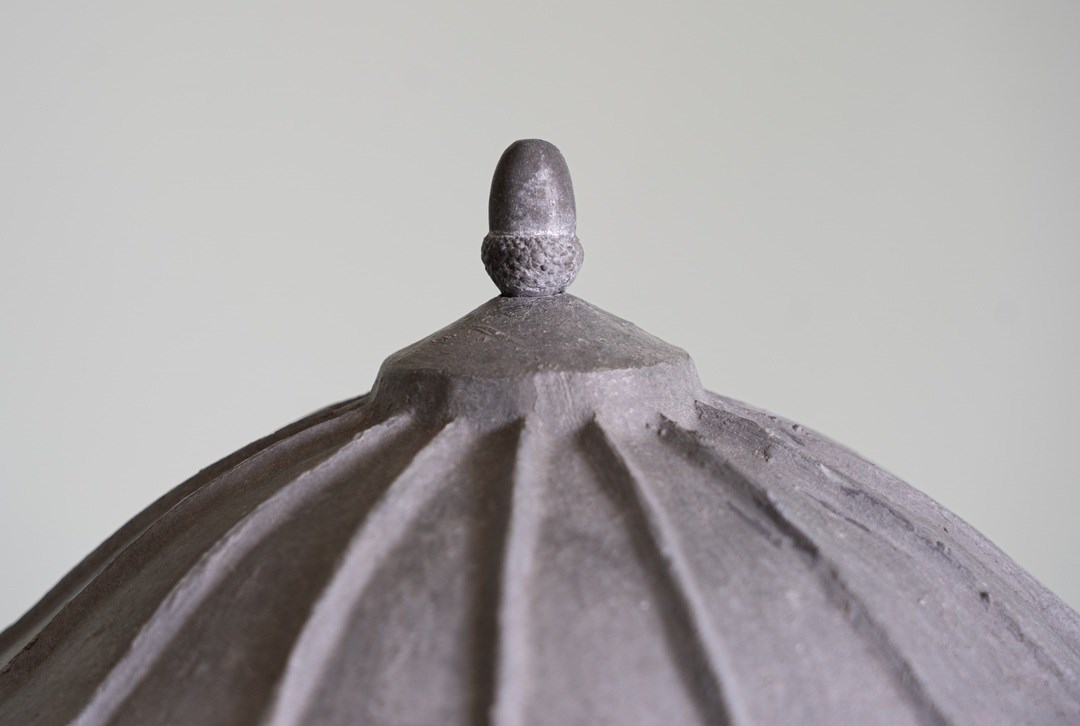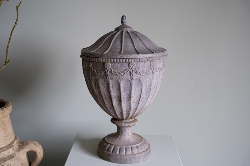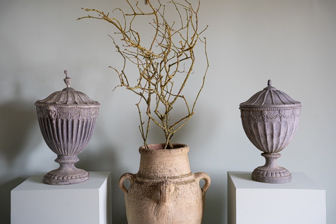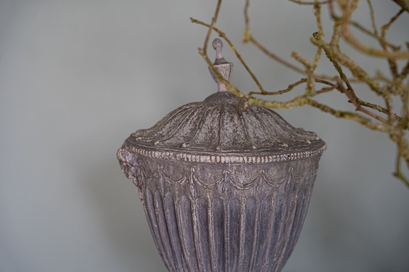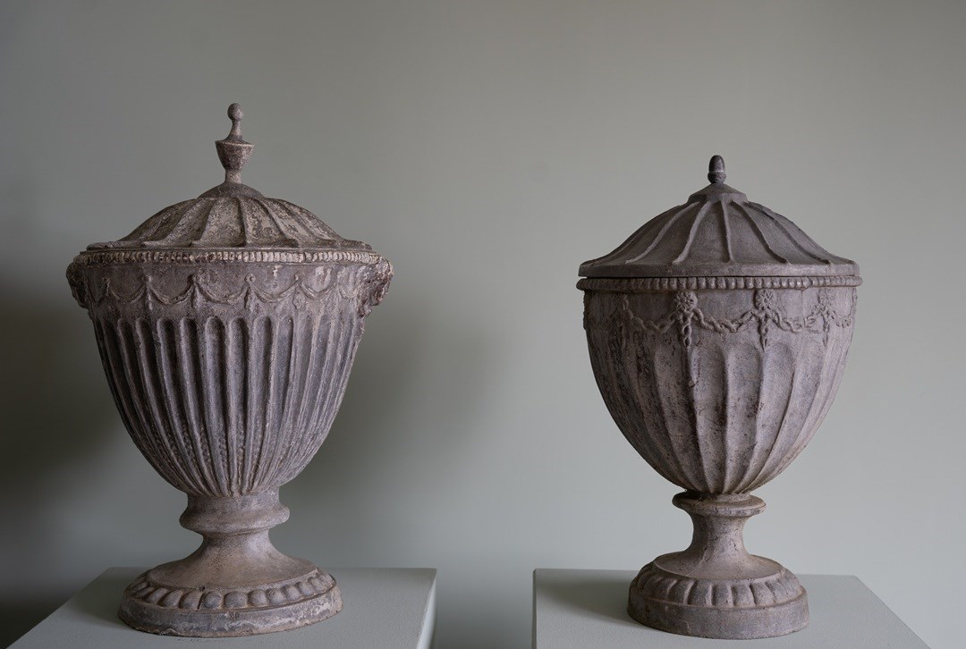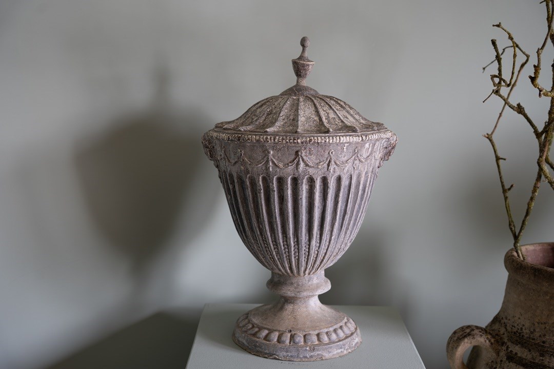 A near pair of antique, nicely weathered garden lead lidded urns. Each antique lead garden urn has their own decorative patterns and finials with maidens faces on opposing sides and scrolled top. Great age and patina to these decorative garden pieces. With some misshaping commensurate with age, one urn has a detachable lid whilst the other, the lid is secured and was not designed to be removed.