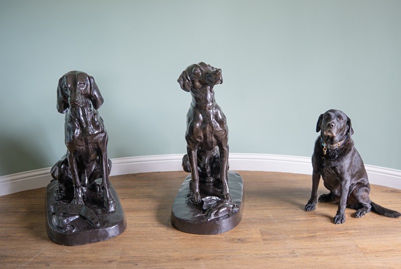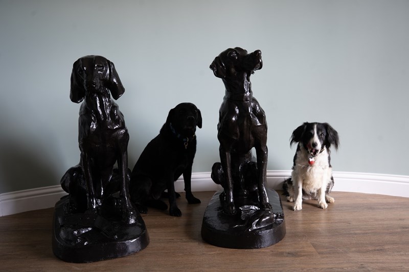 A pair of decorative, cast iron garden dog statues. We have repainted these hound statues in a dark brown paint and are ready for a new home!