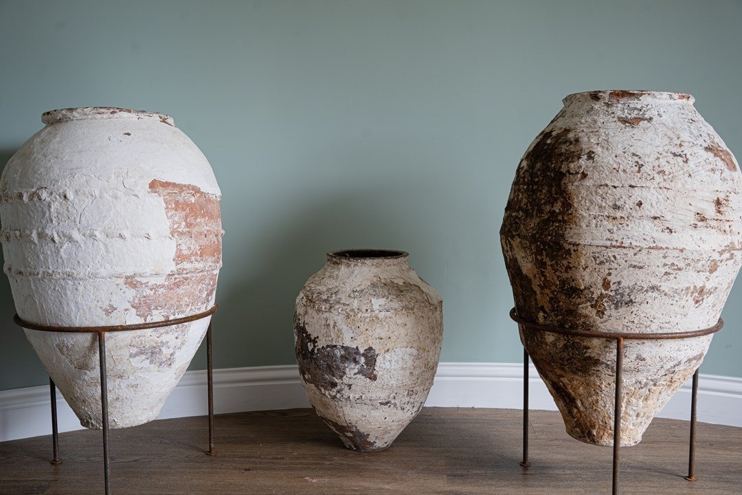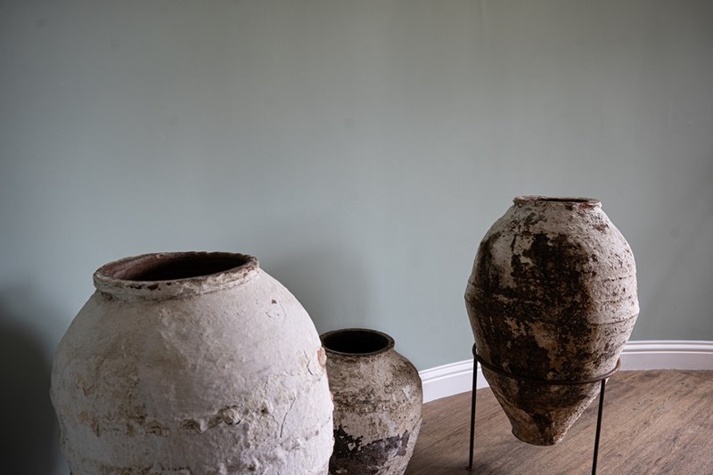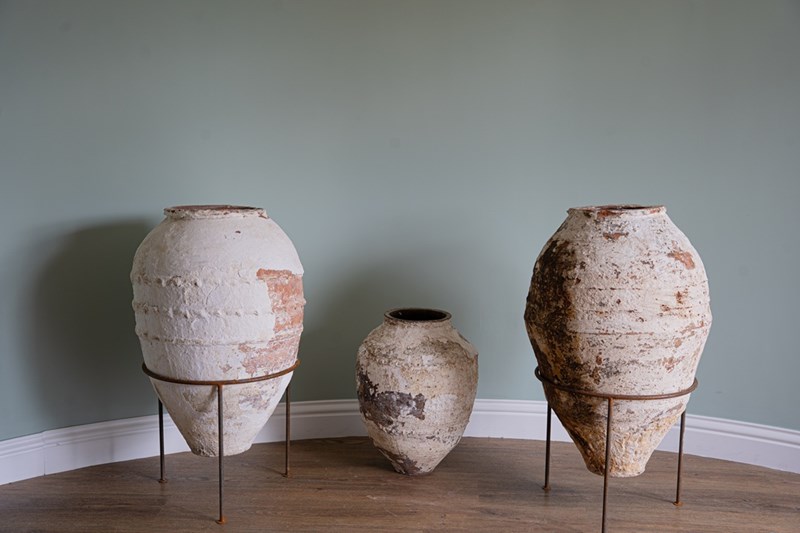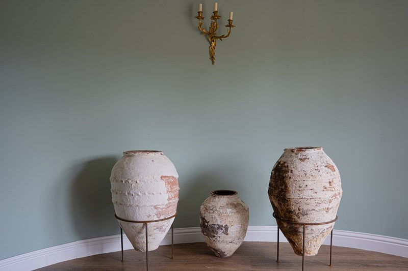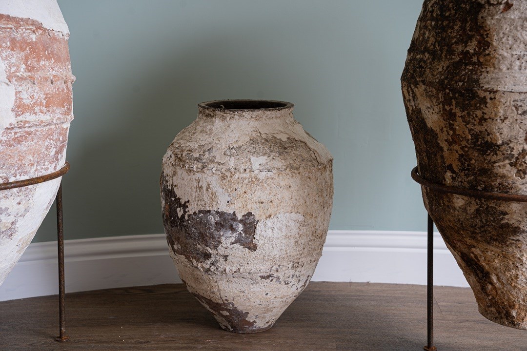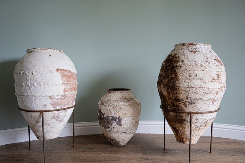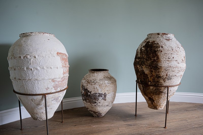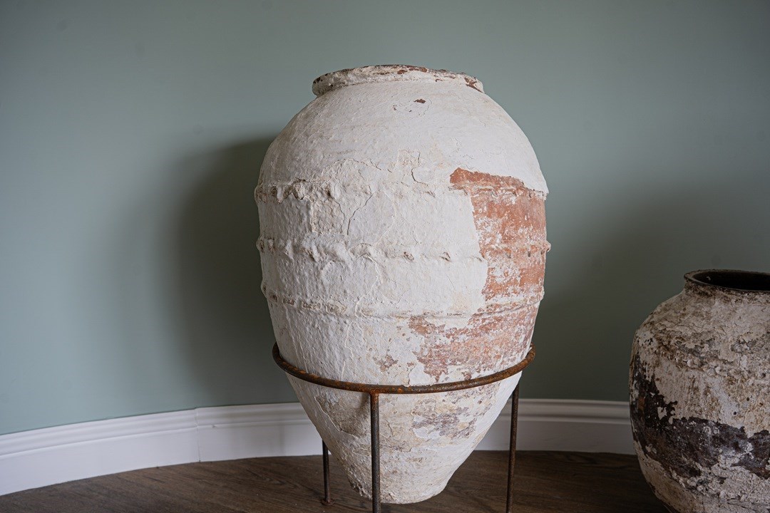 We have a trio of late 19th-century Turkish olive jars, once used to store olive oil and preserves, now make stunning decorative statement pieces for the garden or home. Two of these Turkish pots sit elegantly on a wrought iron tripod stand, elevating their presence and charm but also provide greater support. The attractive smaller antique olive jar can be sold separately, but three is a great number and perfect for showcasing such old Turkish pots. Over the decades, layers of flaky white paint have softened to a beautifully rustic, soft-whitened finish, with desirable patination that captures years of authentic use and ageing. Traditionally floor-standing vessels, these antique jars are now perfect as ornamental features for gardens, courtyards, or interior spaces. With their rich history, Mediterranean heritage, and timeless design, they are true stand-out must-haves that will delight collectors and garden designers alike.