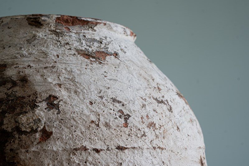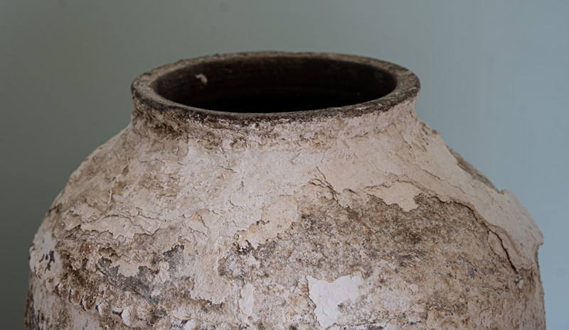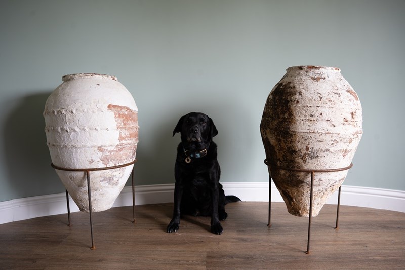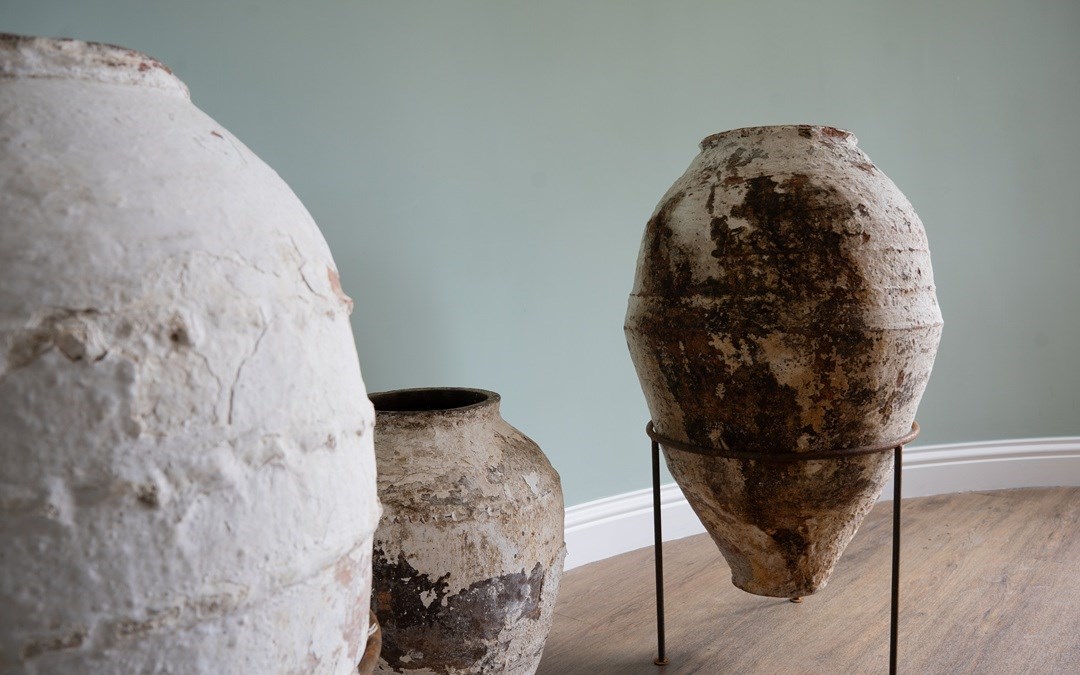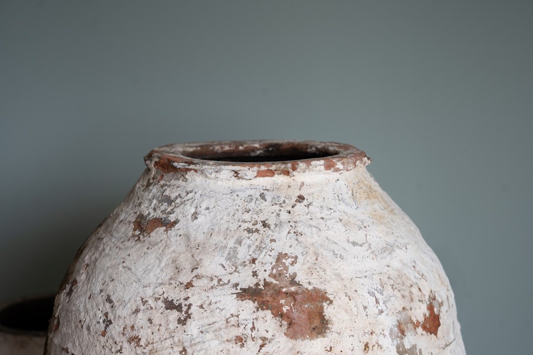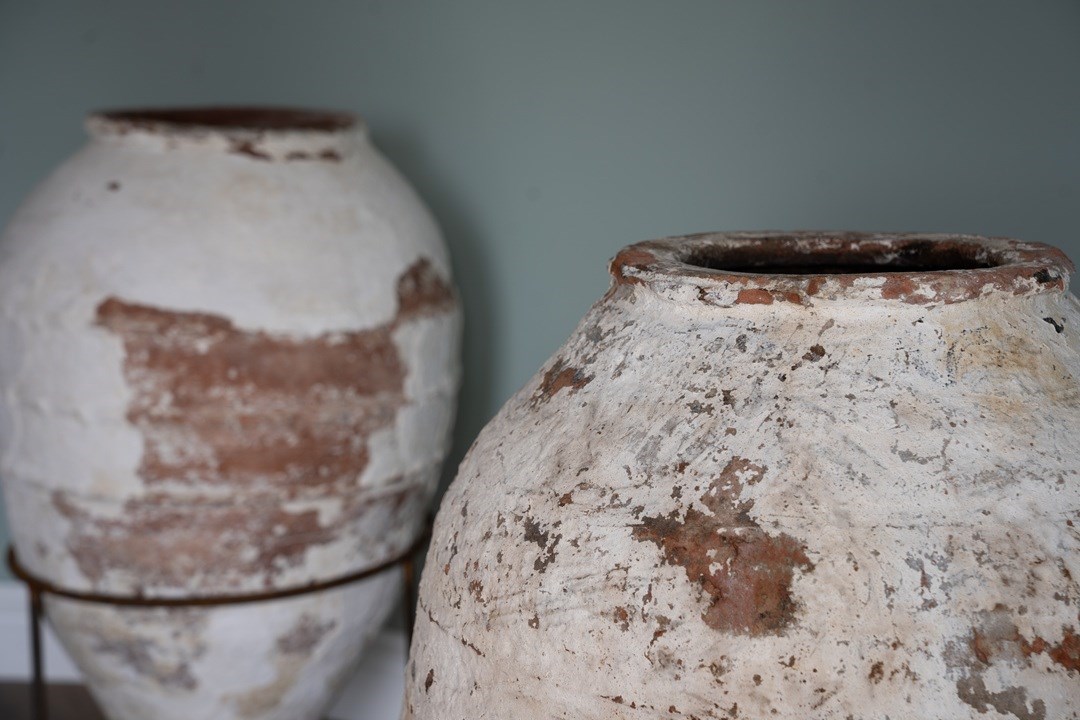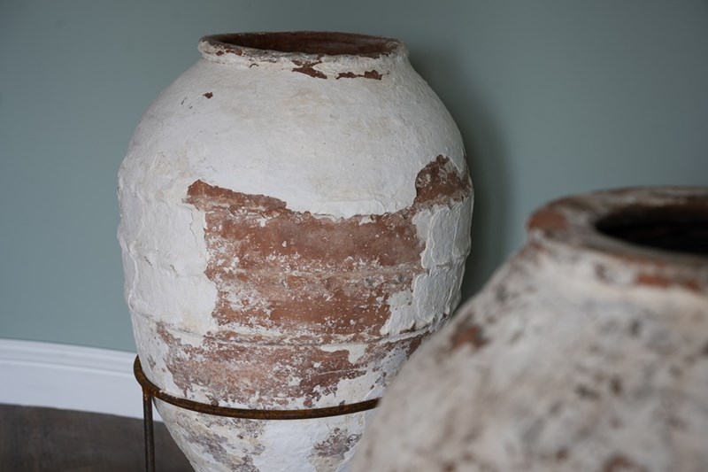 We have a trio of late 19th-century Turkish olive jars, once used to store olive oil and preserves, now make stunning decorative statement pieces for the garden or home. Two of these Turkish pots sit elegantly on a wrought iron tripod stand, elevating their presence and charm but also provide greater support. The attractive smaller antique olive jar can be sold separately, but three is a great number and perfect for showcasing such old Turkish pots. Over the decades, layers of flaky white paint have softened to a beautifully rustic, soft-whitened finish, with desirable patination that captures years of authentic use and ageing. Traditionally floor-standing vessels, these antique jars are now perfect as ornamental features for gardens, courtyards, or interior spaces. With their rich history, Mediterranean heritage, and timeless design, they are true stand-out must-haves that will delight collectors and garden designers alike.