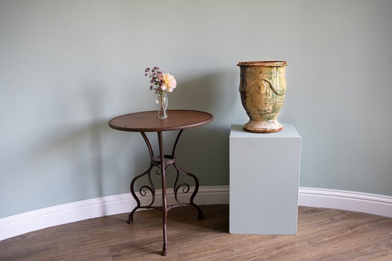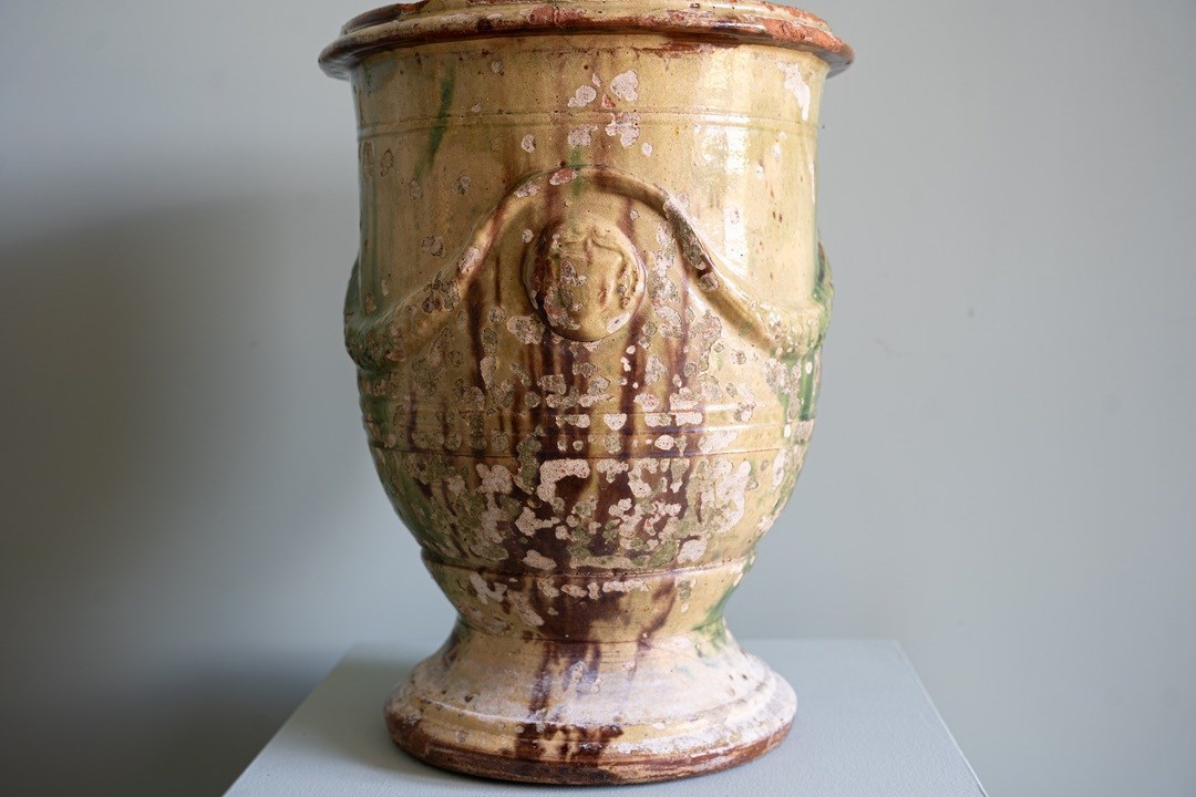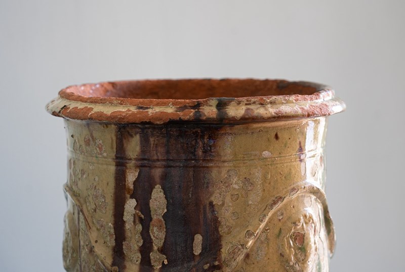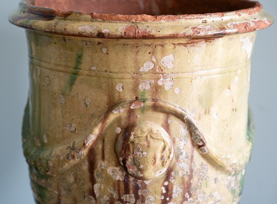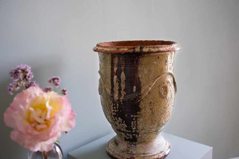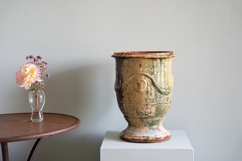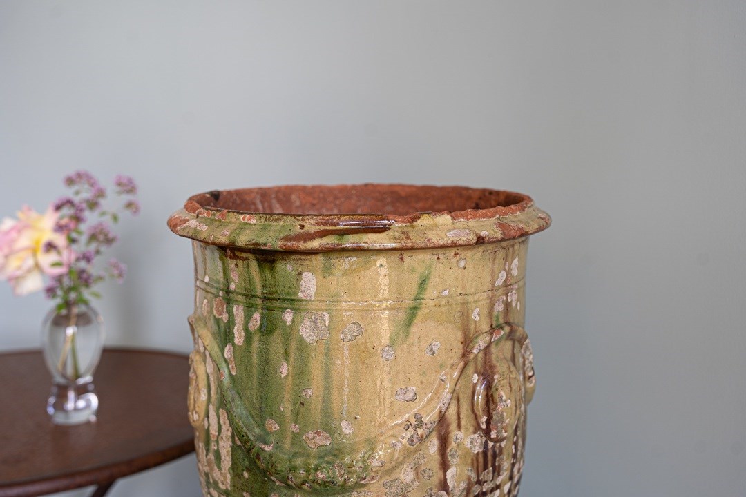 An extremely attractive decorative antique vase for the home or garden. This is from the iconic Anduze range of French antique pottery. I haven’t come across an Anduze French vase this small and it packs a small but extremely pretty punch! With colours of greens, yellow and brown hues, some of the glazing has disappeared in time, which I feel makes this antique vase more attractive with age.