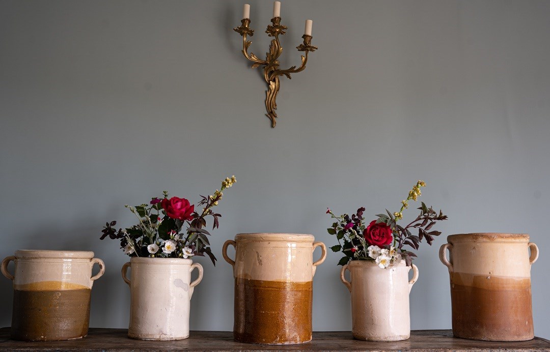 With their two-tone finish, these are a classic style of pots with their handcrafted and rounded body and twin ‘ear’ handles and characteristic indents for tying linen cloths to seal the oiled foods. Today they can be used for a wide variety of used, from decorative vases, chic kitchen accessories to standalone pieces. Due to their age and utilitarian past, do expect minor signs of wear including small chips, and glaze imperfections – each contributing to their individual character and authenticity.