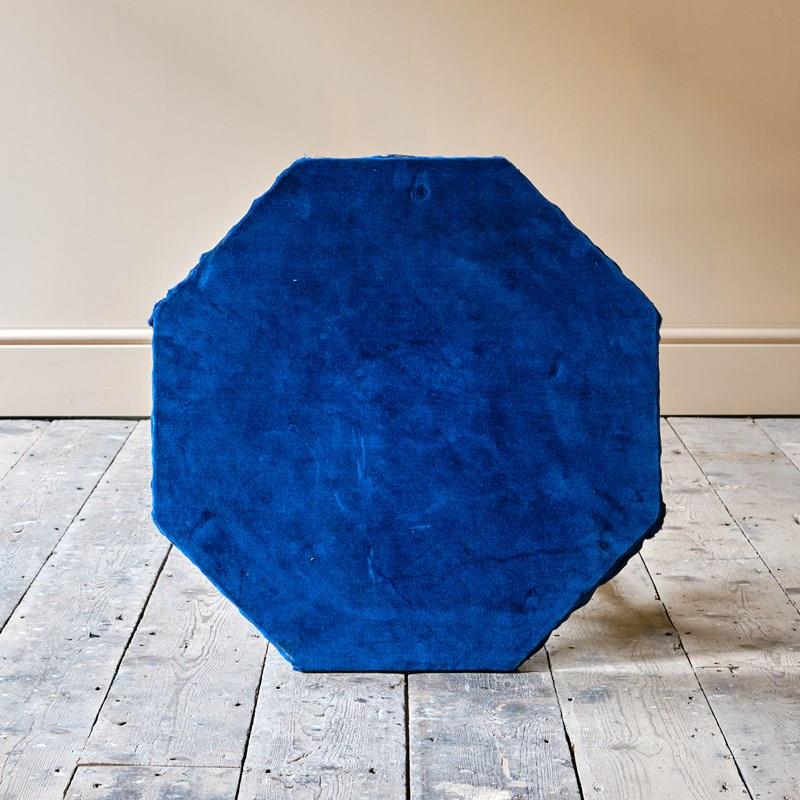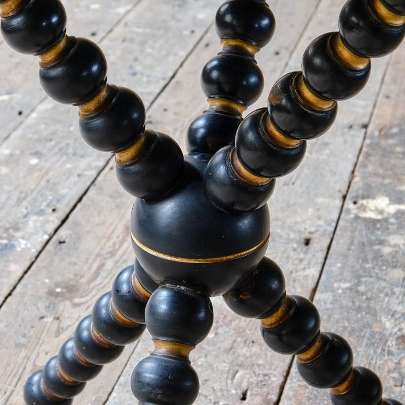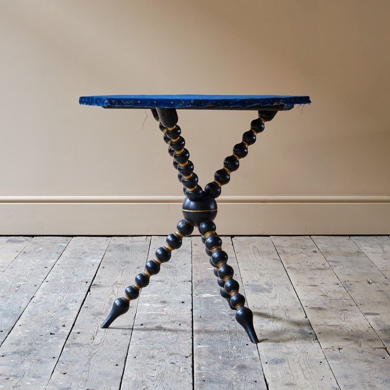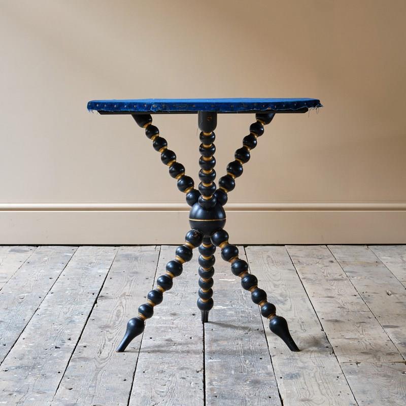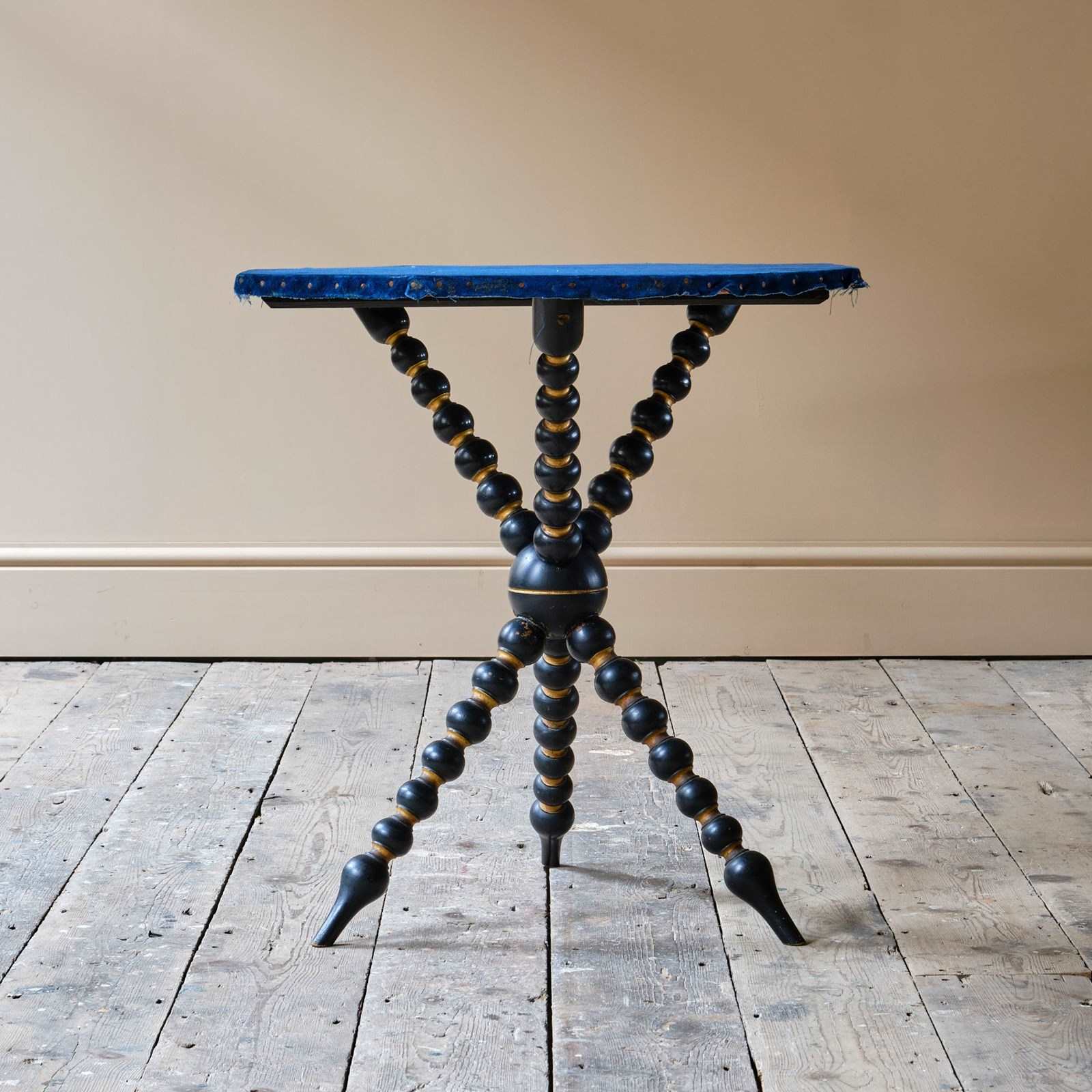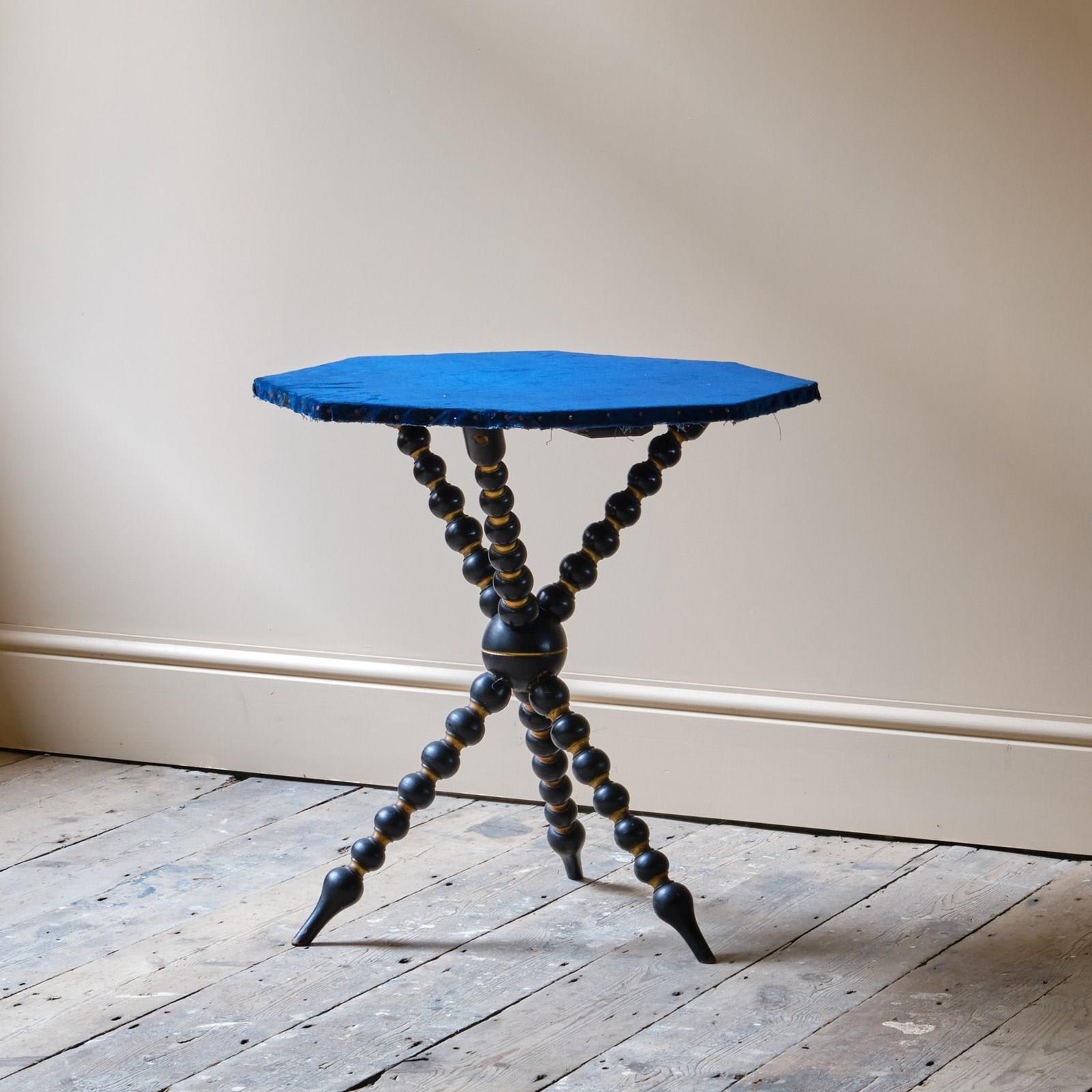 A 19th century aesthetic movement Gypsy table. The octagonal top with blue velvet raised on ebonized and gilt bobbin turned legs and supports. C1870