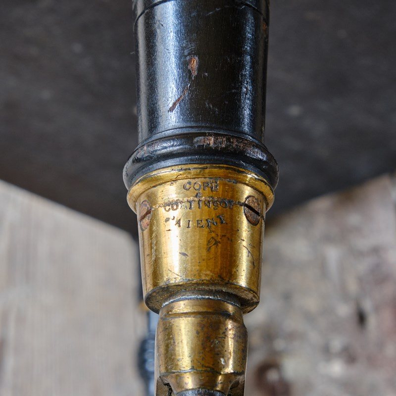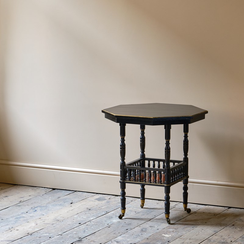 A good quality English Aesthetic Movement side table Attributed to Gillows. The ebonized and gilt octagonal top above a lower shelf with turned spindles and Amboyna and inlaid banding. The whole raised on turned supports and the original Cope & Collinson brass casters. The underside of the top stamped L5669
