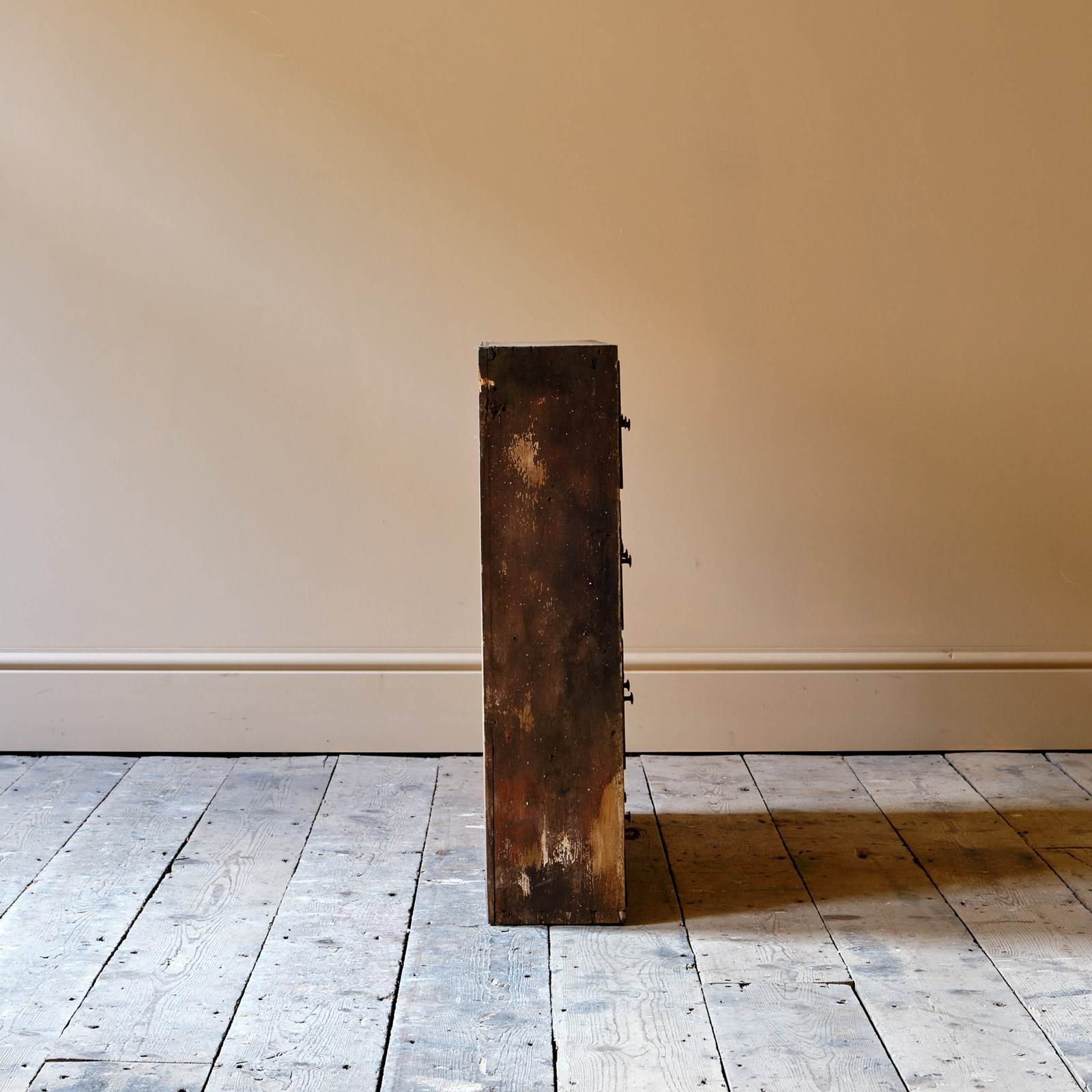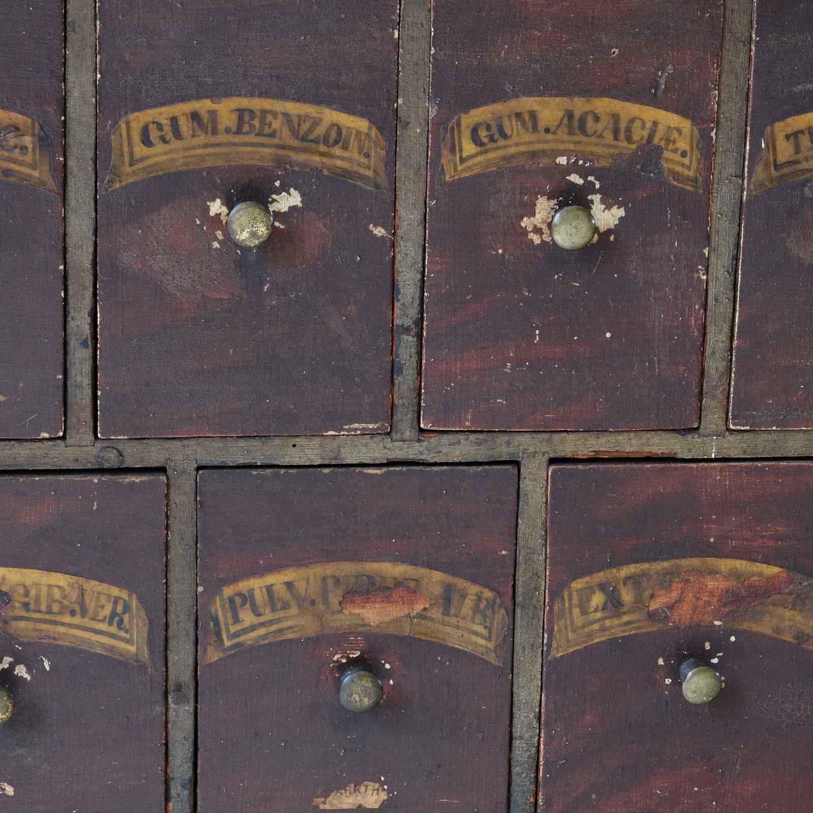 19th century bank of apothecary drawers. 30 individual drawers featuring original handles and hand painted Latin names.