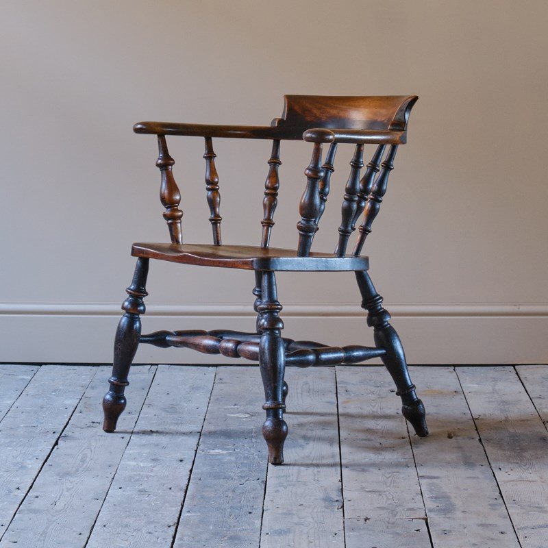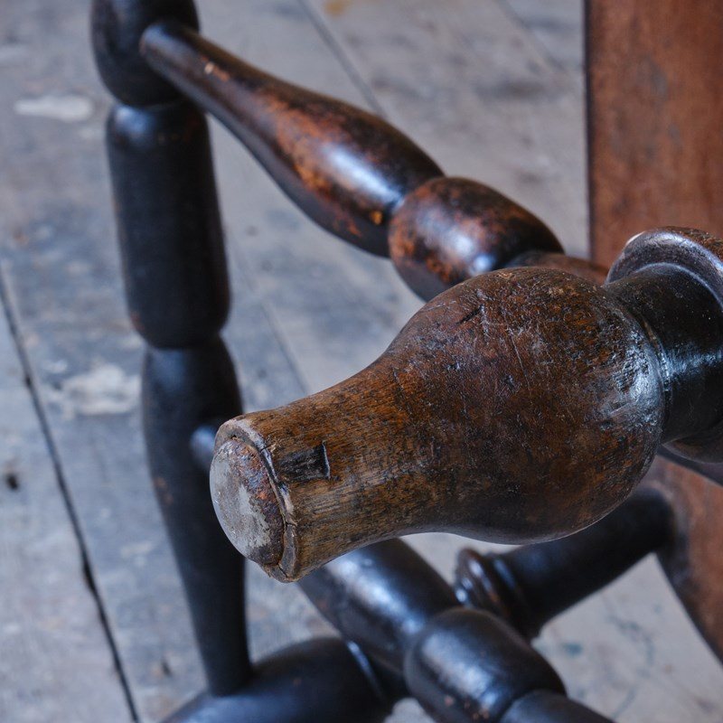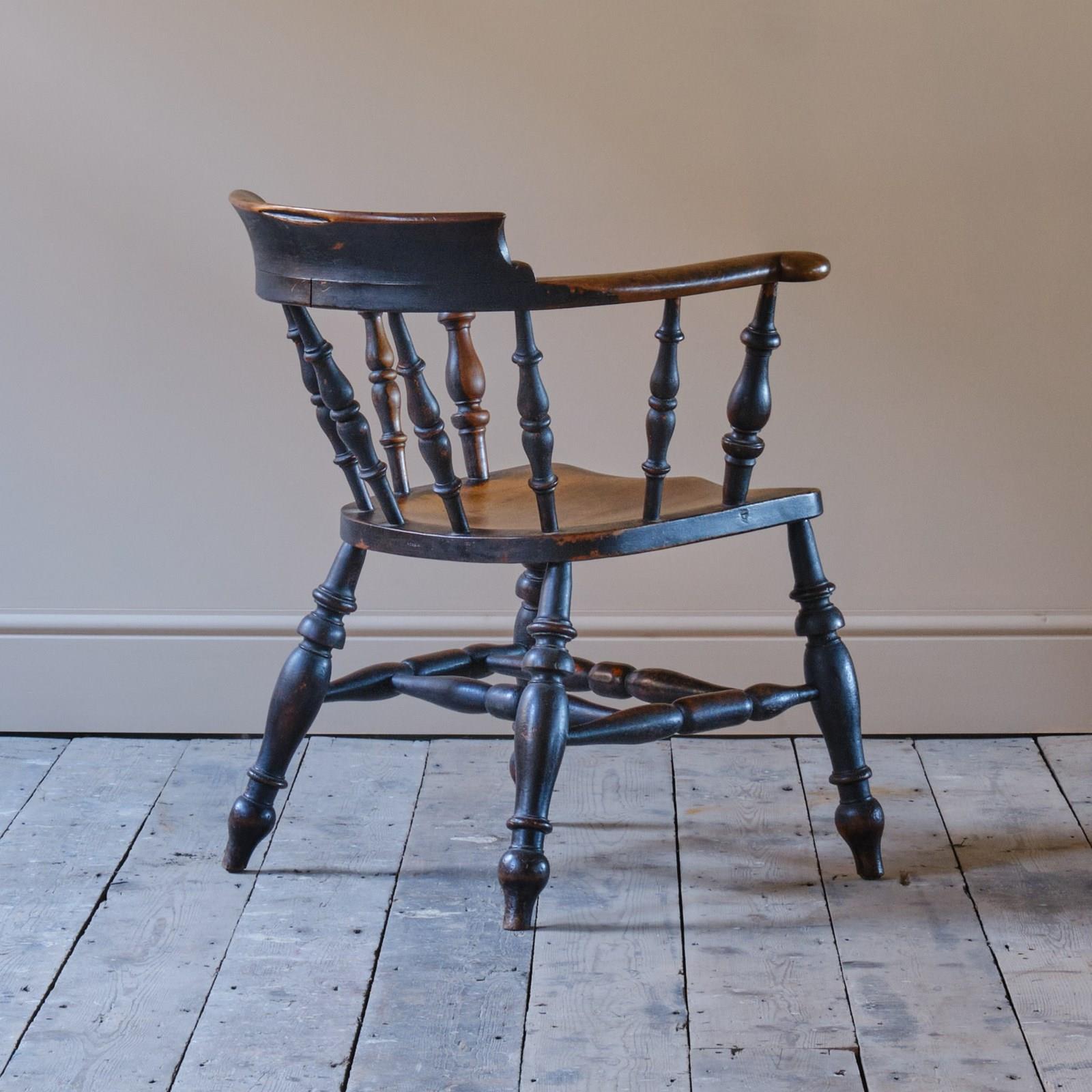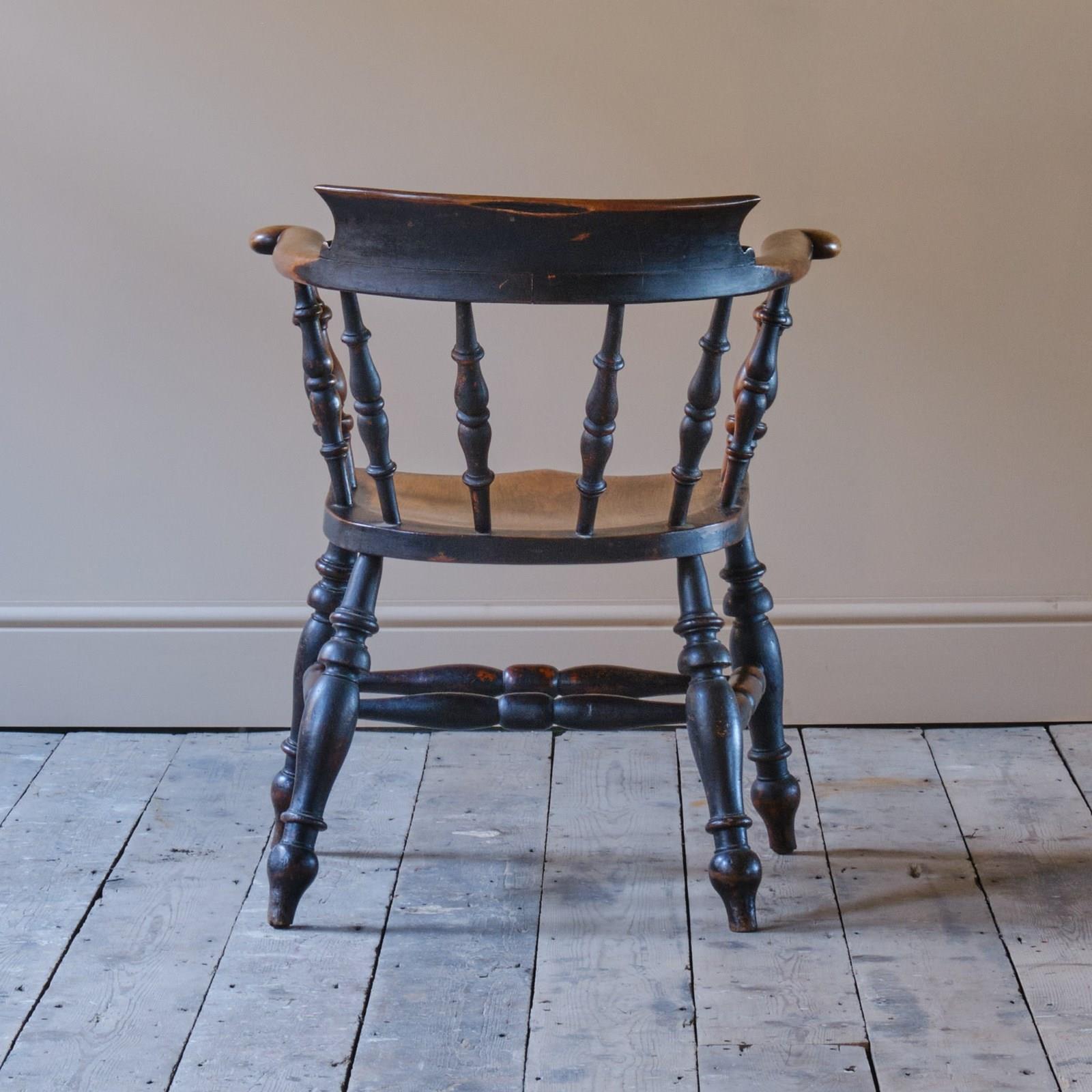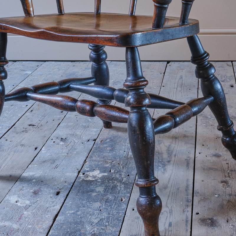 A 19th century ash and elm Windsor chair in its original crusty paint perfectly worn to reveal the timbers below. In very good original untouched condition. Bearing the makers stamp to the rear of the seat.