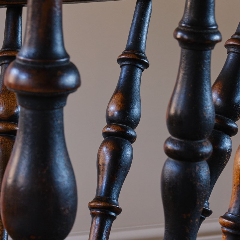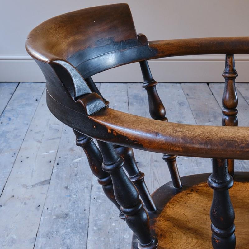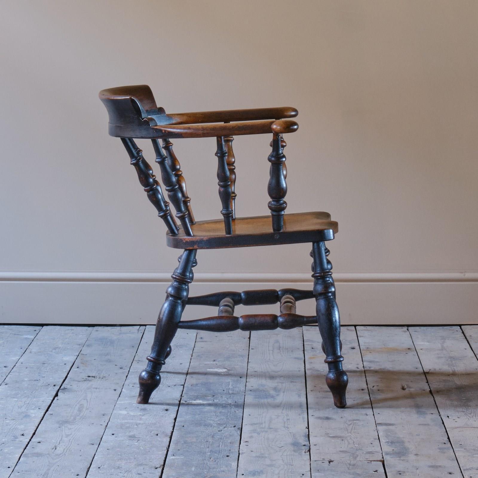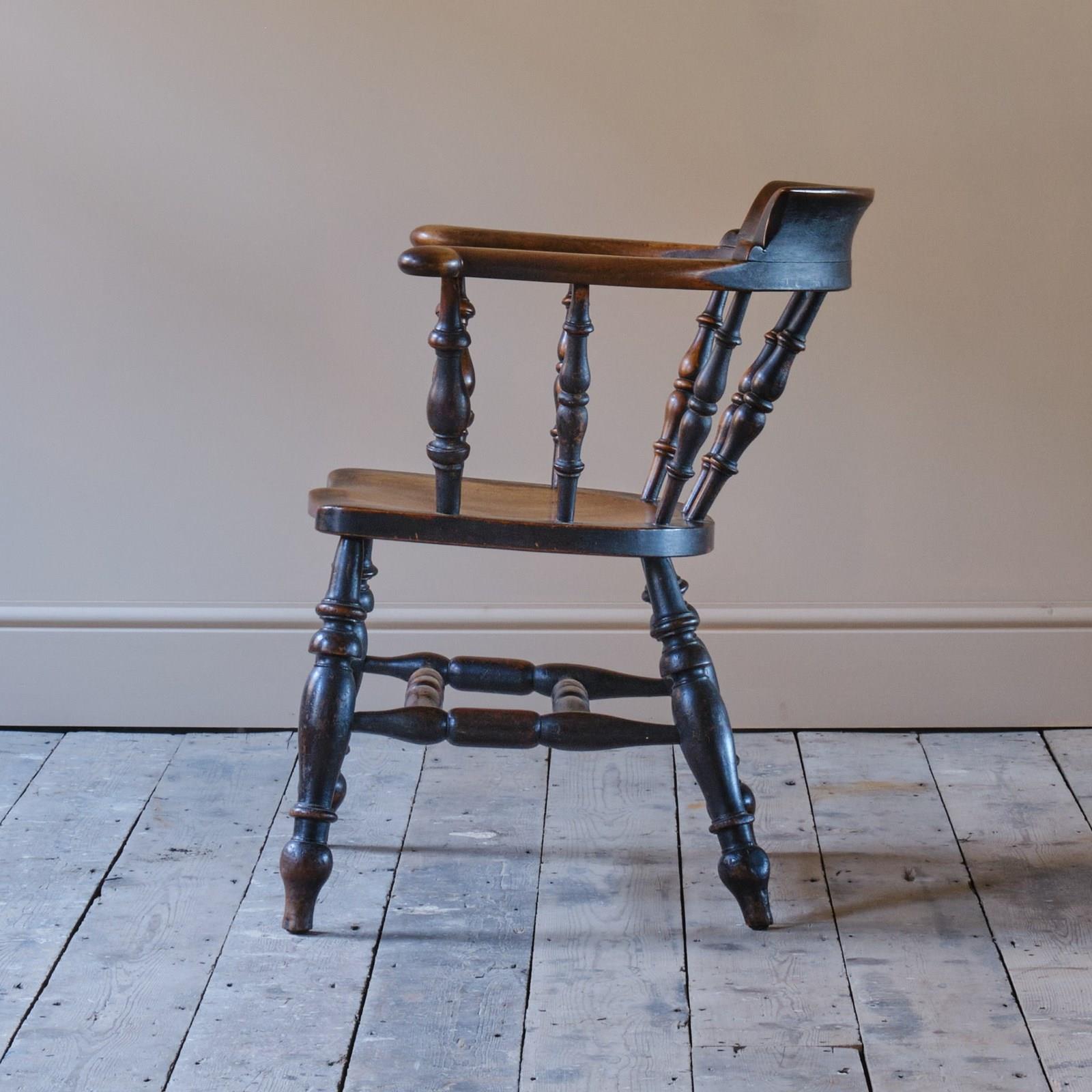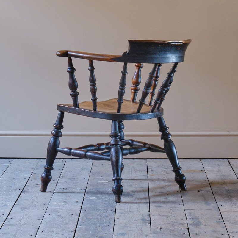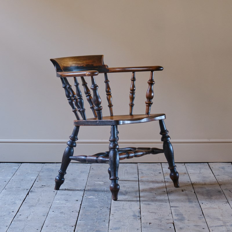 A 19th century ash and elm Windsor chair in its original crusty paint perfectly worn to reveal the timbers below. In very good original untouched condition. Bearing the makers stamp to the rear of the seat.