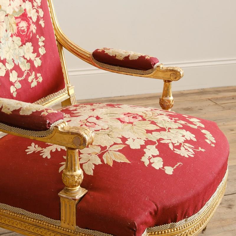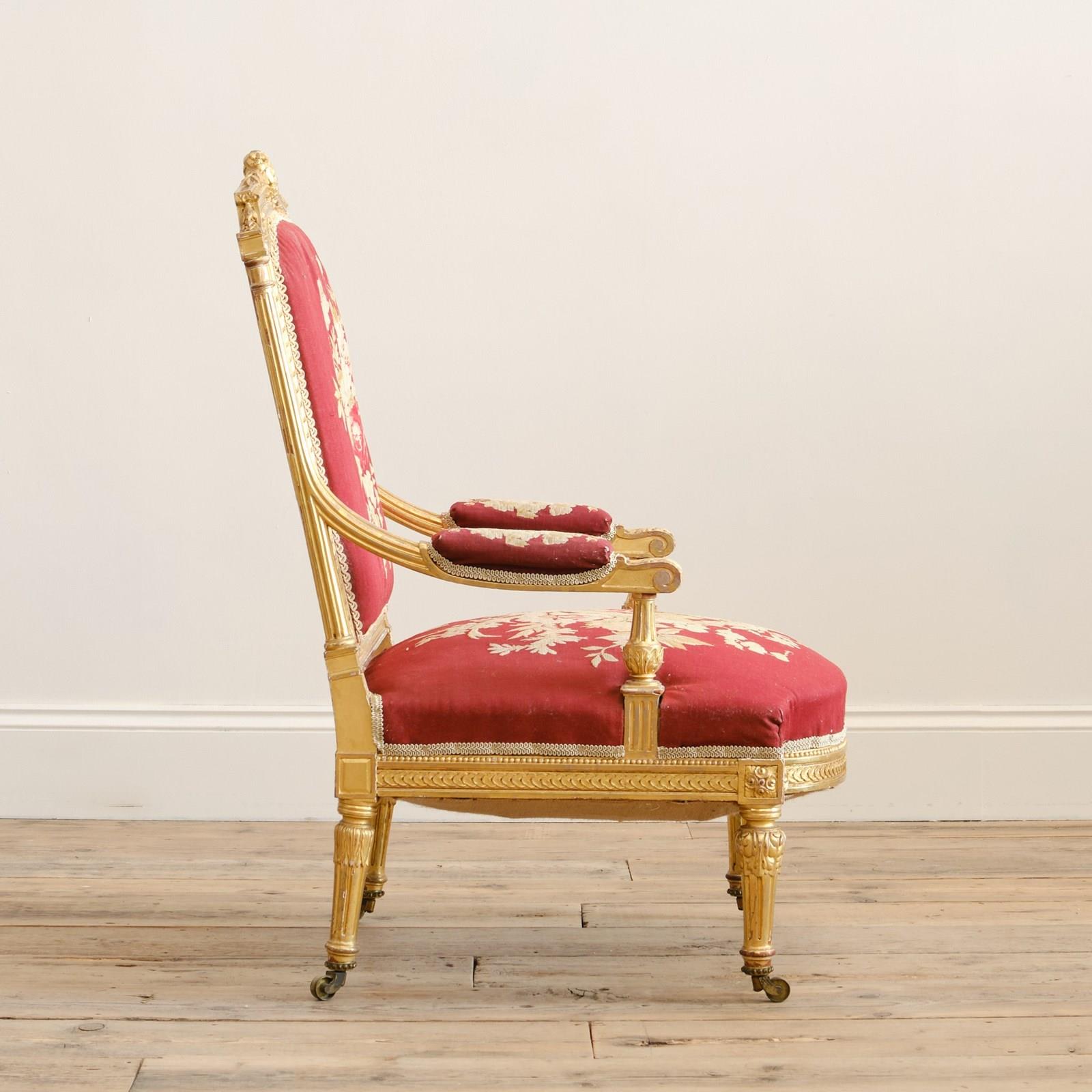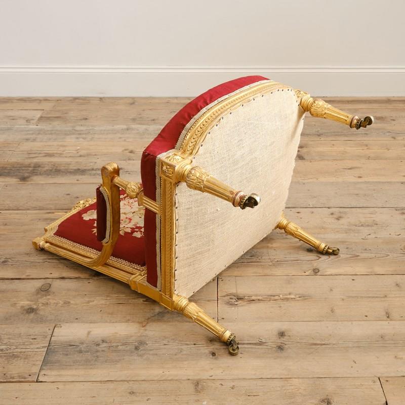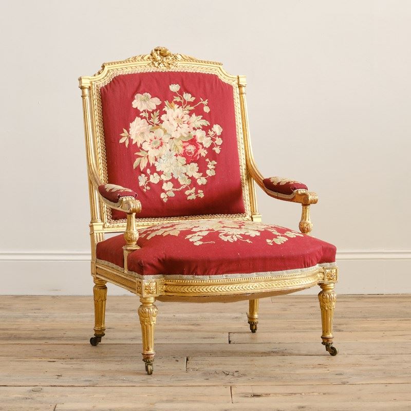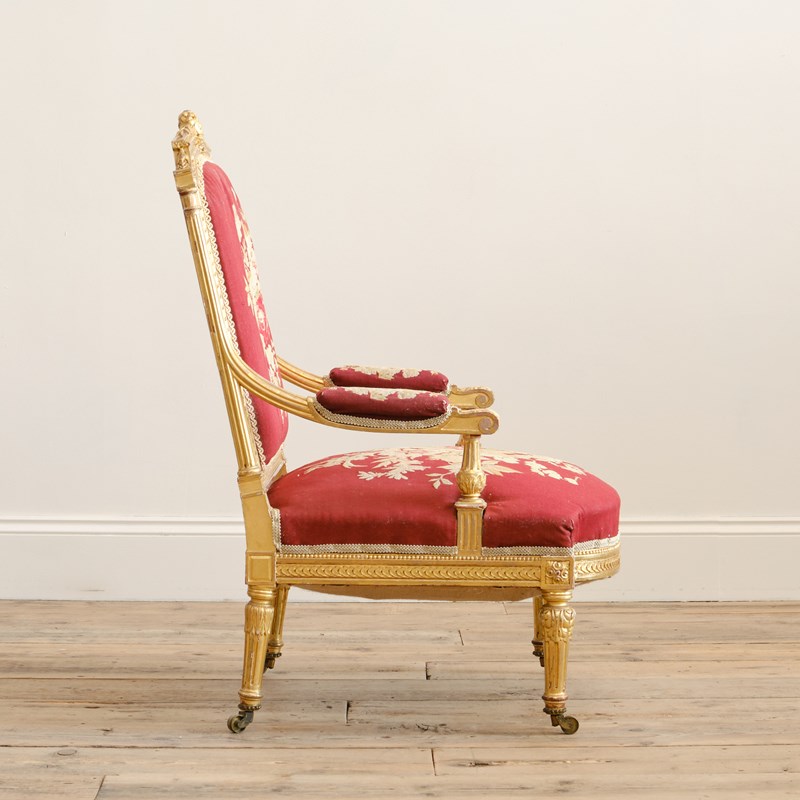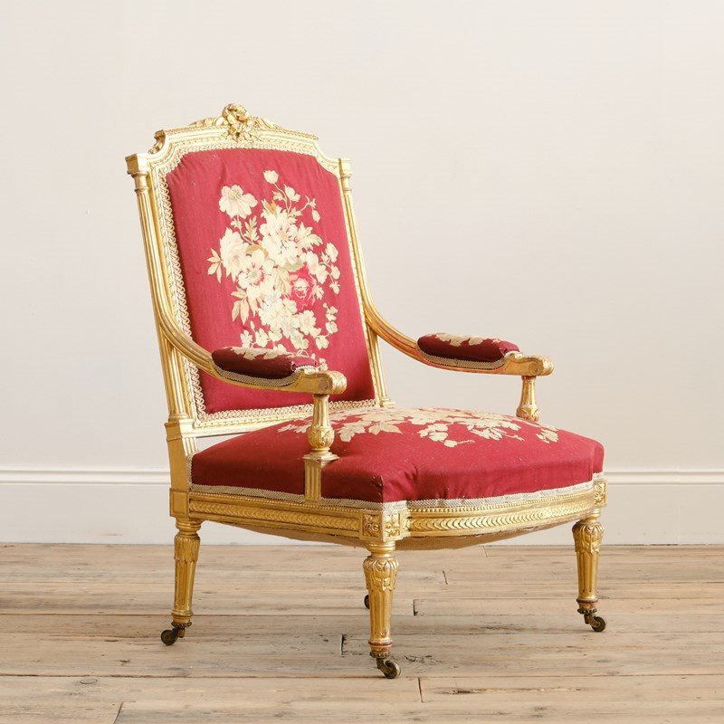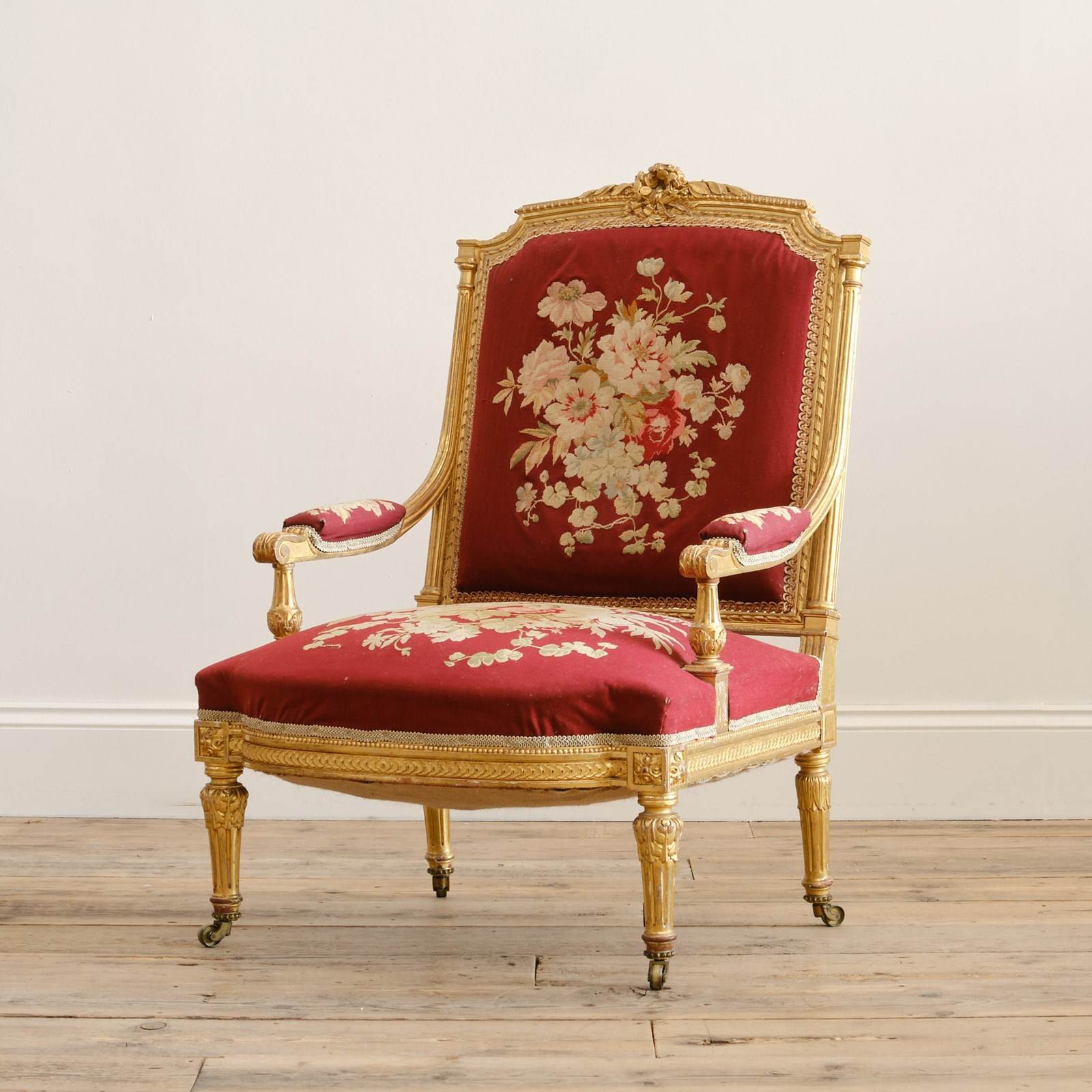 A Wonderful 19th century carved giltwood armchair. The carved gilt frame draped in its original needle work fabric and retaining the original Copes casters. Unstamped but almost certainly by Holland & Sons.
