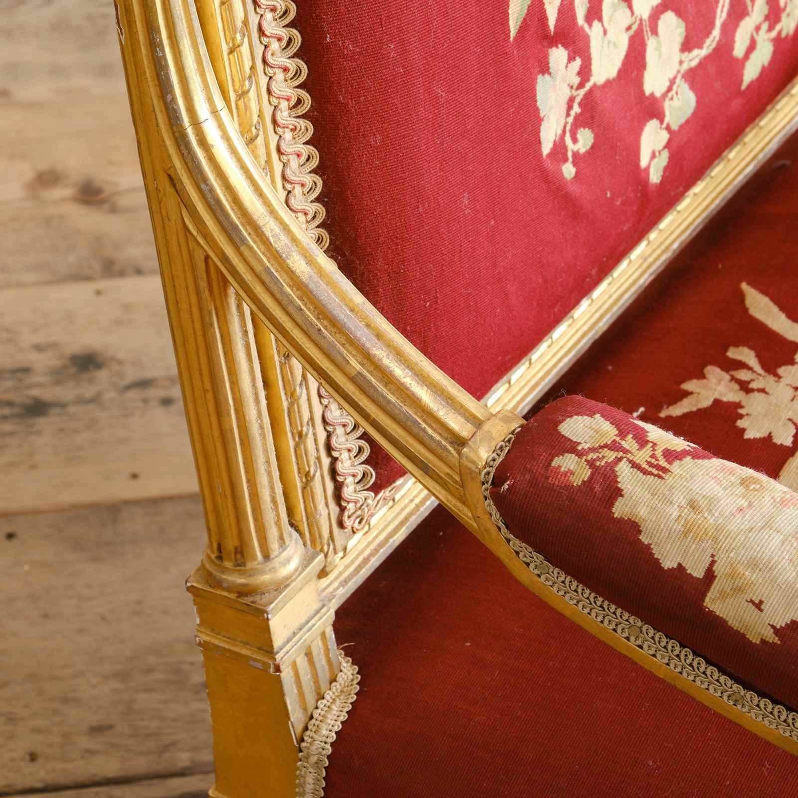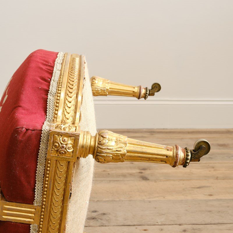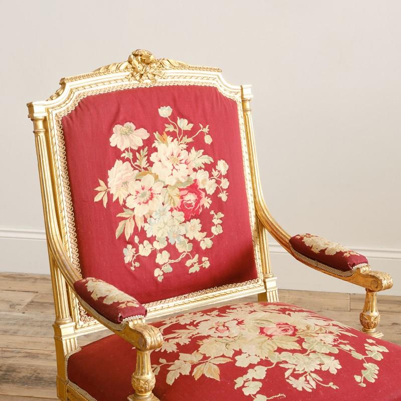 Structurally sound with various chips and ware to the gilt and some wear to the fabric.