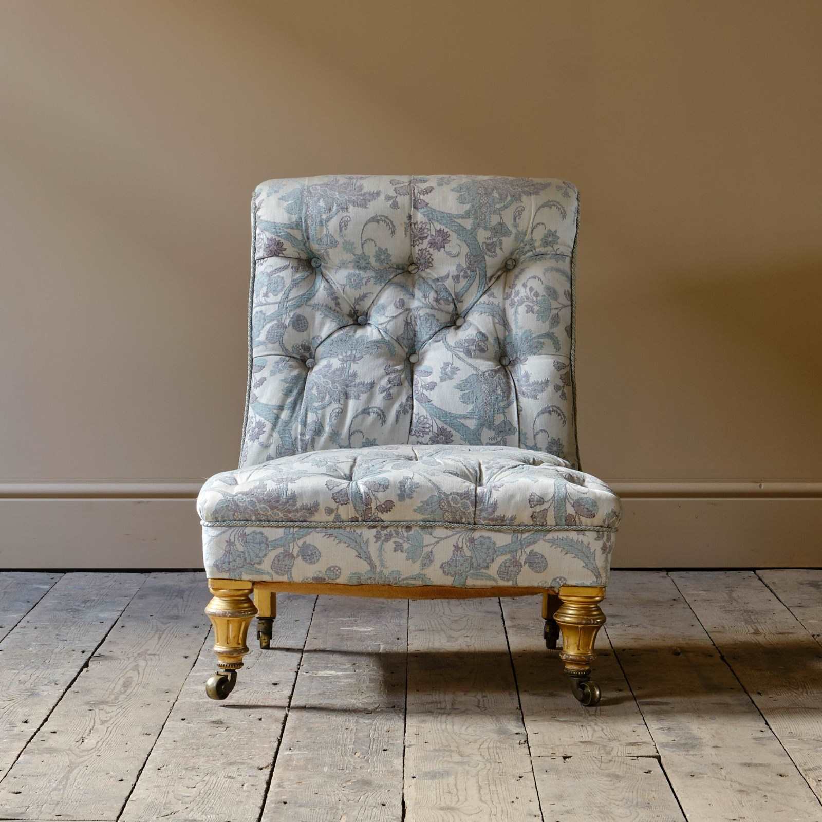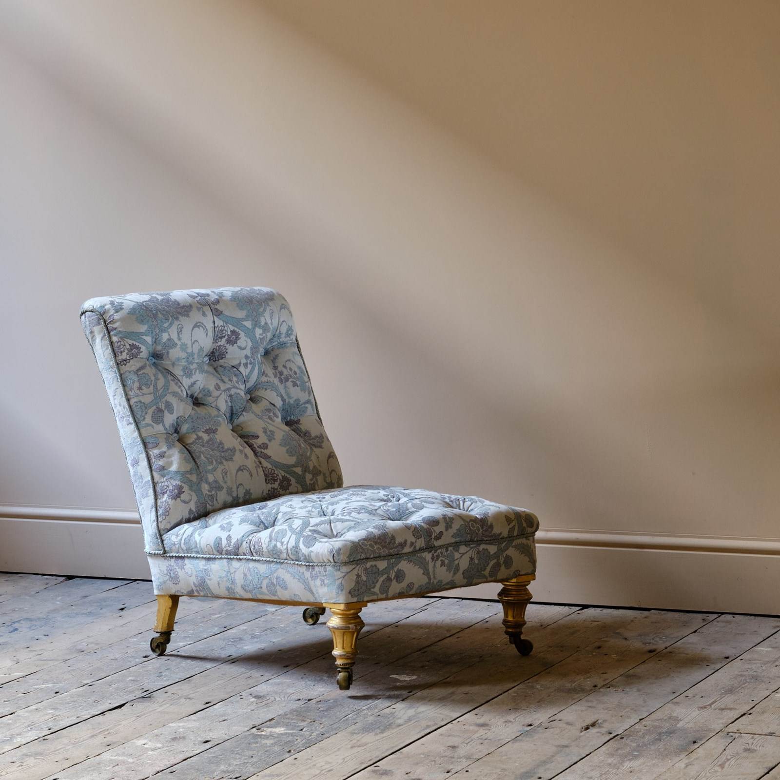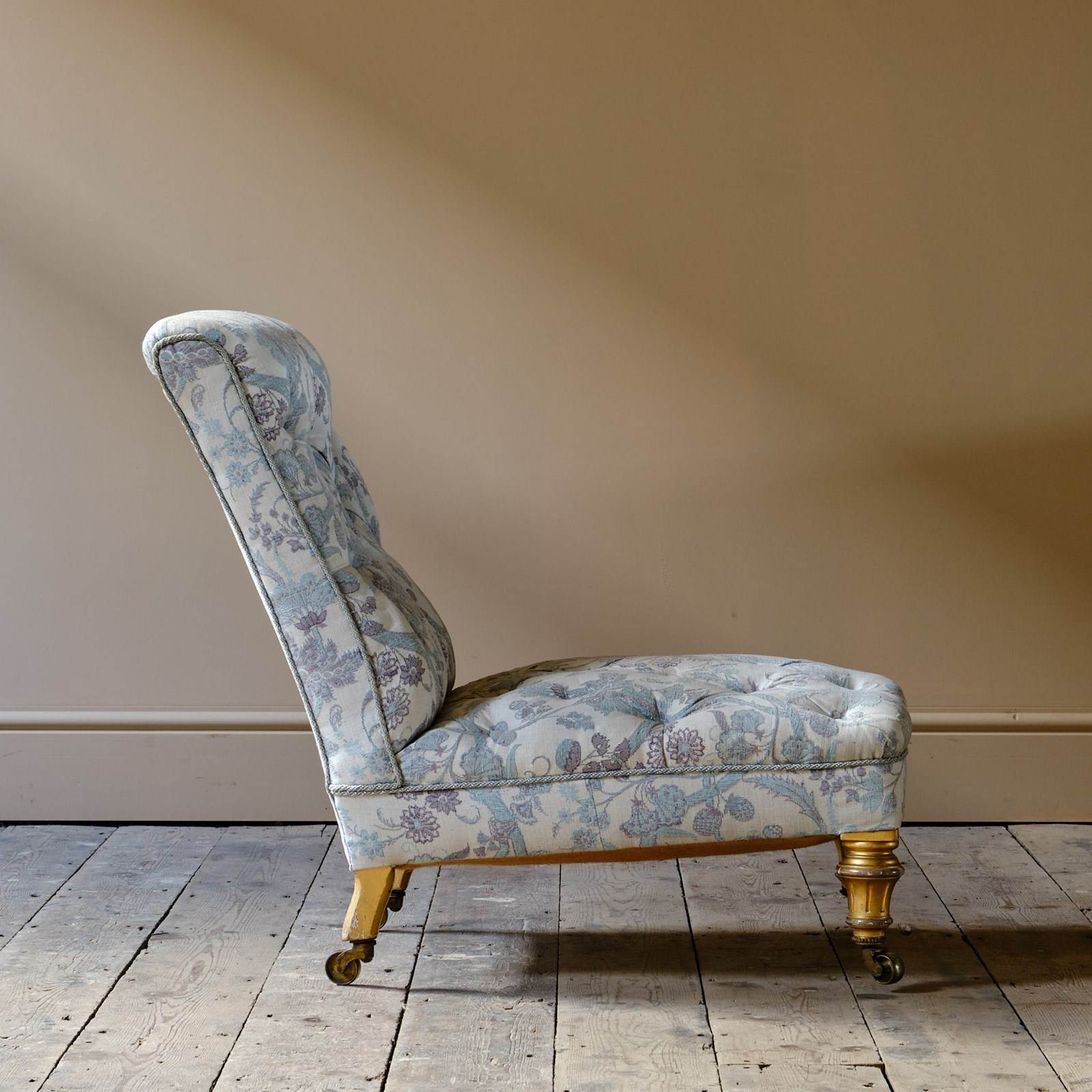 A good quality low and seep seated country house slipper chair. Raised on gilt walnut legs and the original brass casters.