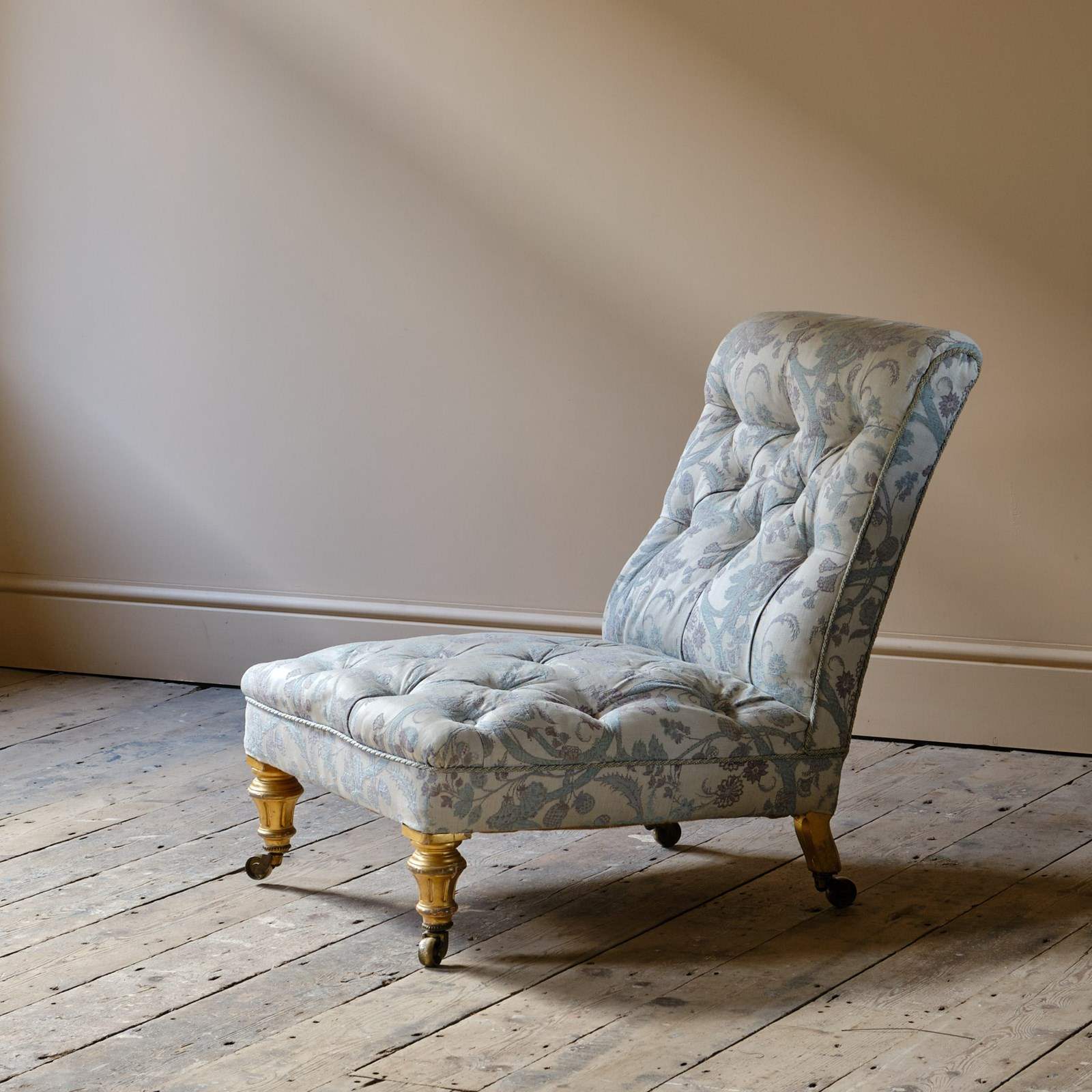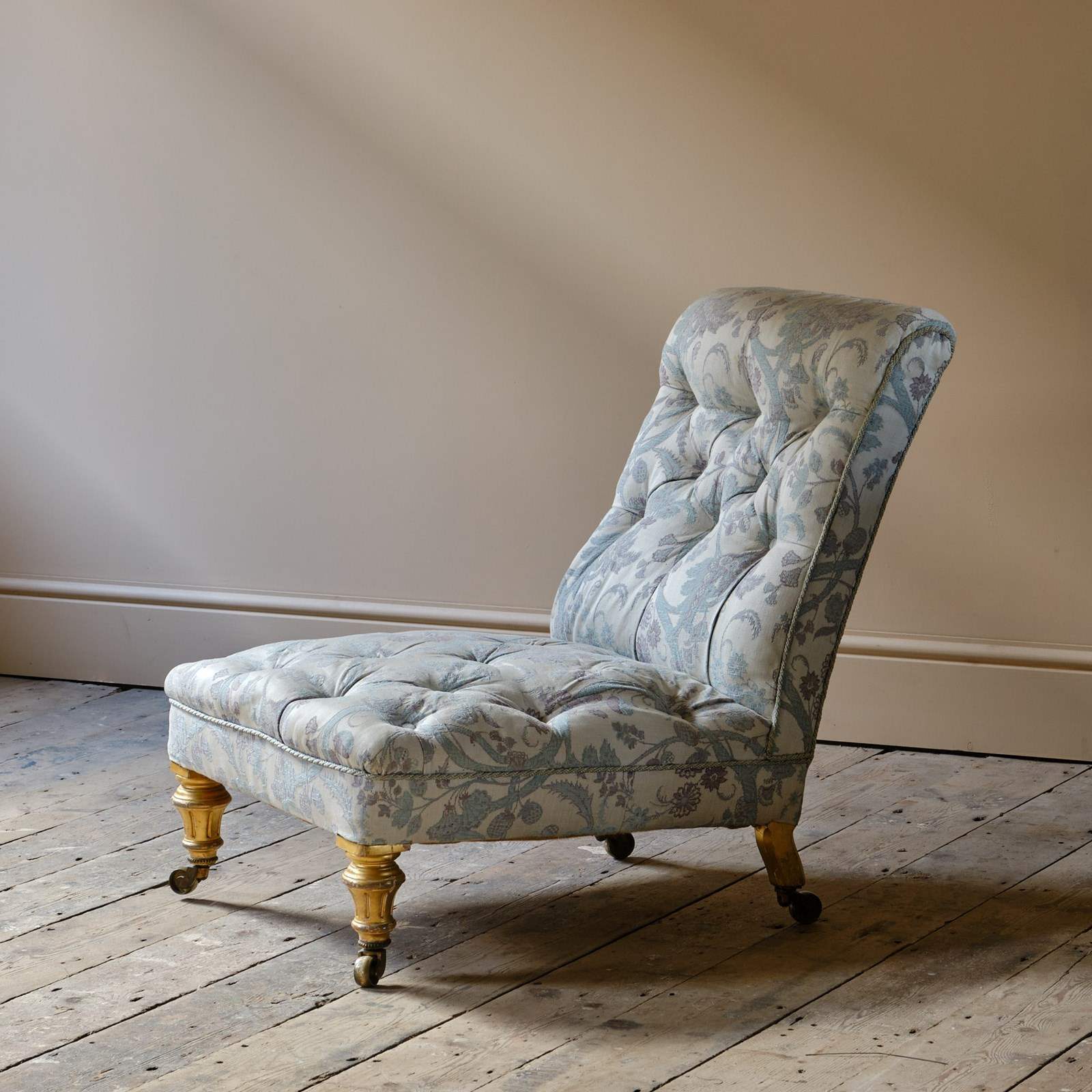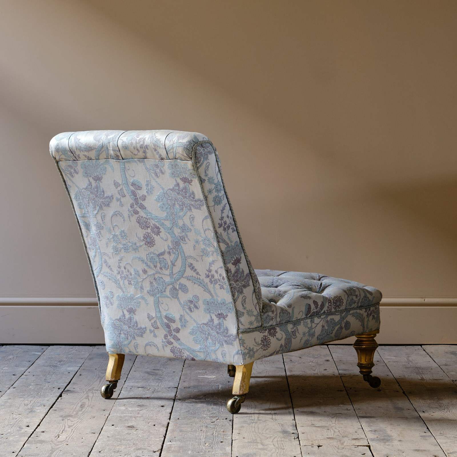 A good quality low and seep seated country house slipper chair. Raised on gilt walnut legs and the original brass casters.